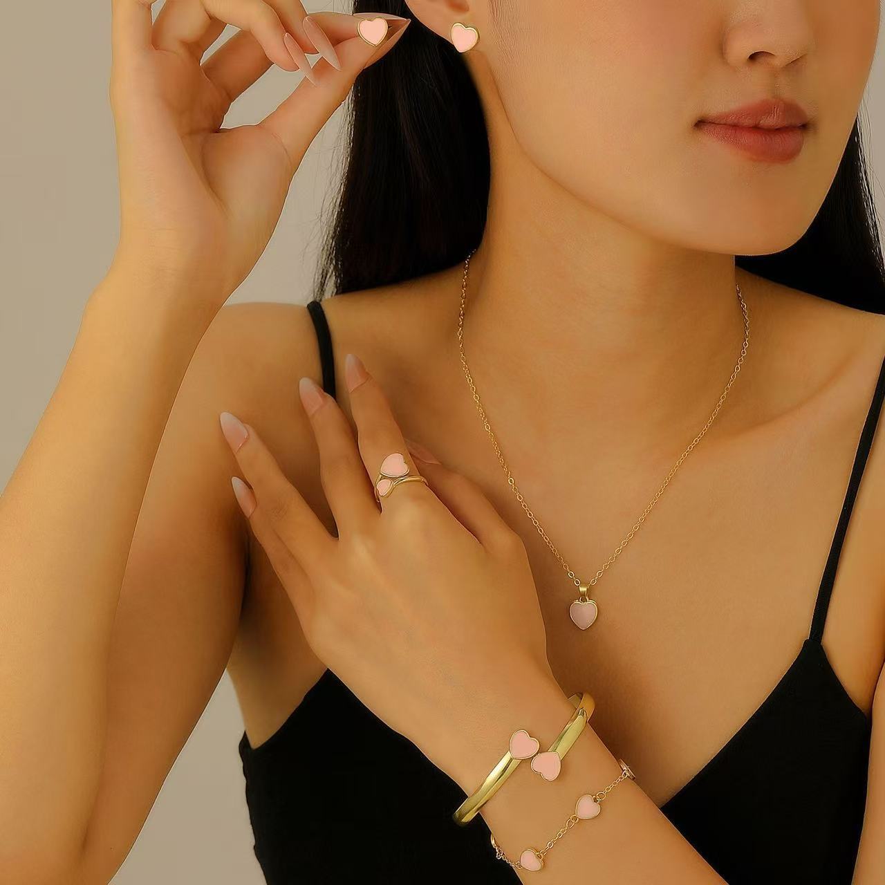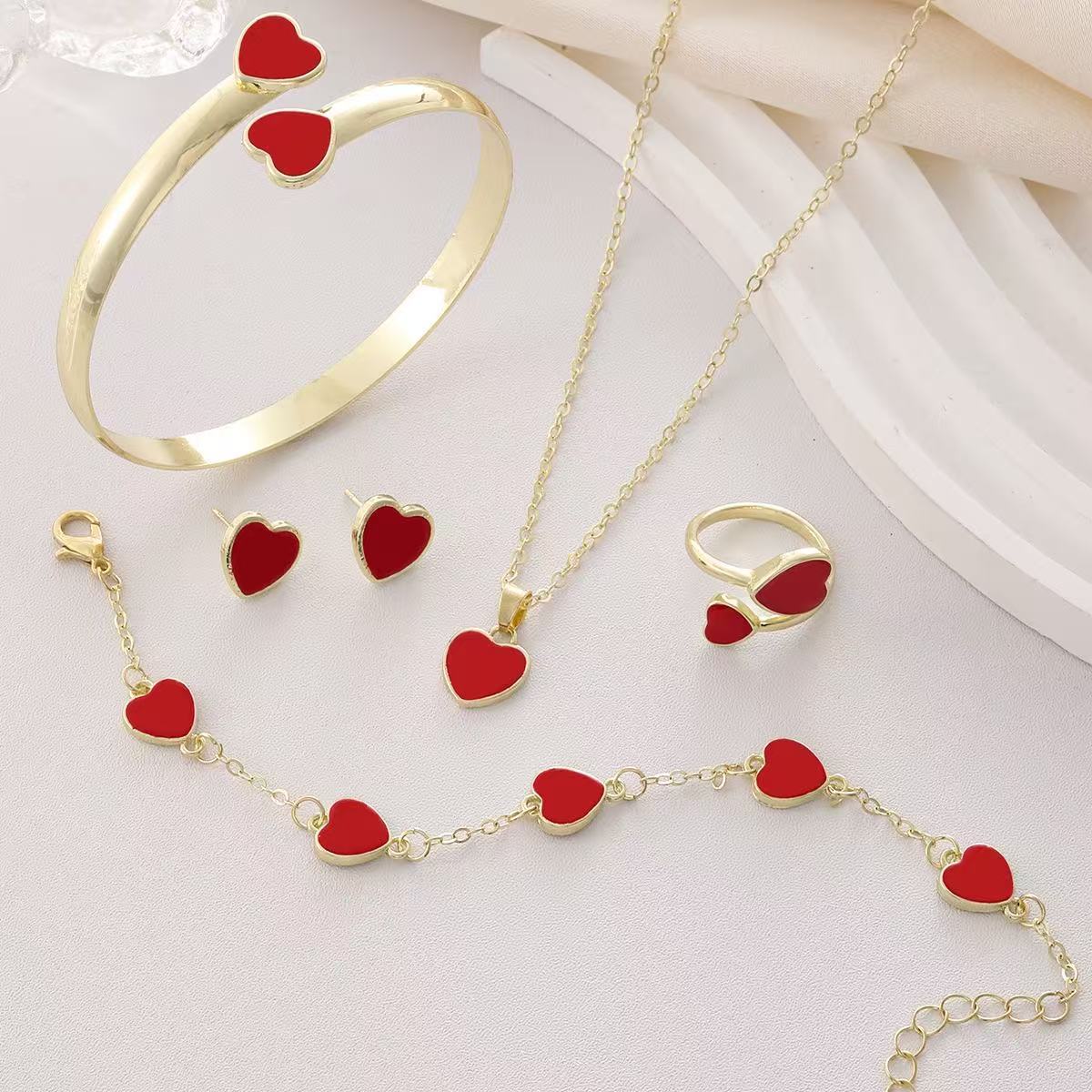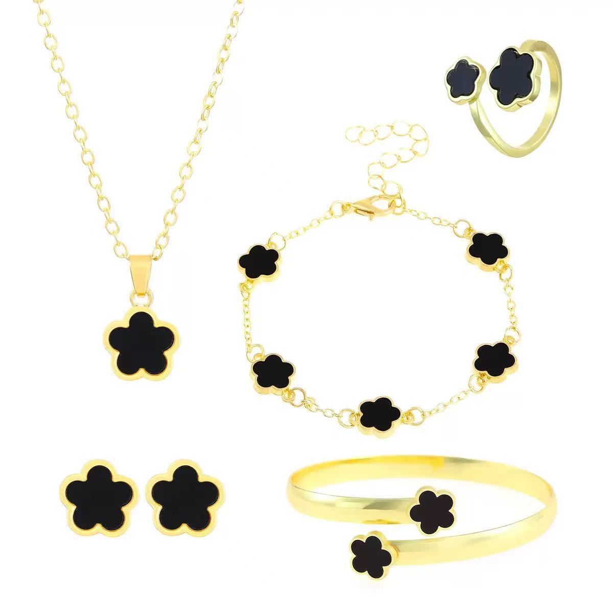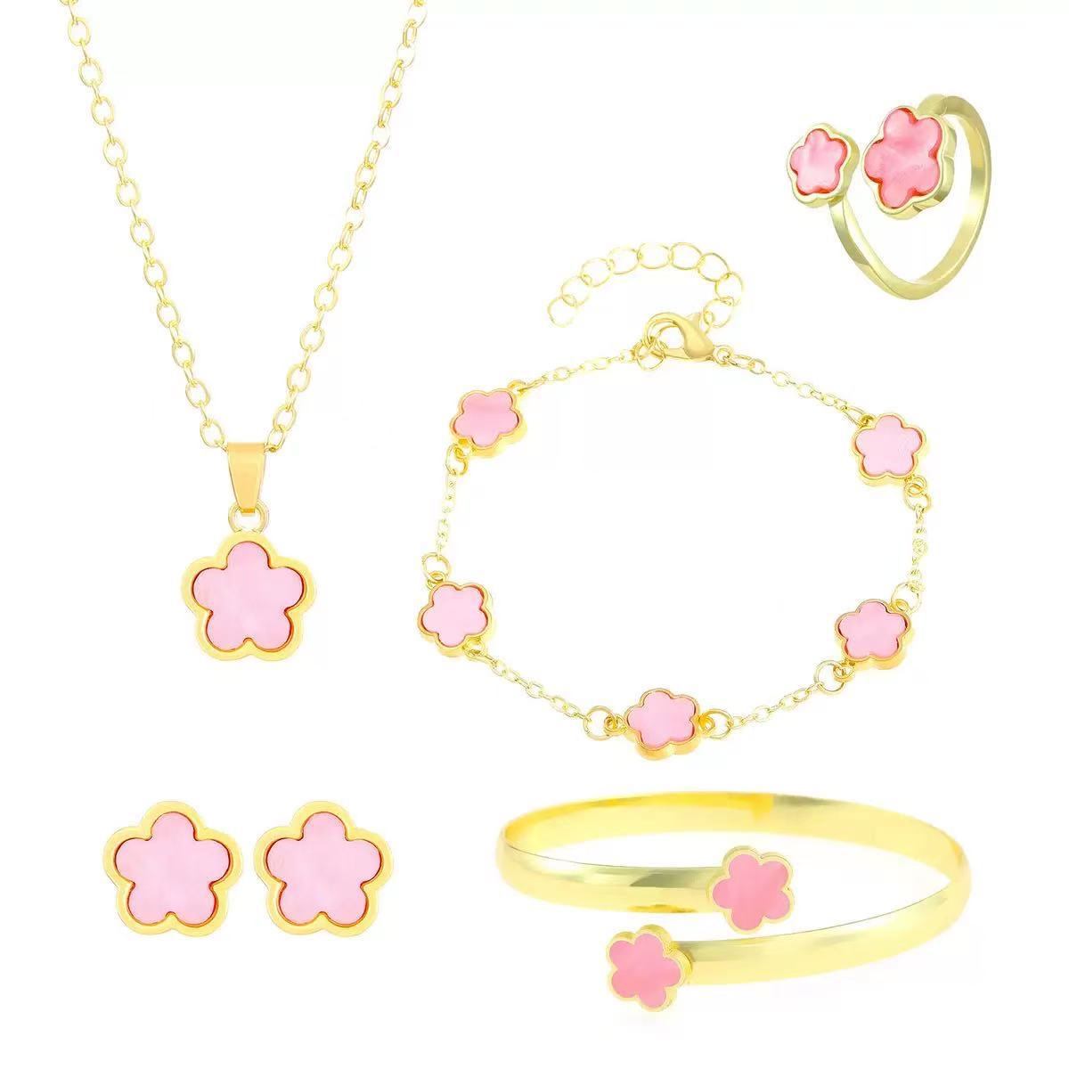 Ventas Calientes Transfronterizas Flor de Cinco Pétalos Amor Goteando Aceite Collar de Mujer Pulsera Anillo Aretes Pulsera Juego de Cinco Piezas Accesorios