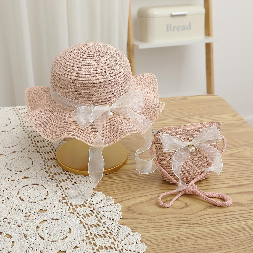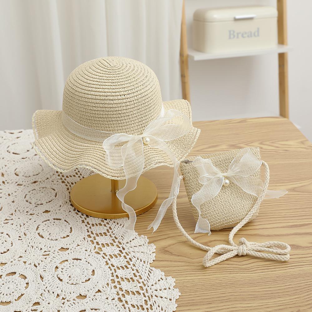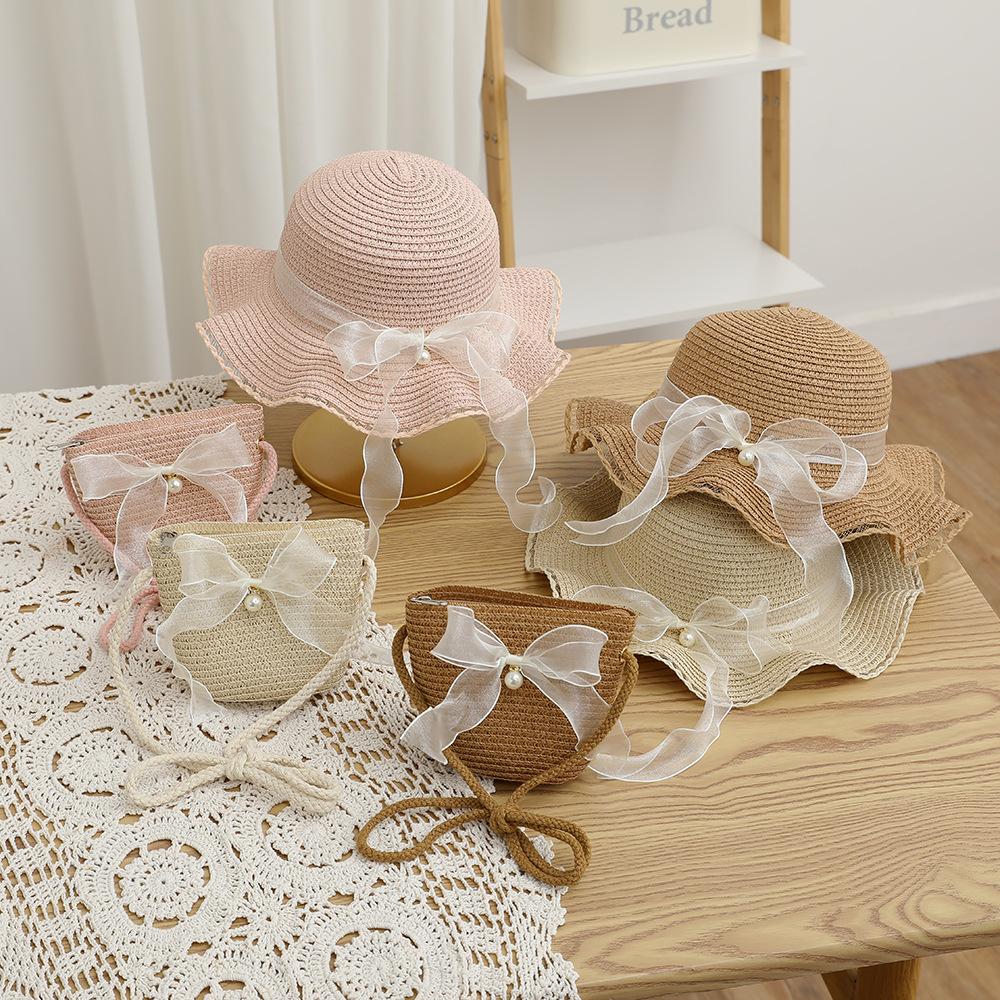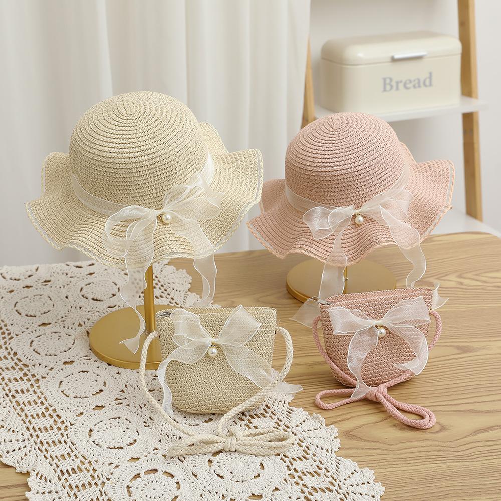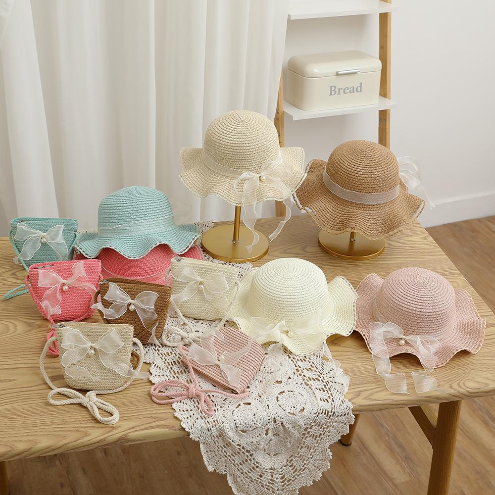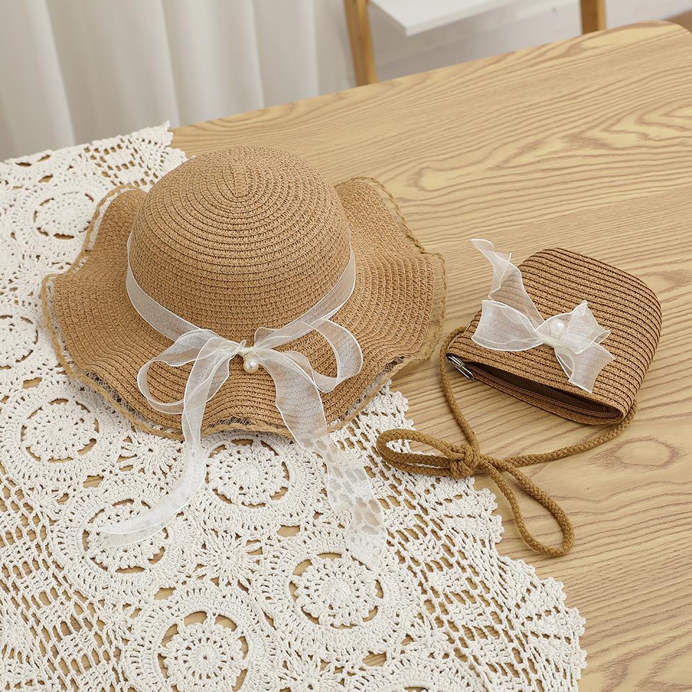 Sombrero de Paja de Verano para Niños Encaje Ondulado Sombrero de Paja Bolsa Set de Dos Piezas Estilo Extranjero Lindo Flor Sombrero para el Sol Protección Solar
