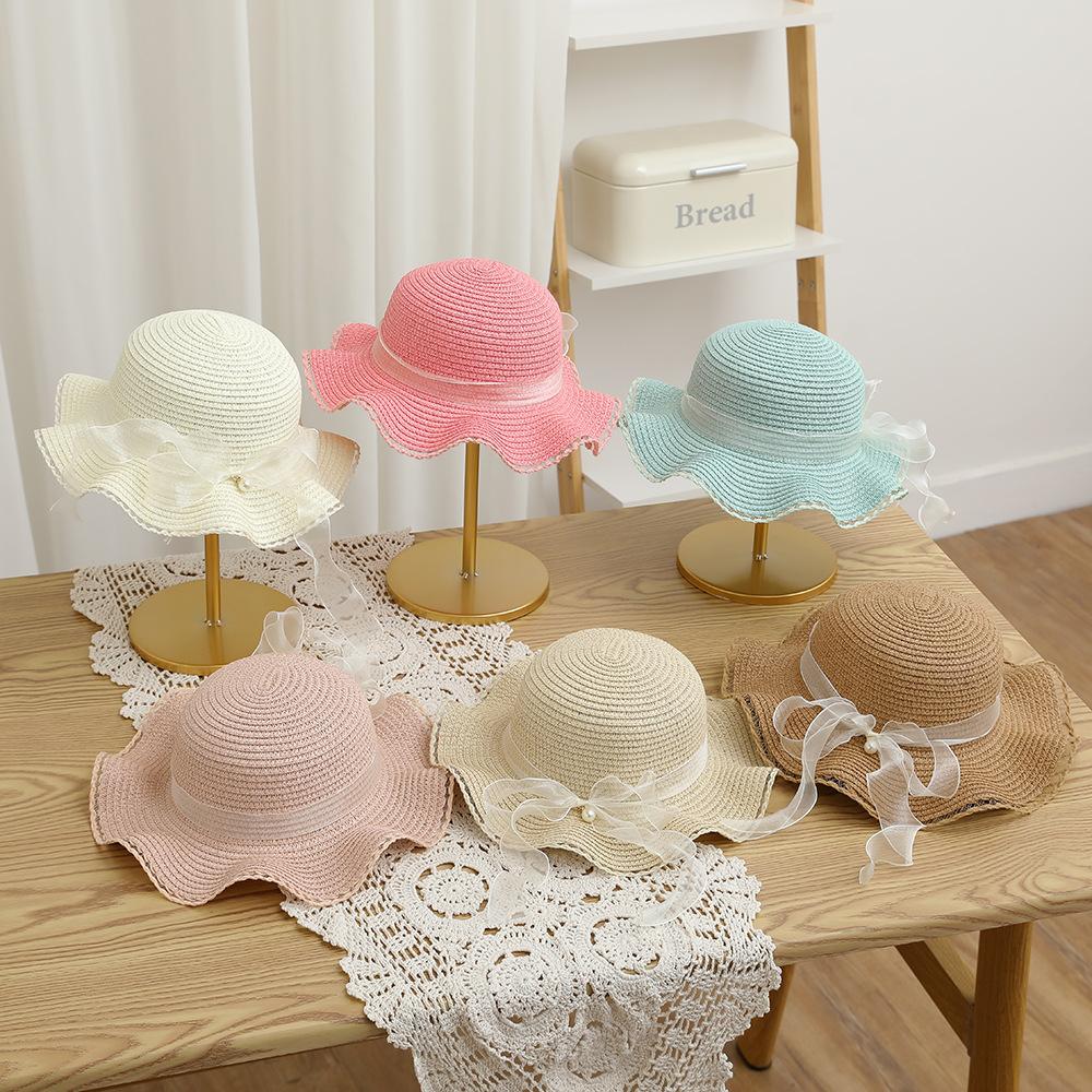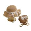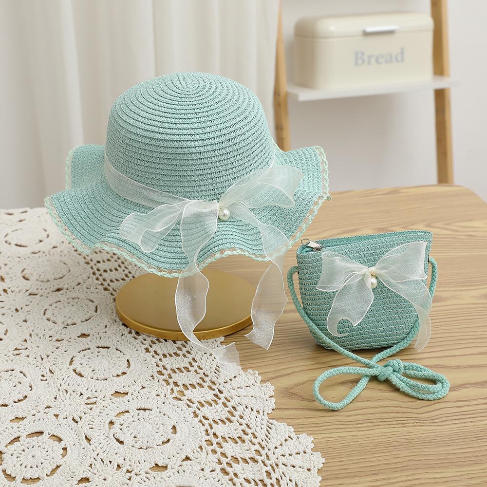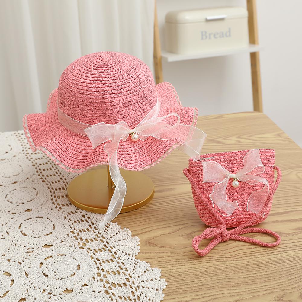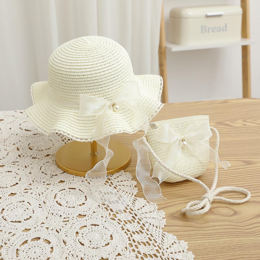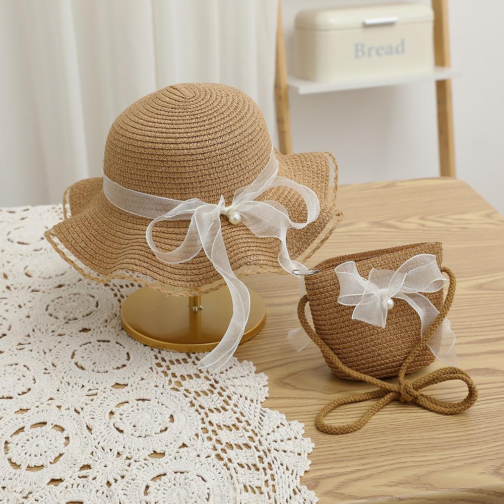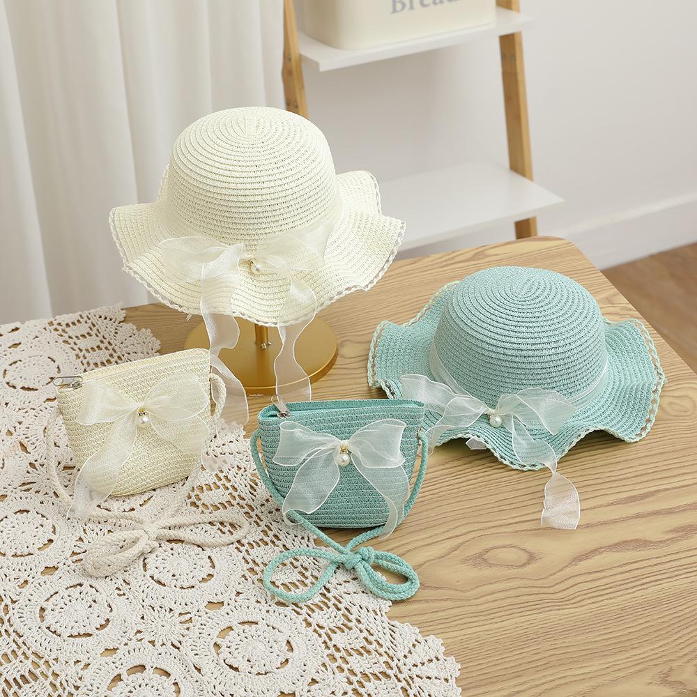 Sombrero de Paja de Verano para Niños Encaje Ondulado Sombrero de Paja Bolsa Set de Dos Piezas Estilo Extranjero Lindo Flor Sombrero para el Sol Protección Solar