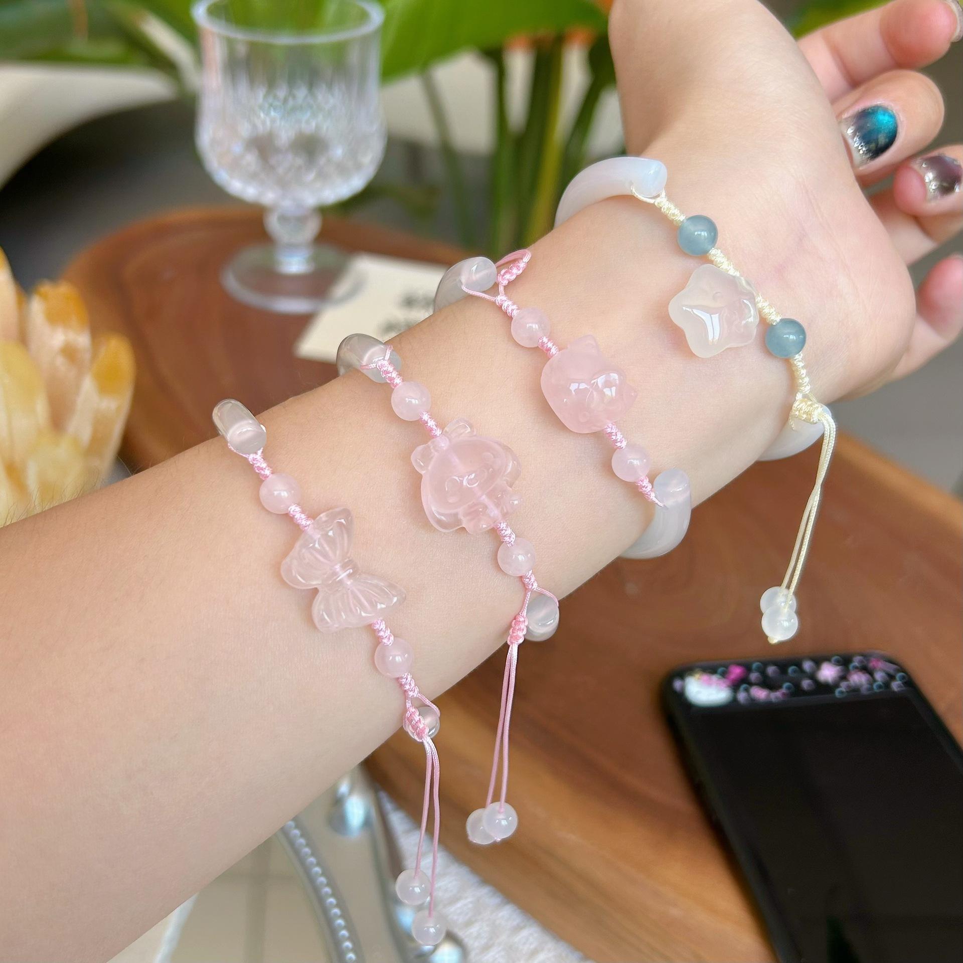 Pink crystal cinnamon dog, Pink crystal bow, Pink crystal rose, Agate labub, White butterfly shell star moon, ...