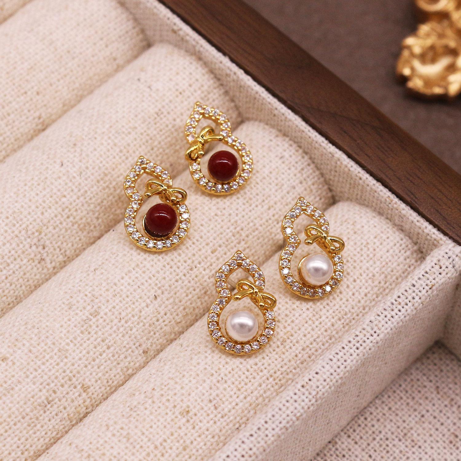 Nuevos Pendientes de Zircón de Perla de Calabaza de Estilo Chino para Mujer Pendientes Retro de Moda de Lujo Ligero de Alta Gama Pendientes Exquisitos para Combinar con Todo
