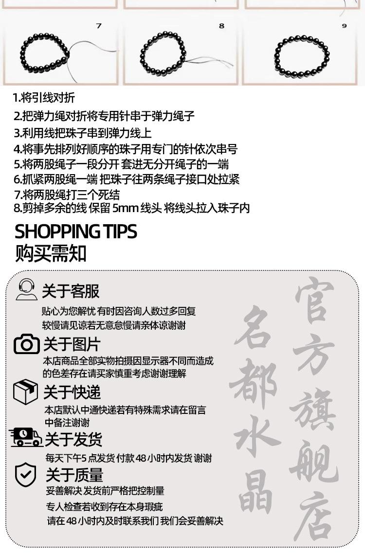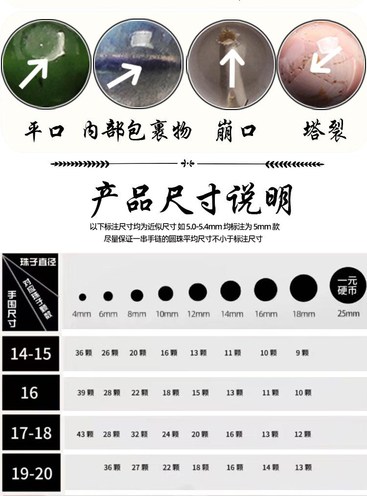 El producto puede presentar restos de algodón, grietas por hielo, defectos minerales, manchas negras, revistas, etc., así como otros defectos causados por factores humanos durante el pulido. Algunas cuentas de la pulsera pueden presentar ligeras diferencias de tamaño. Por favor, comprenda.