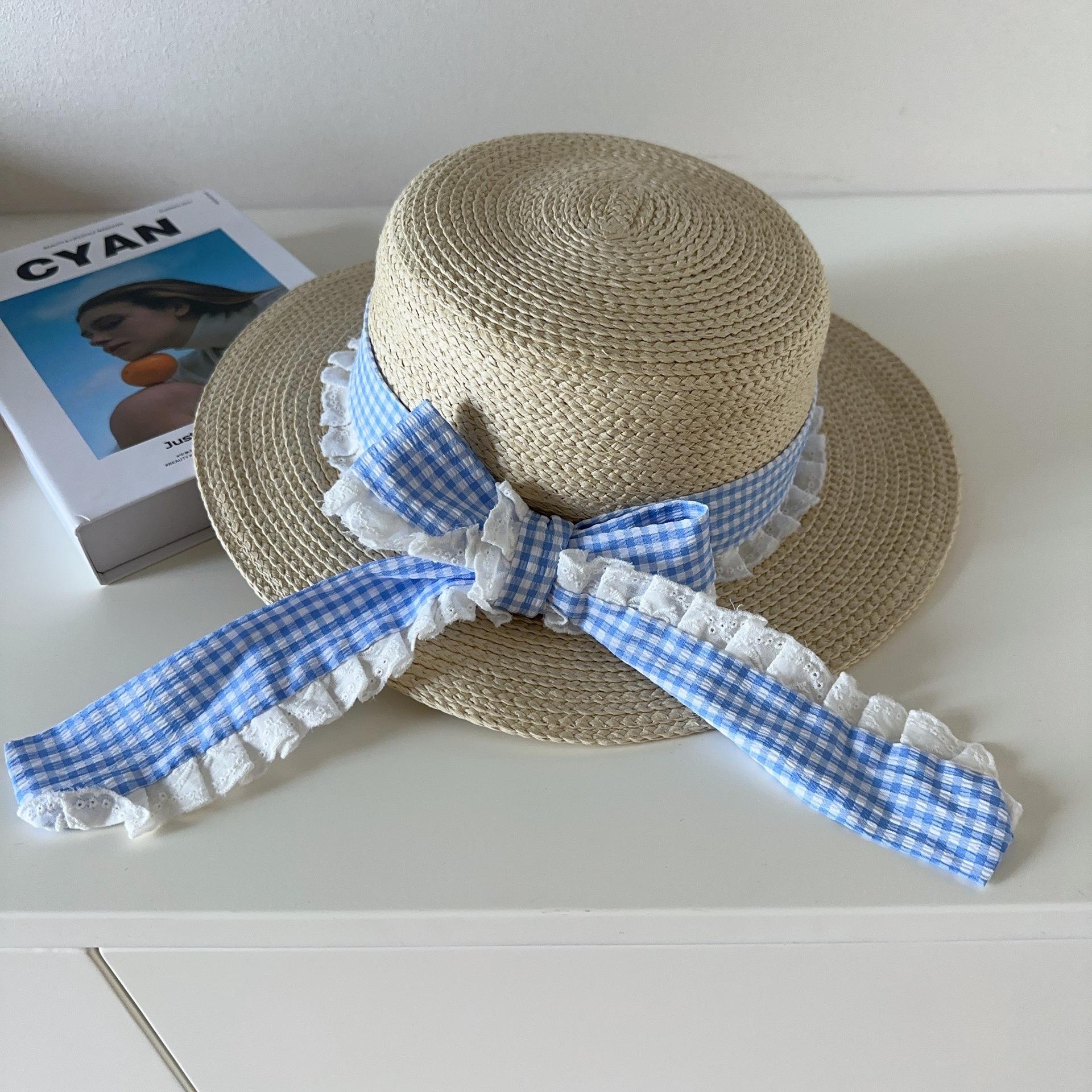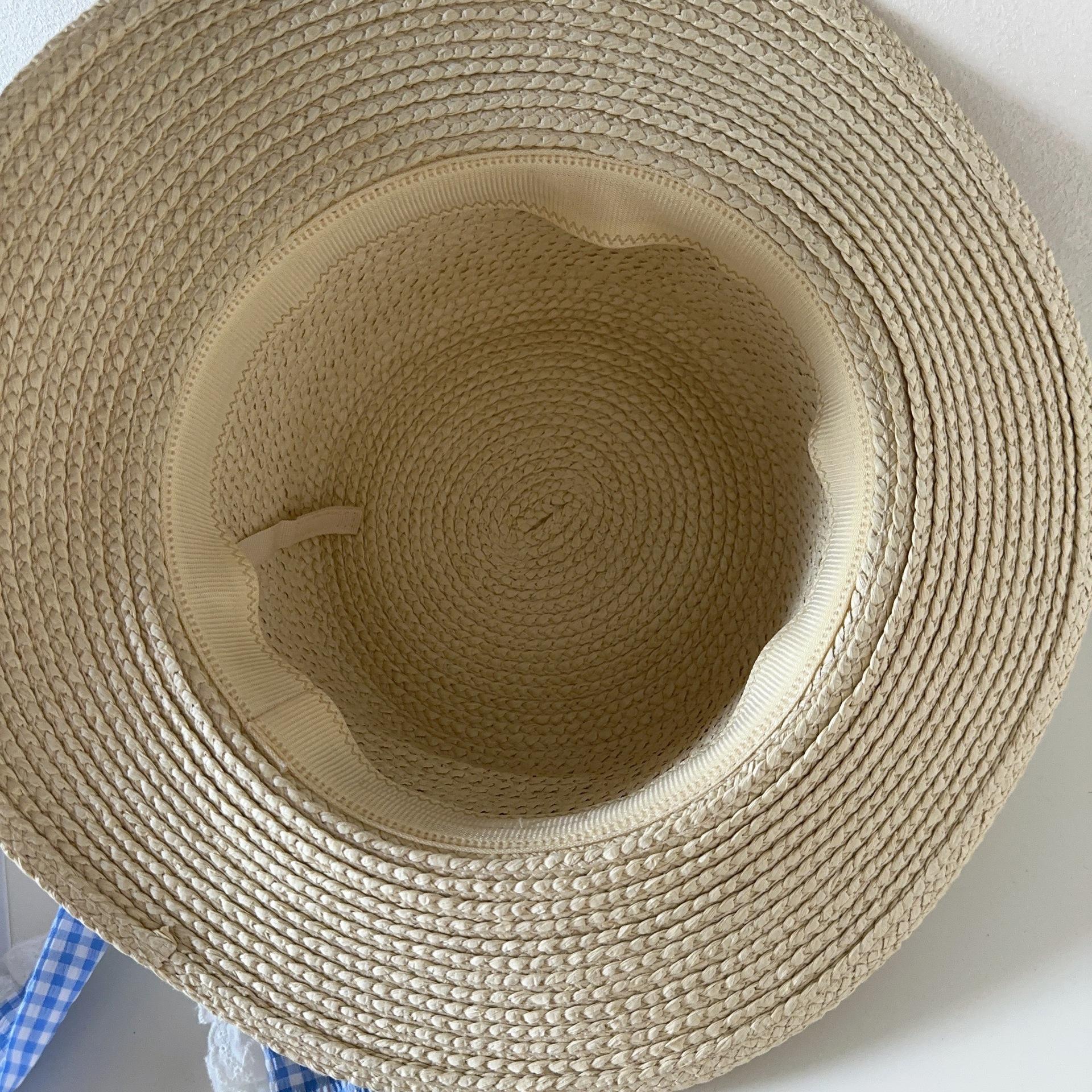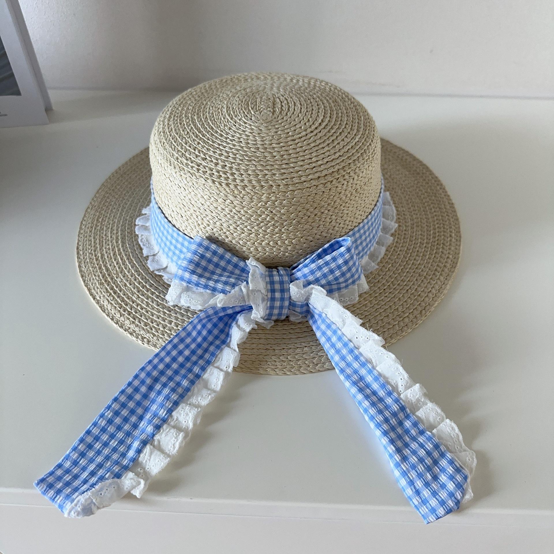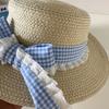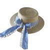 Sombrero de Paja de Ala Plana a Cuadros con Lazo para Mujer Verano Vacaciones en la Playa Junto al Mar Sombrero de Protección Solar Sombrero para el Sol