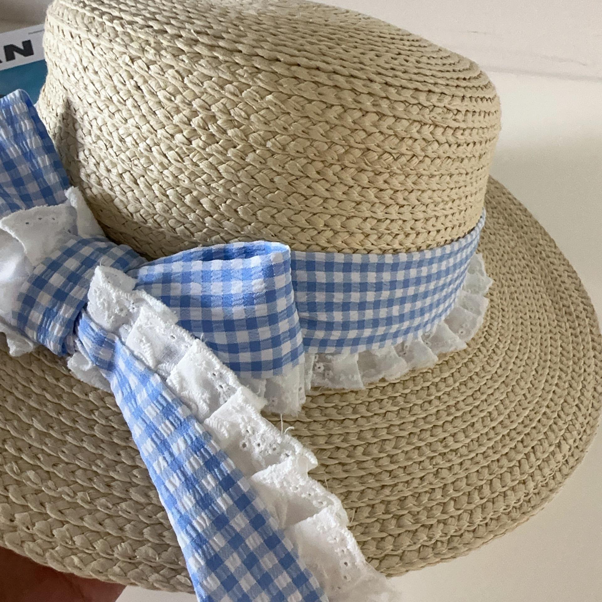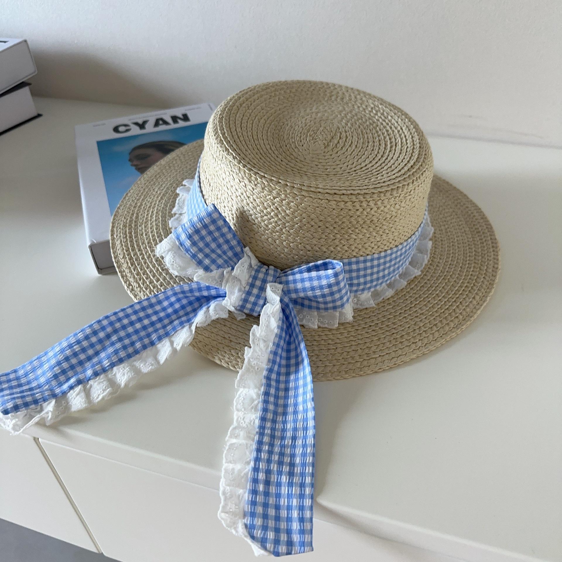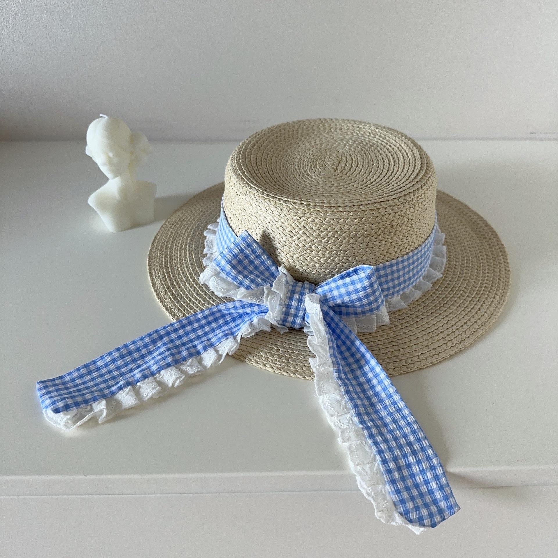 Sombrero de Paja de Ala Plana a Cuadros con Lazo para Mujer Verano Vacaciones en la Playa Junto al Mar Sombrero de Protección Solar Sombrero para el Sol