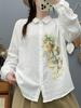 Camisa blanca de manga larga de gasa de algodón de doble capa con estampado floral pequeño para mujer, nueva para otoño 2025, holgada, retro, literaria, casual, versátil