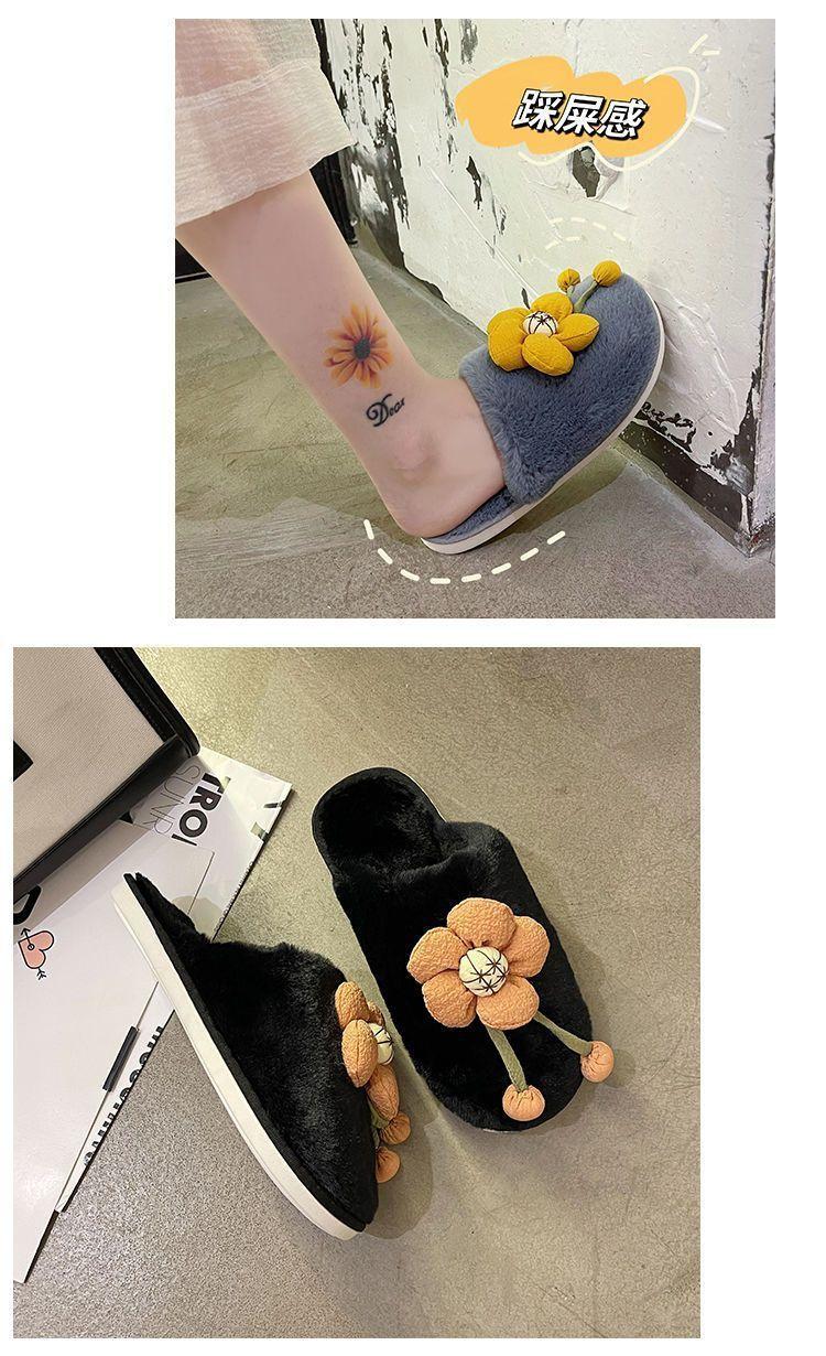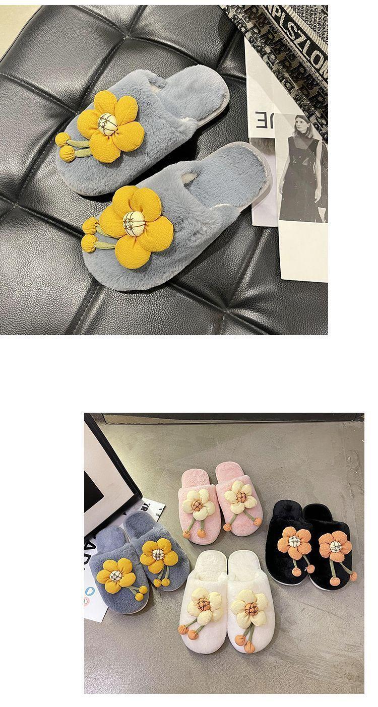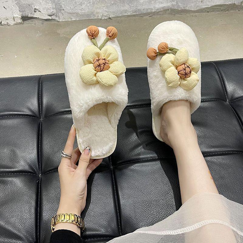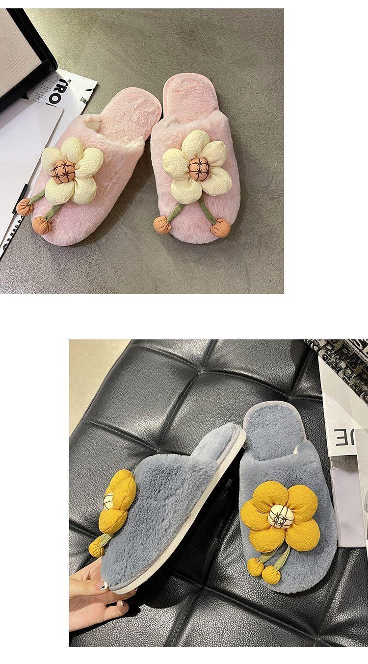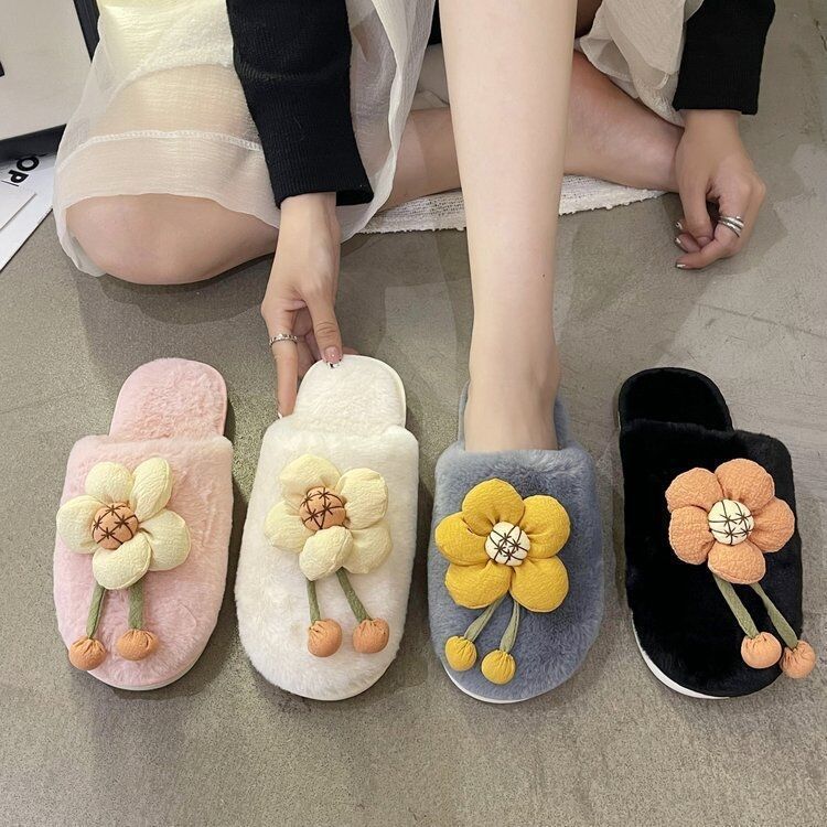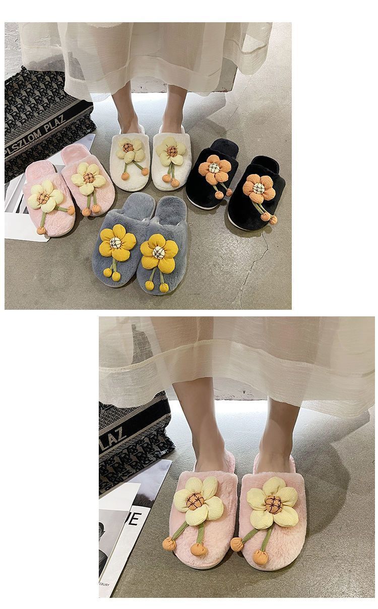 Compra Pantuflas Peludas de Flores Lindas 2025 Otoño/Invierno Nuevo Celebridad de Internet Hogar Dormitorio Planas Antideslizantes Pantuflas de Algodón de Punta Cerrada para Mujer al por mayor en Joom.pro