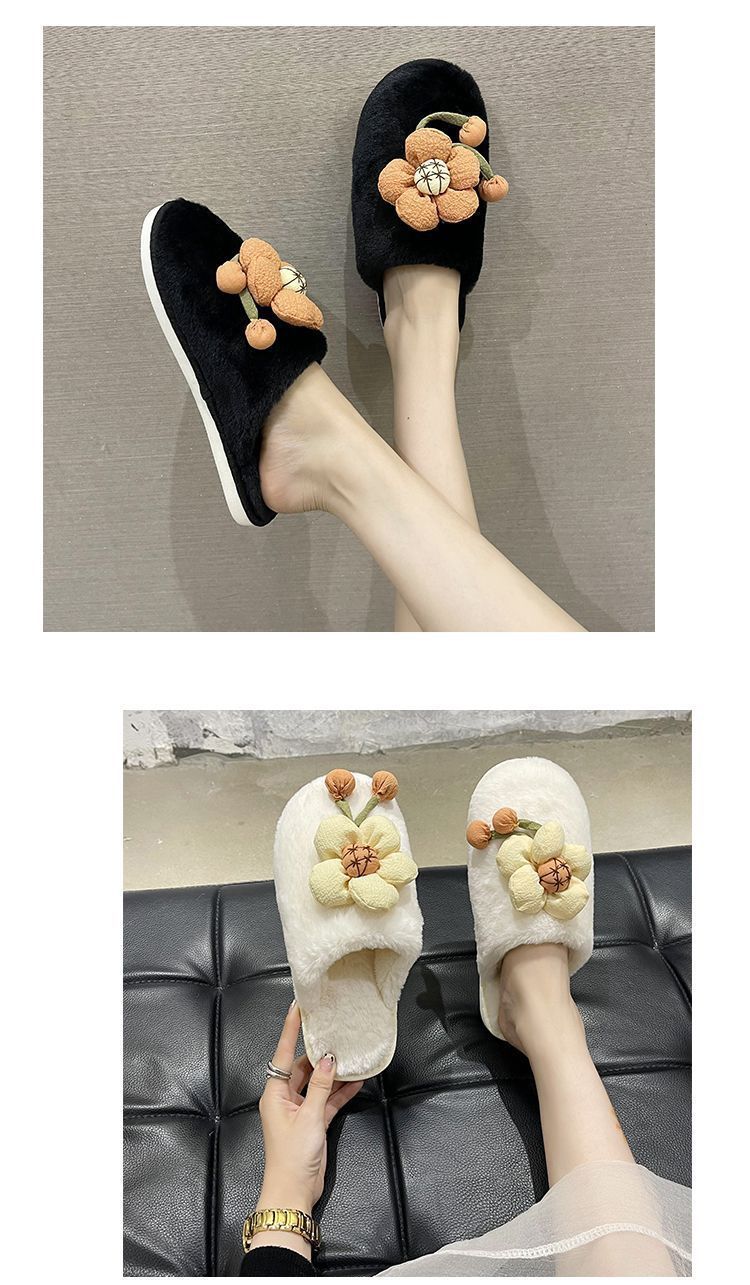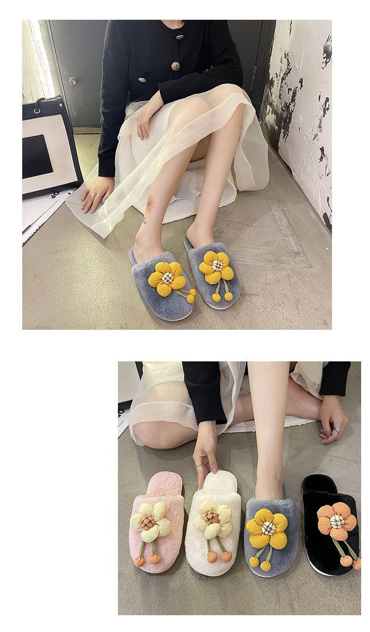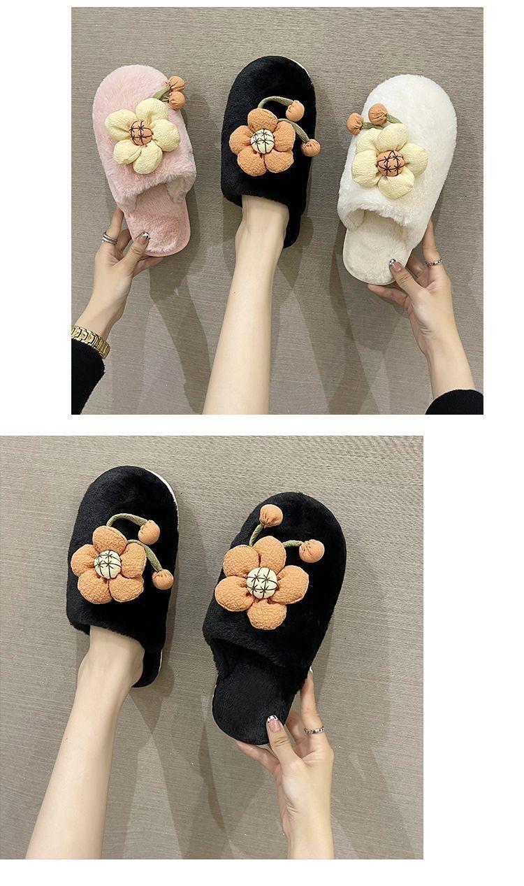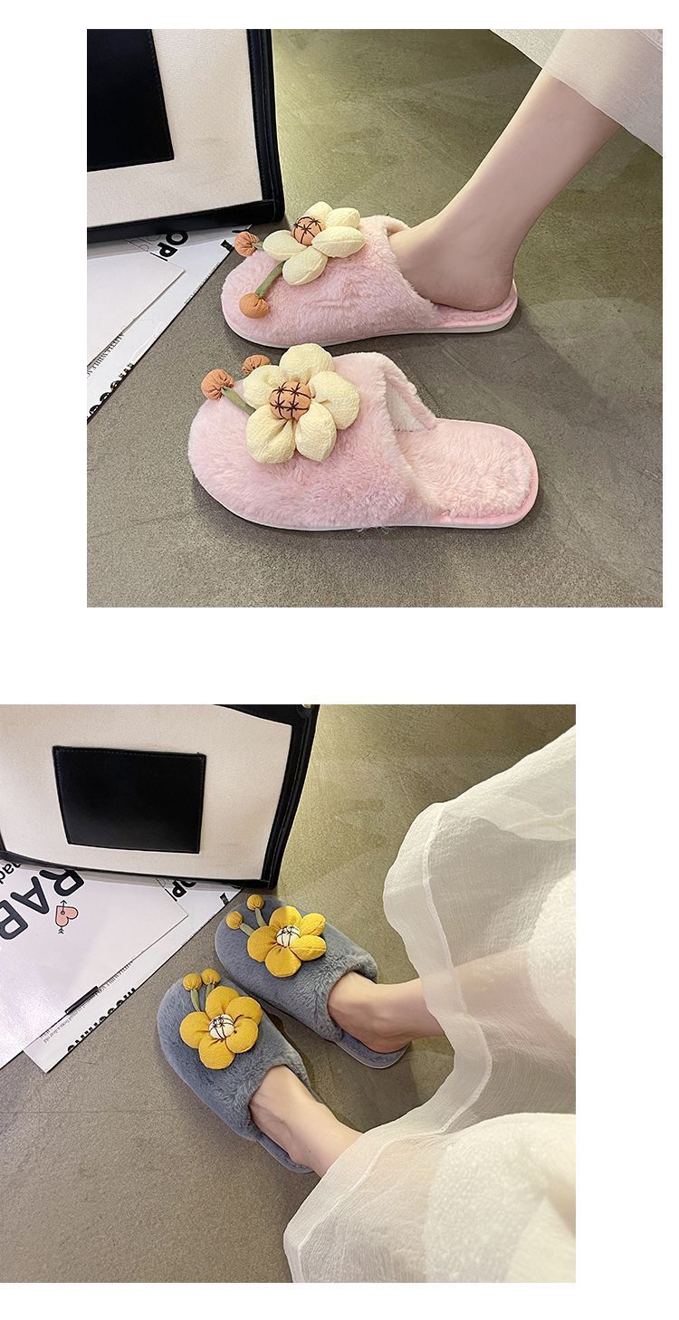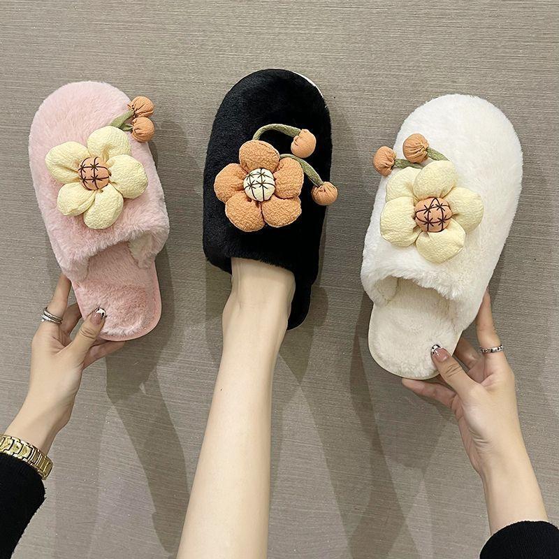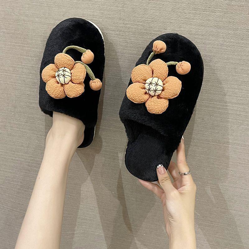 Compra Pantuflas Peludas de Flores Lindas 2025 Otoño/Invierno Nuevo Celebridad de Internet Hogar Dormitorio Planas Antideslizantes Pantuflas de Algodón de Punta Cerrada para Mujer al por mayor en Joom.pro