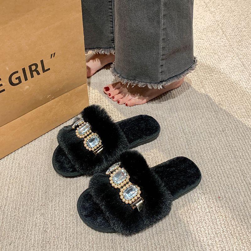 Moda estilo coreano para el hogar, zapatillas de interior cálidas antideslizantes de una tira, nuevo otoño e invierno 2025, zapatillas planas de piel para mujer