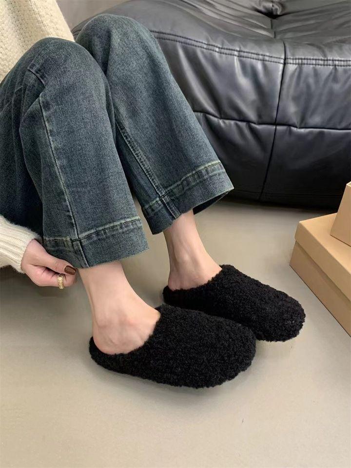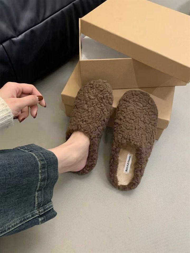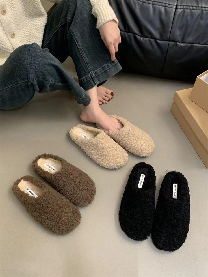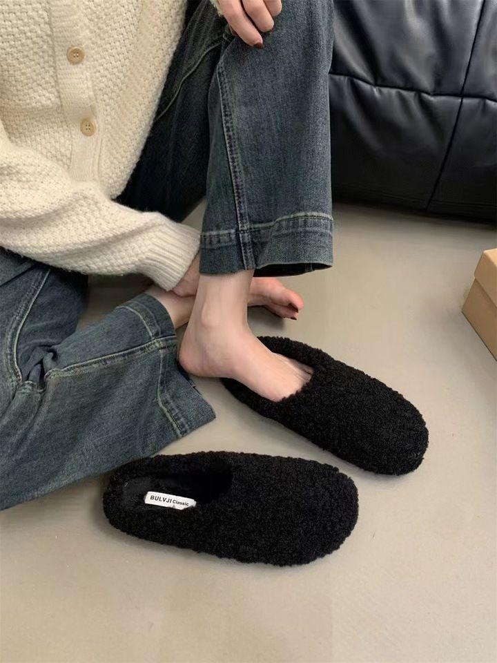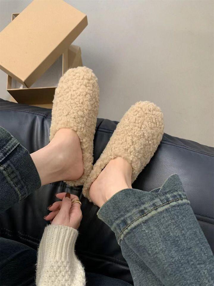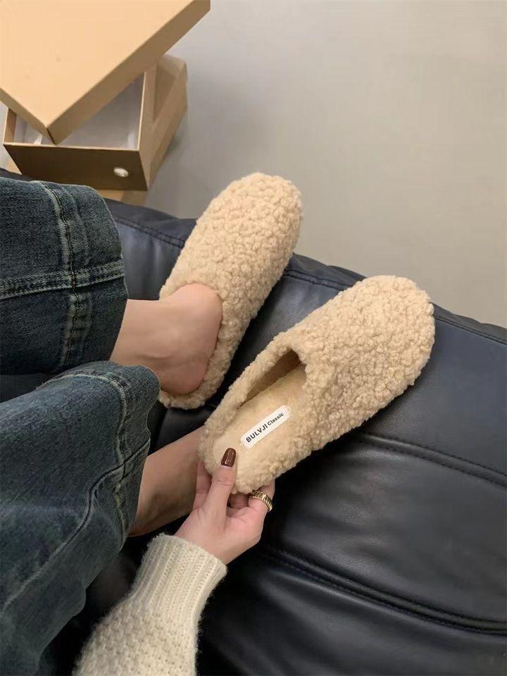 Compra Pantuflas Peludas para Exterior de Mujer 2025 Nuevo Invierno Estilo Coreano Flats Perezosas Cómodas Zapatos Mule Pantuflas de Punta Media Forradas de Vellón al por mayor en Joom.pro