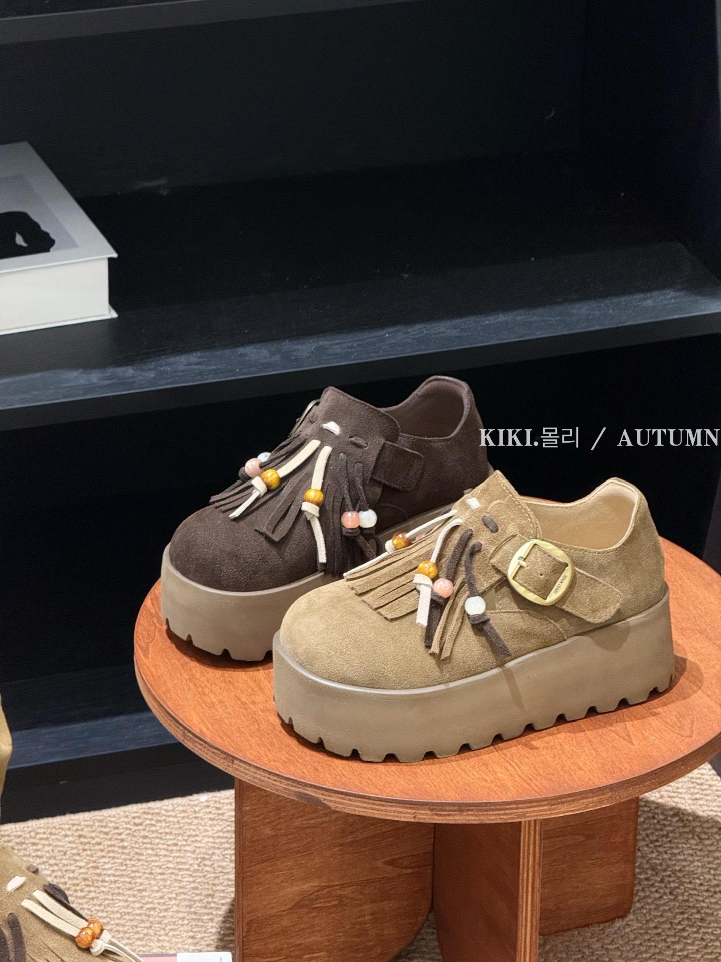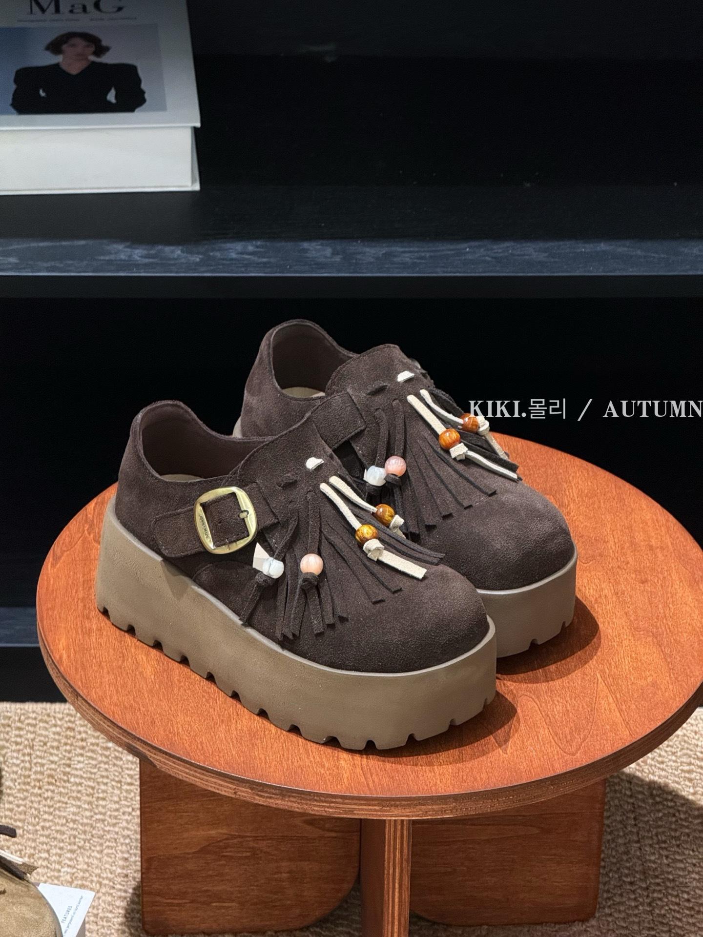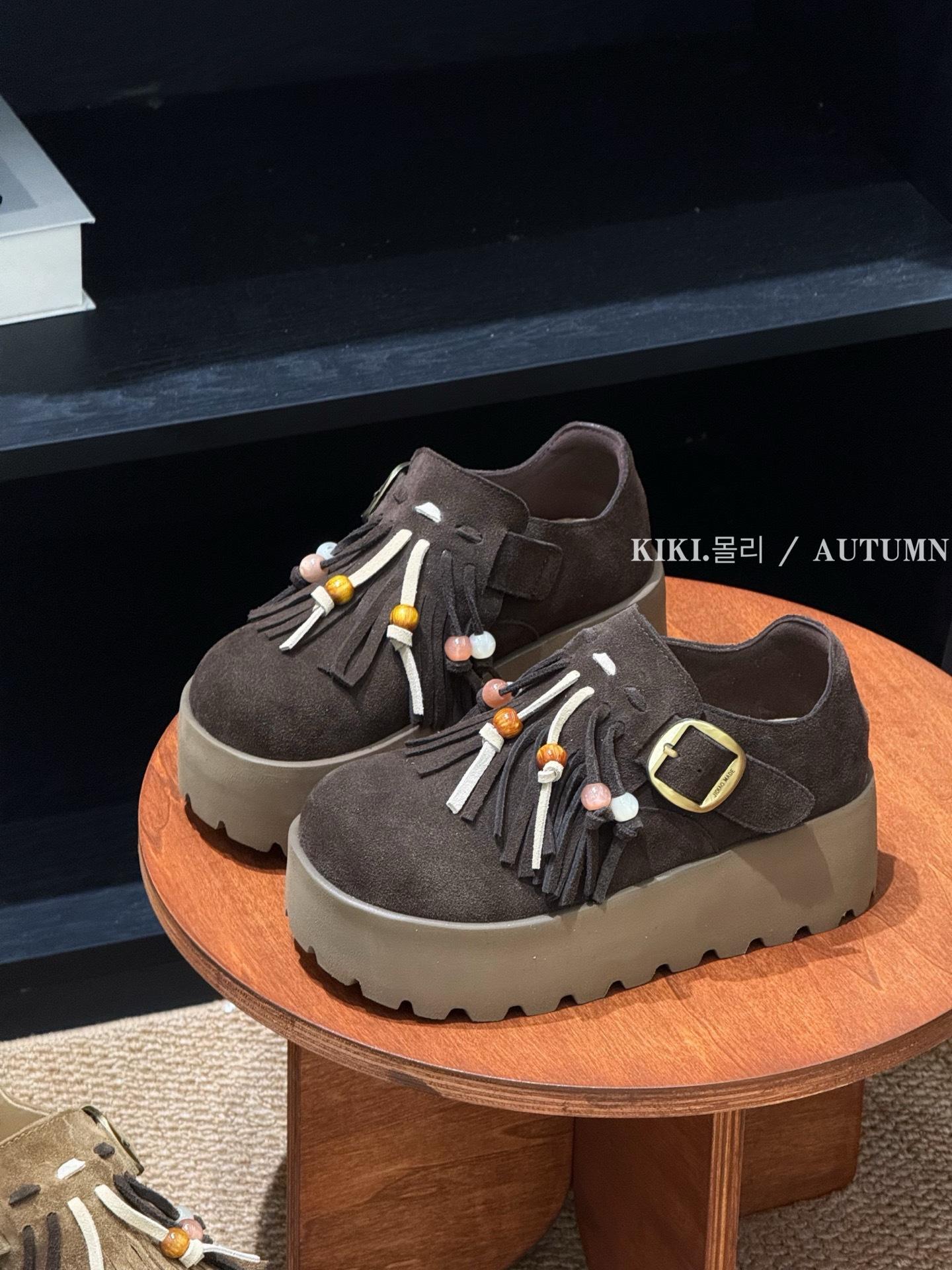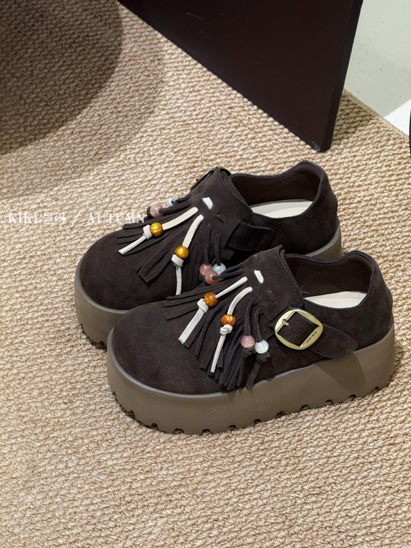 Mocasines de Otoño 2025 Birkenstock de Suela Gruesa para Mujer con Borlas Retro y Cuentas, Zapatos Únicos con Velcro