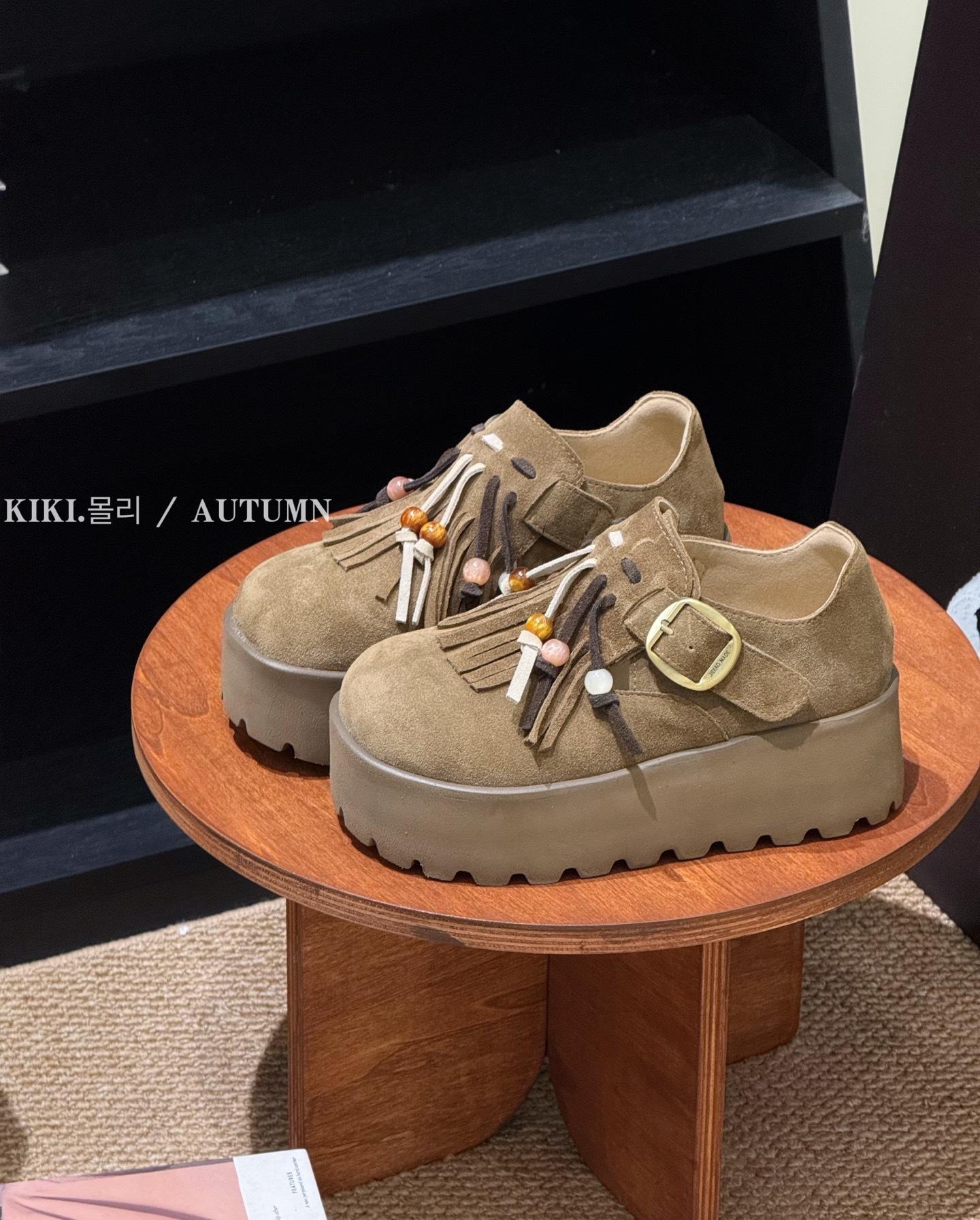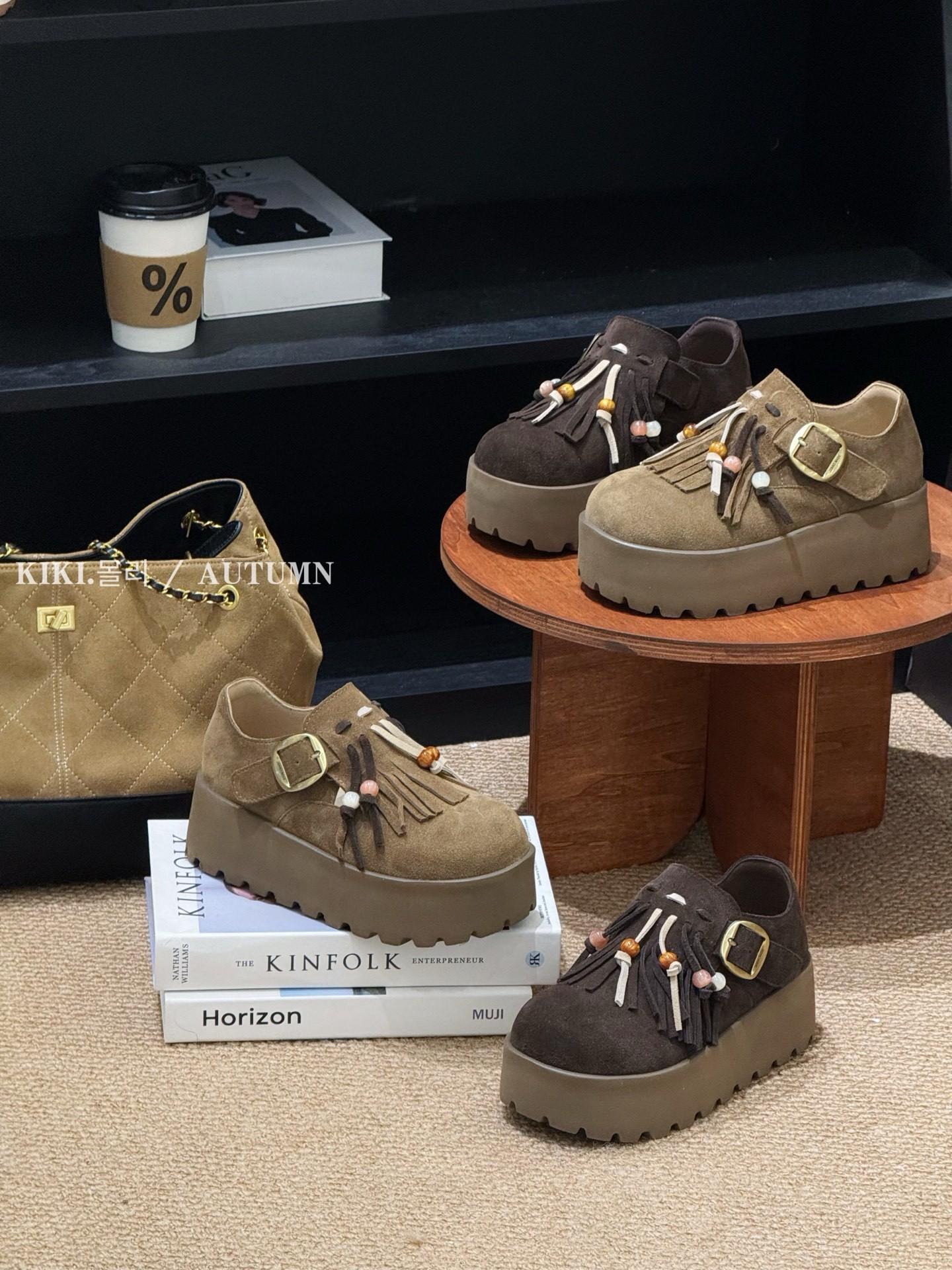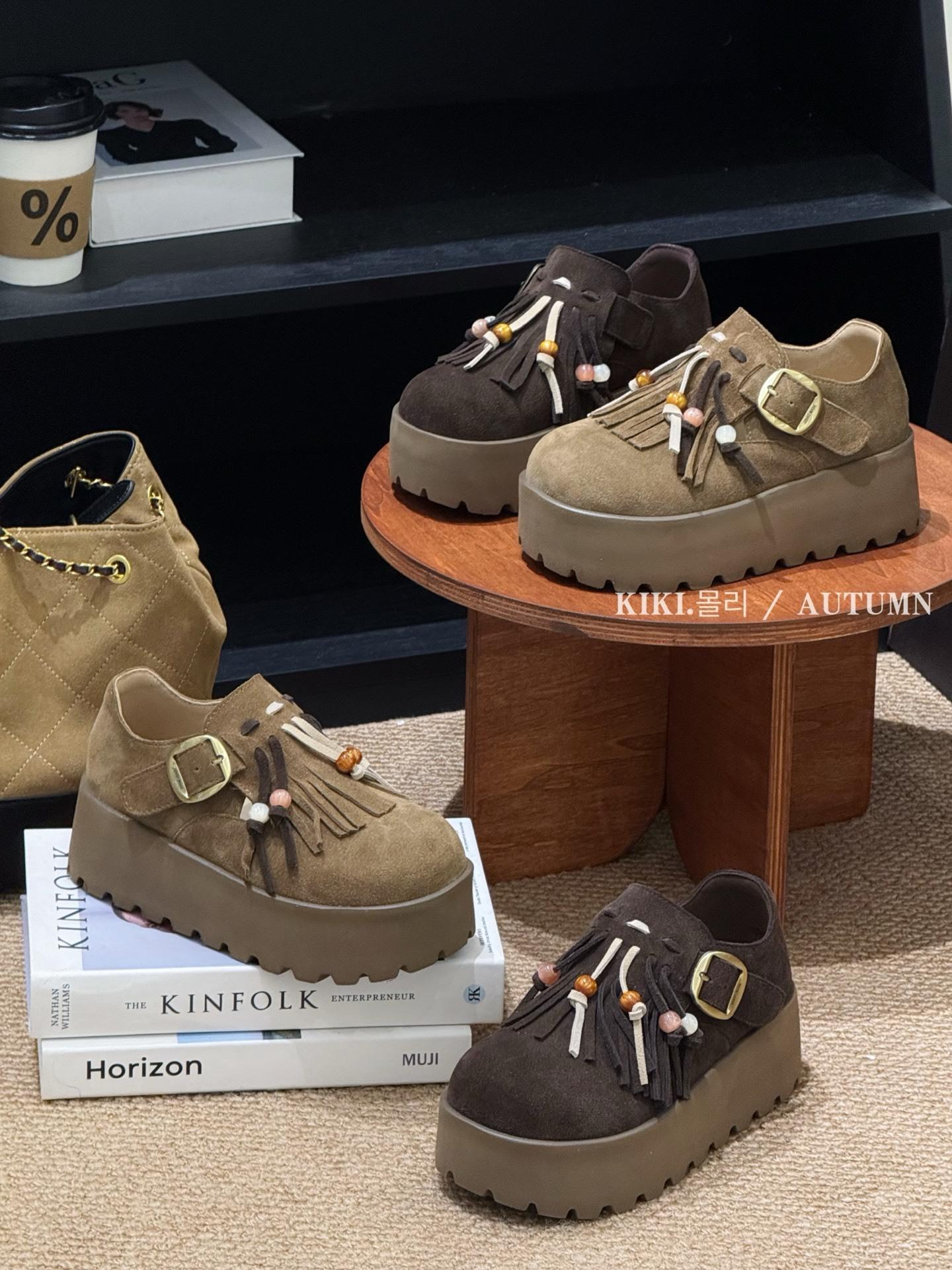 Mocasines de Otoño 2025 Birkenstock de Suela Gruesa para Mujer con Borlas Retro y Cuentas, Zapatos Únicos con Velcro
