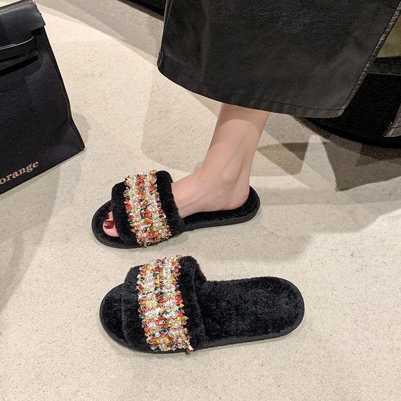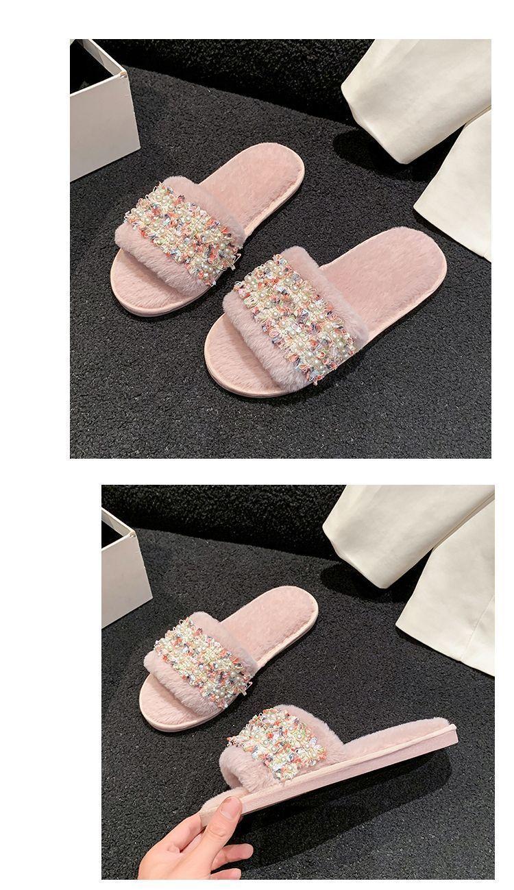 Pantuflas Casuales Planas de Algodón con Una Tira de Forro Polar 2025 Nueva Moda de Celebridad de Internet Otoño/Invierno Versátiles para Casa Pantuflas Peludas para Mujer