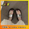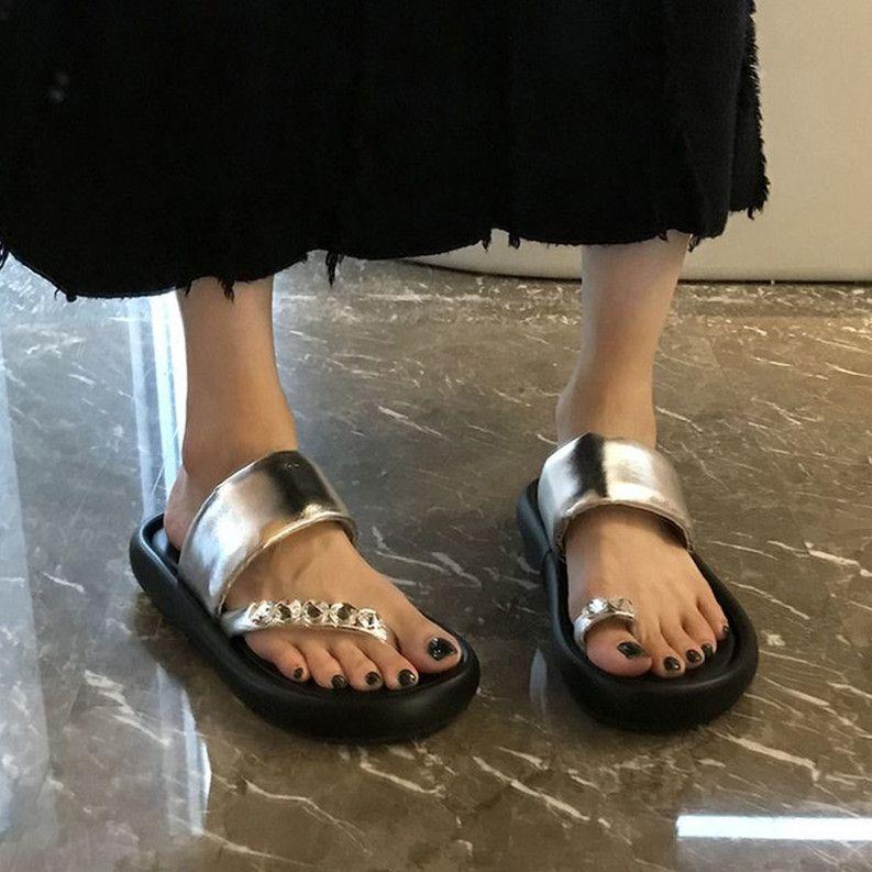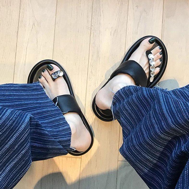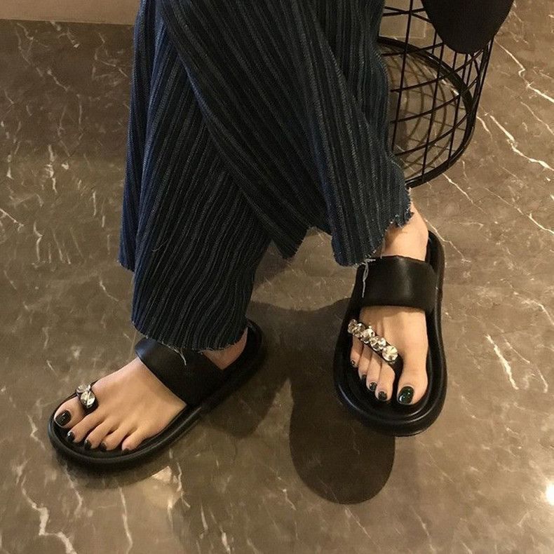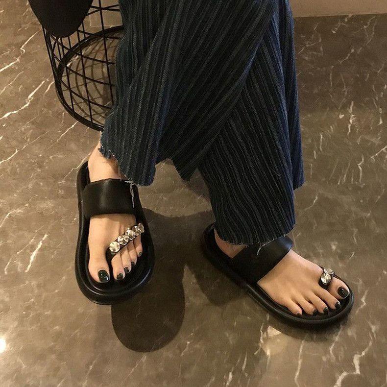 Sandalias de dedo con pedrería estilo hada francés para mujer 2025 verano nuevas de suela gruesa antideslizantes de una tira para vacaciones en la playa