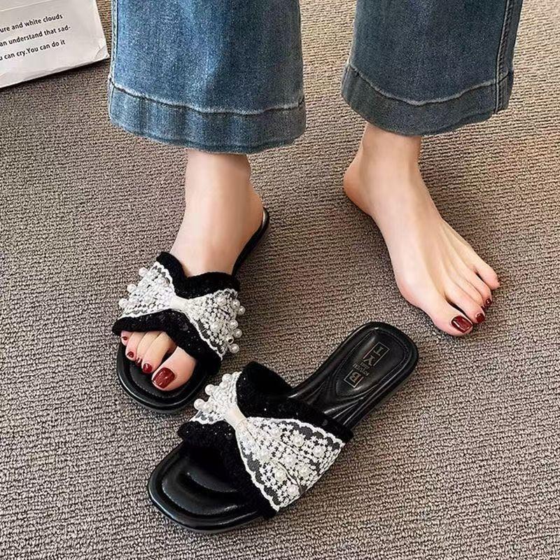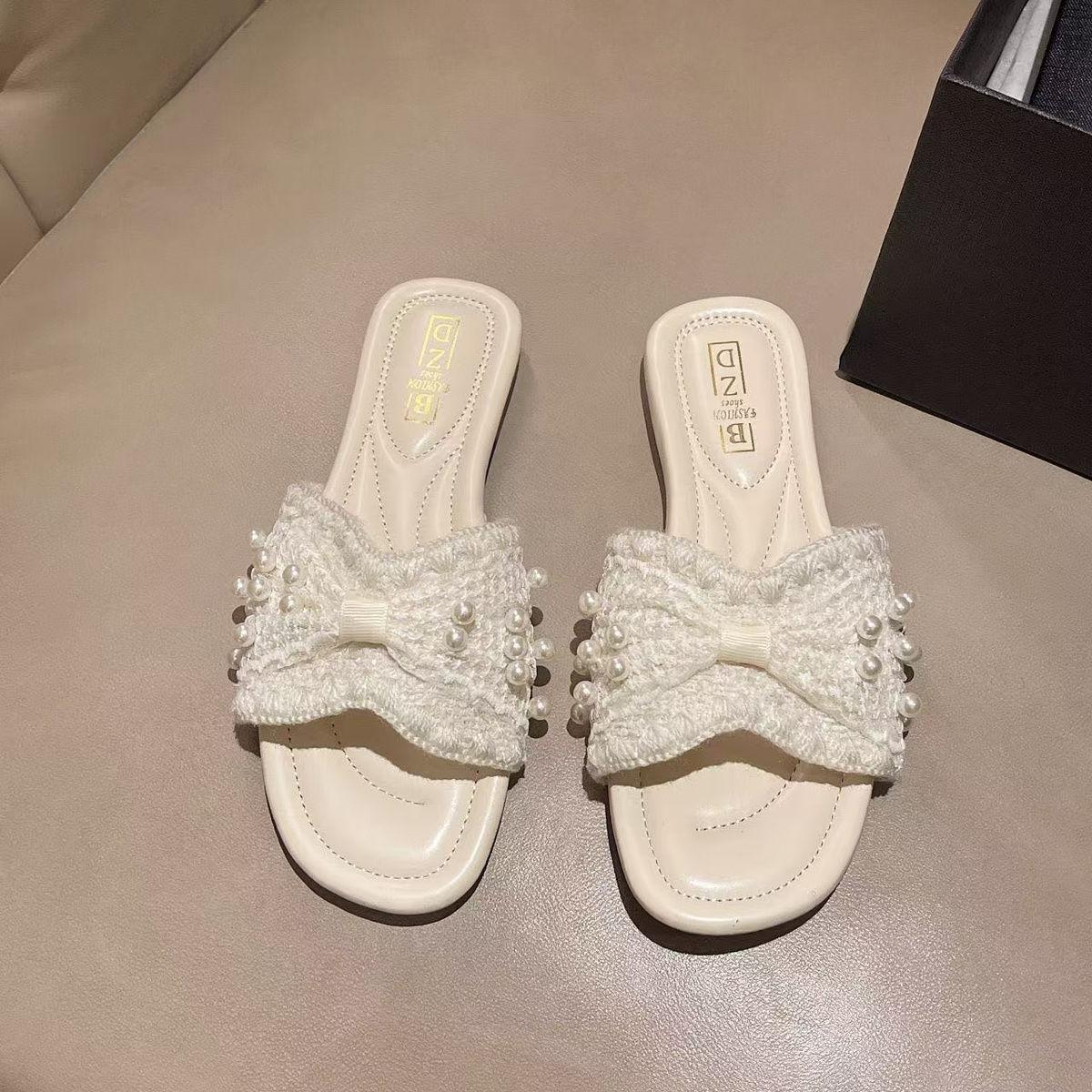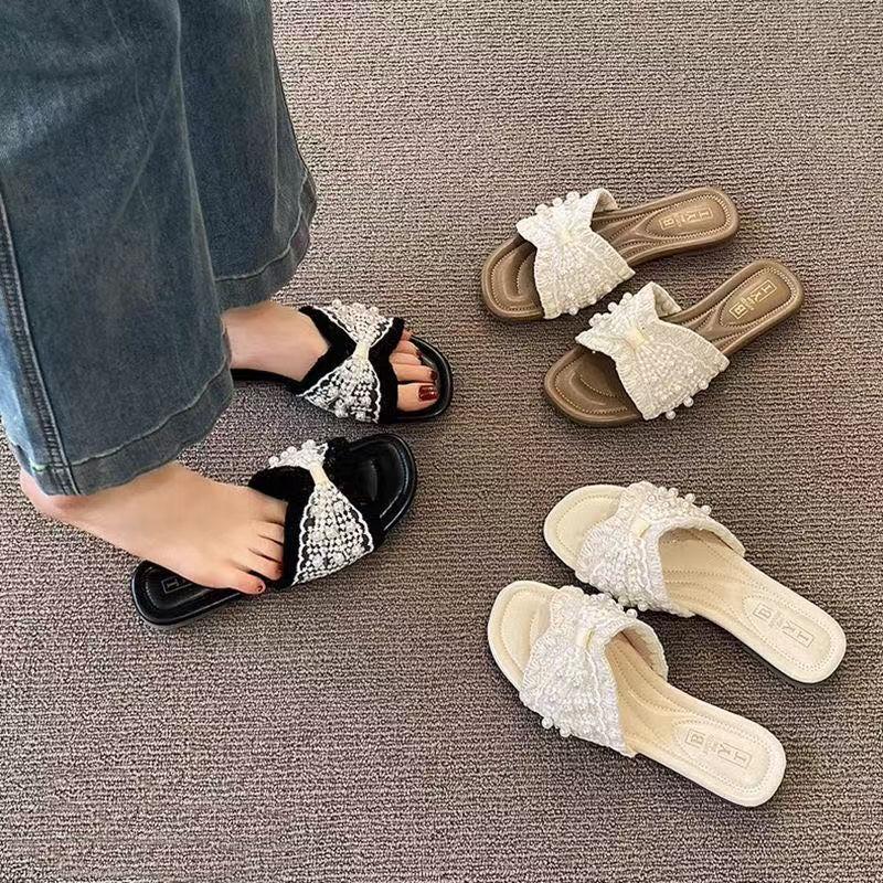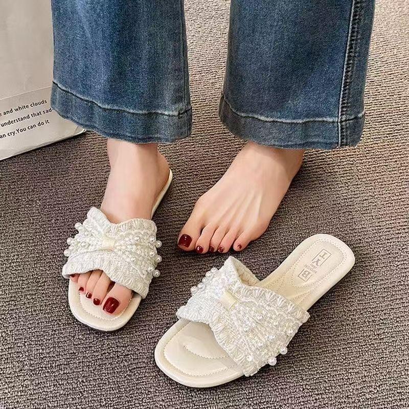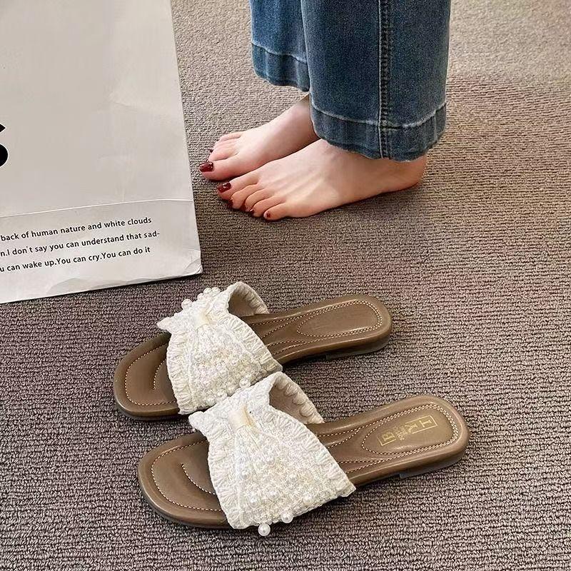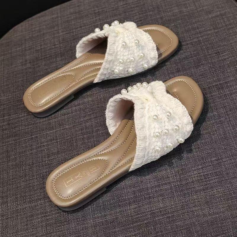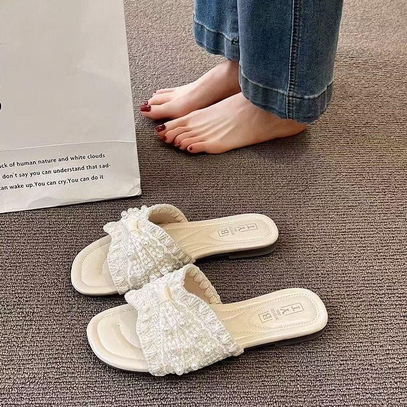 Zapatillas frescas de perlas francesas para mujer 2025 verano nuevo punta cuadrada estilo hada sandalias de una tira exterior fondo plano combinan falda estilo hot