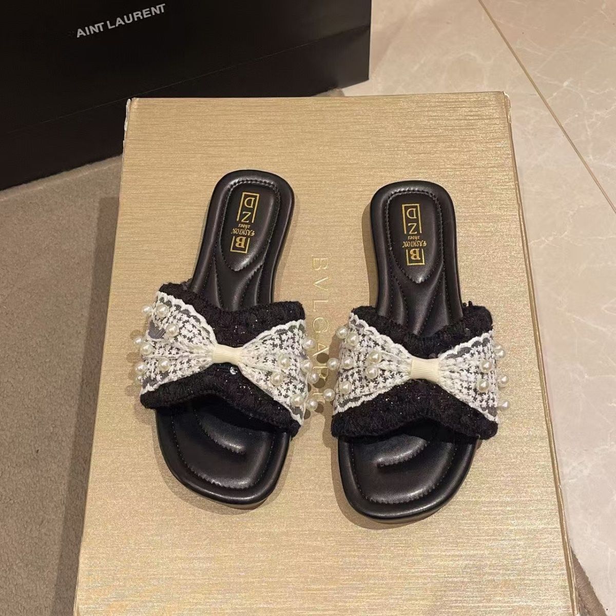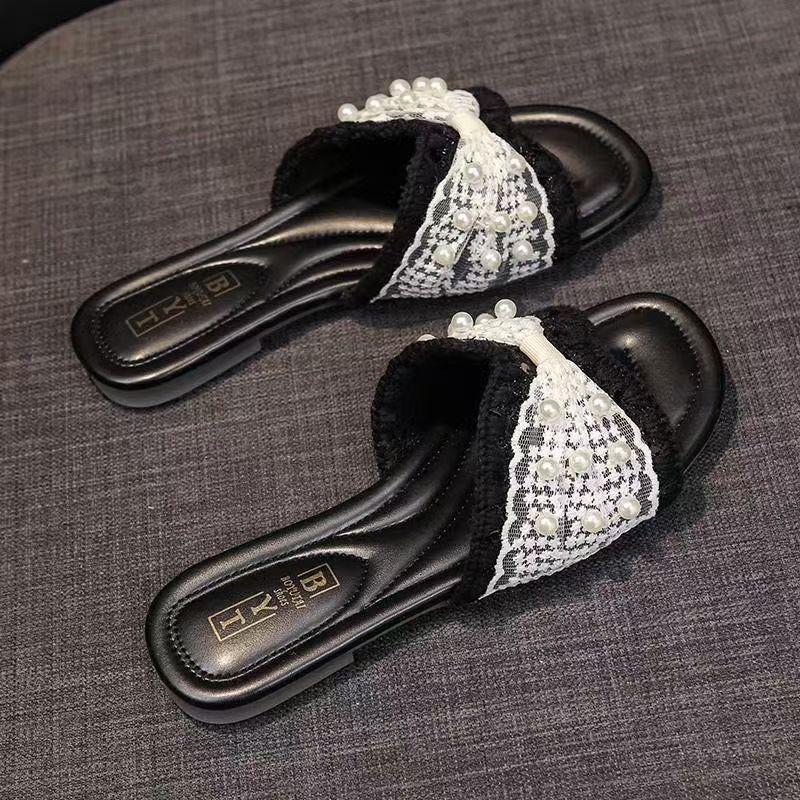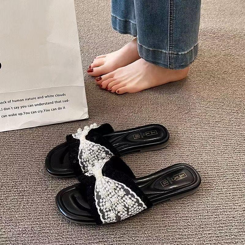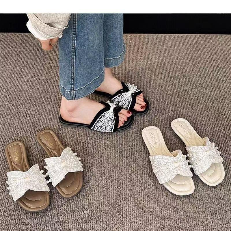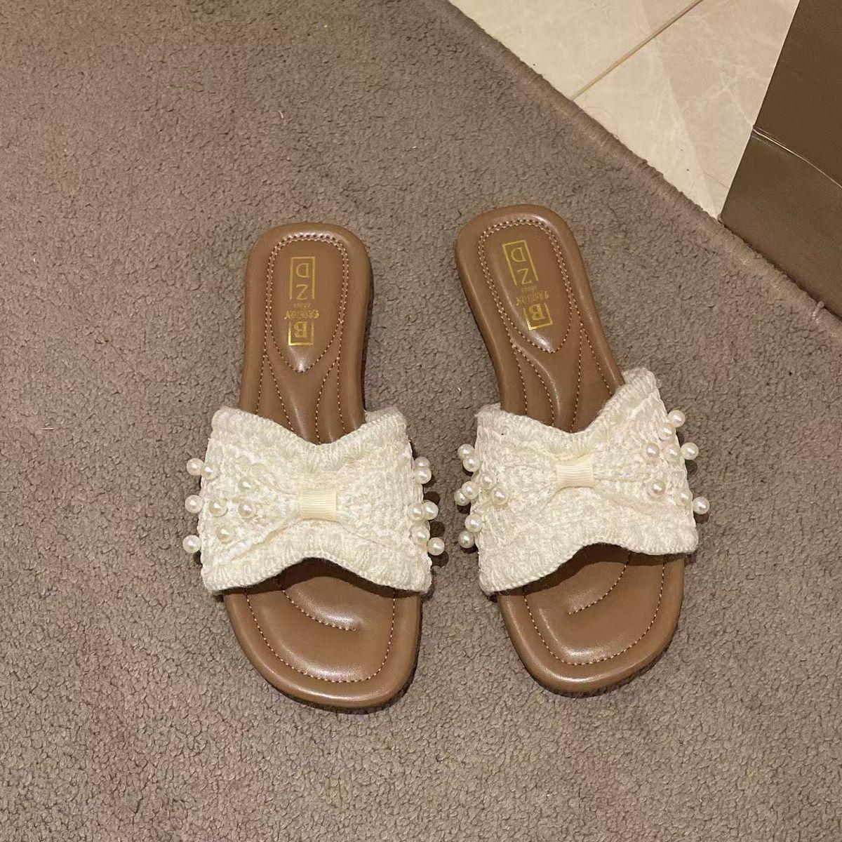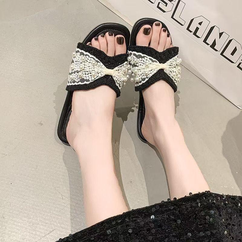 Zapatillas frescas de perlas francesas para mujer 2025 verano nuevo punta cuadrada estilo hada sandalias de una tira exterior fondo plano combinan falda estilo hot