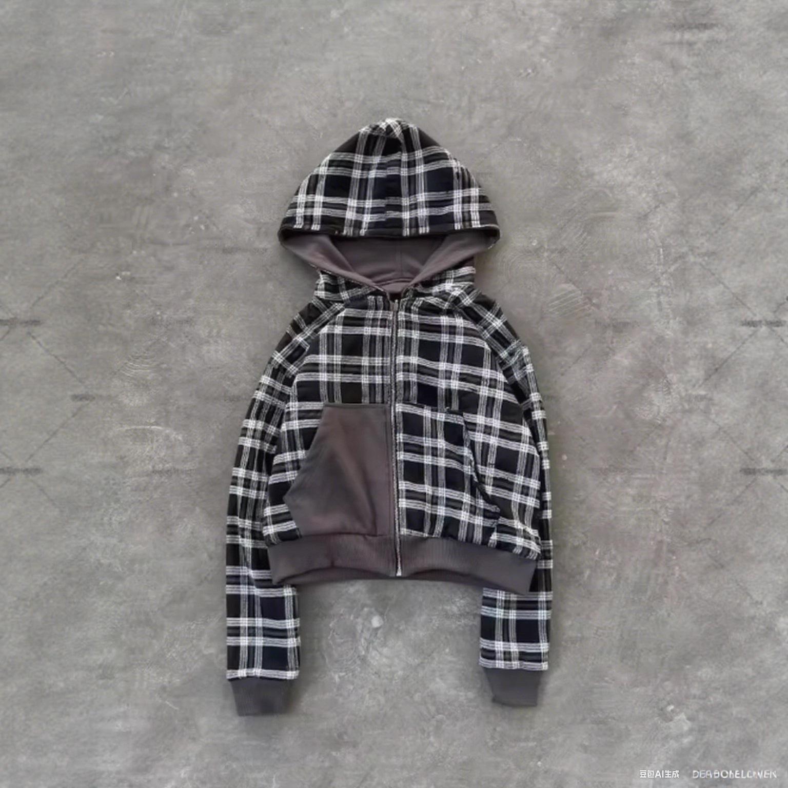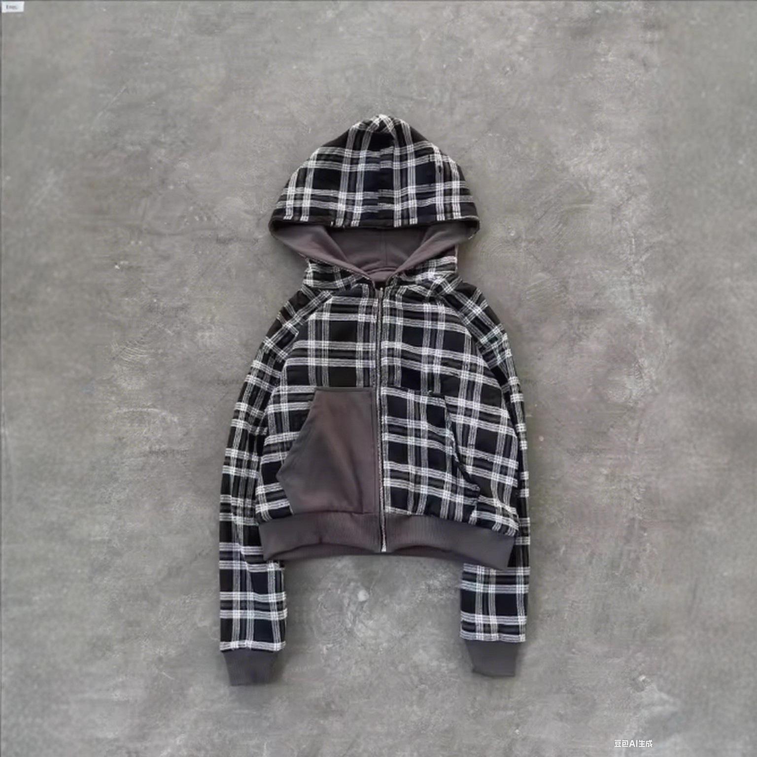 Estilo europeo y americano transfronterizo estampado de cuadros reversible otoño e invierno hip-hop estilo urbano cárdigan sudadera con capucha y cremallera