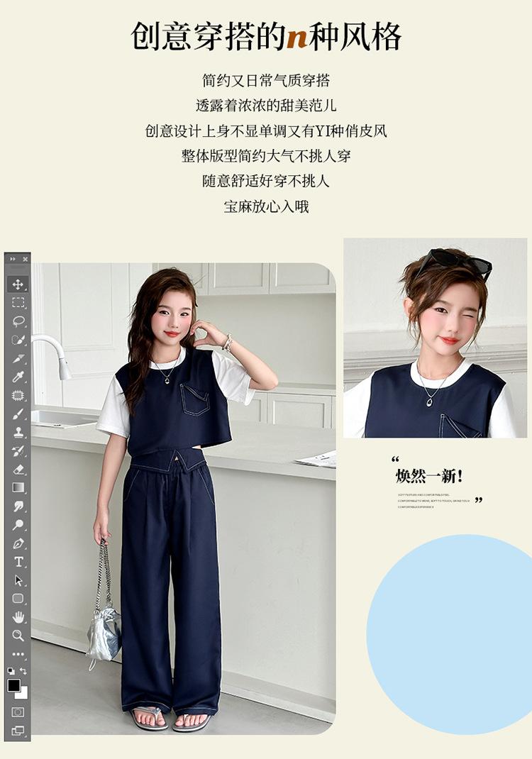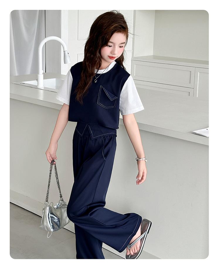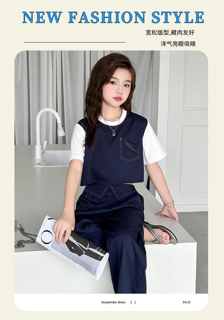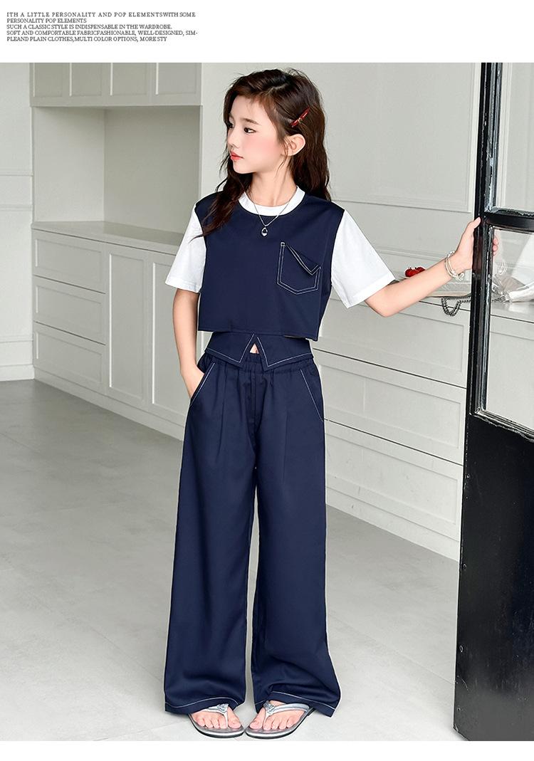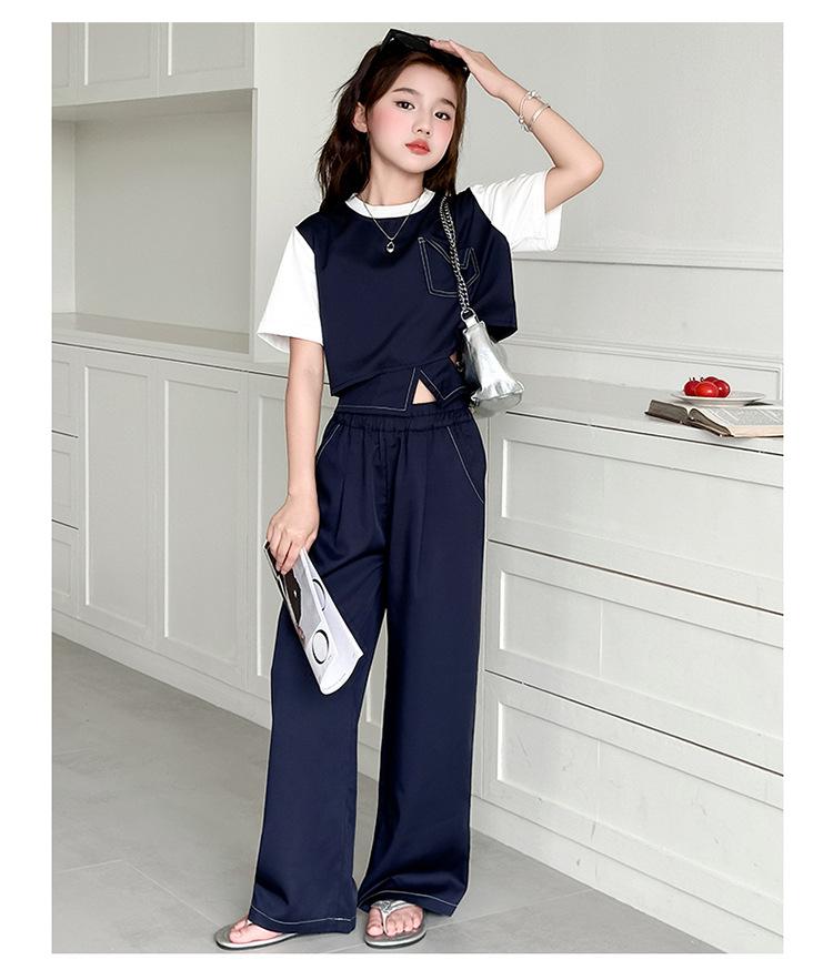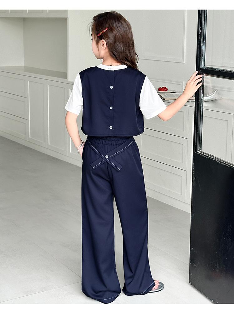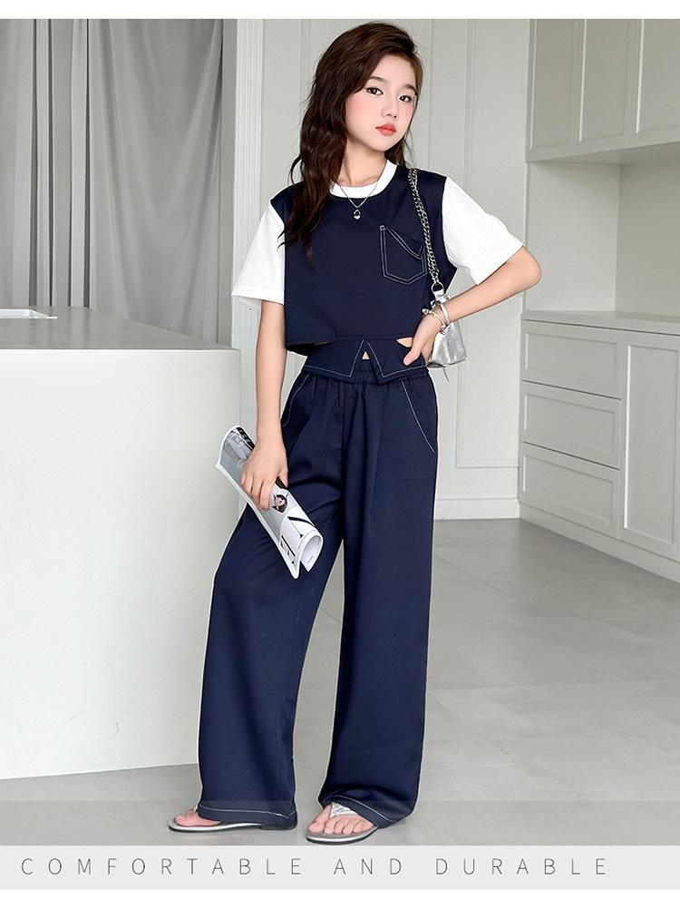 Conjunto de Pantalón Largo Sencillo de Dos Piezas Falso Estilo Coreano para Niñas Nuevo de Verano con Bloque de Color Sencillo Versátil Conjunto de Dos Piezas a la Moda