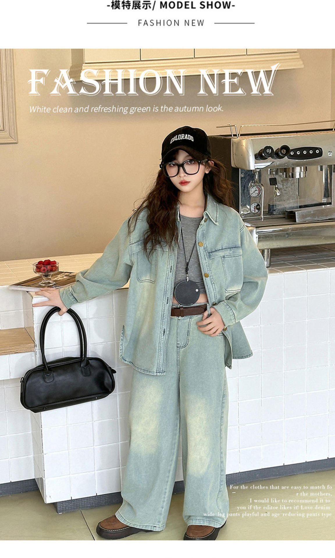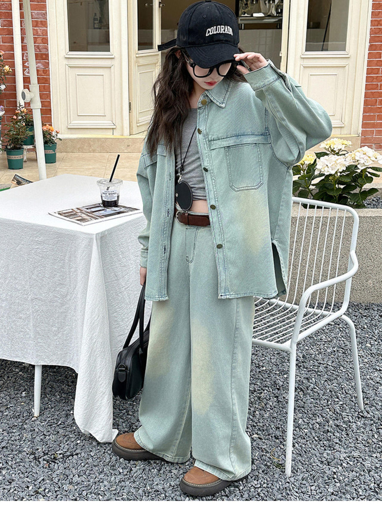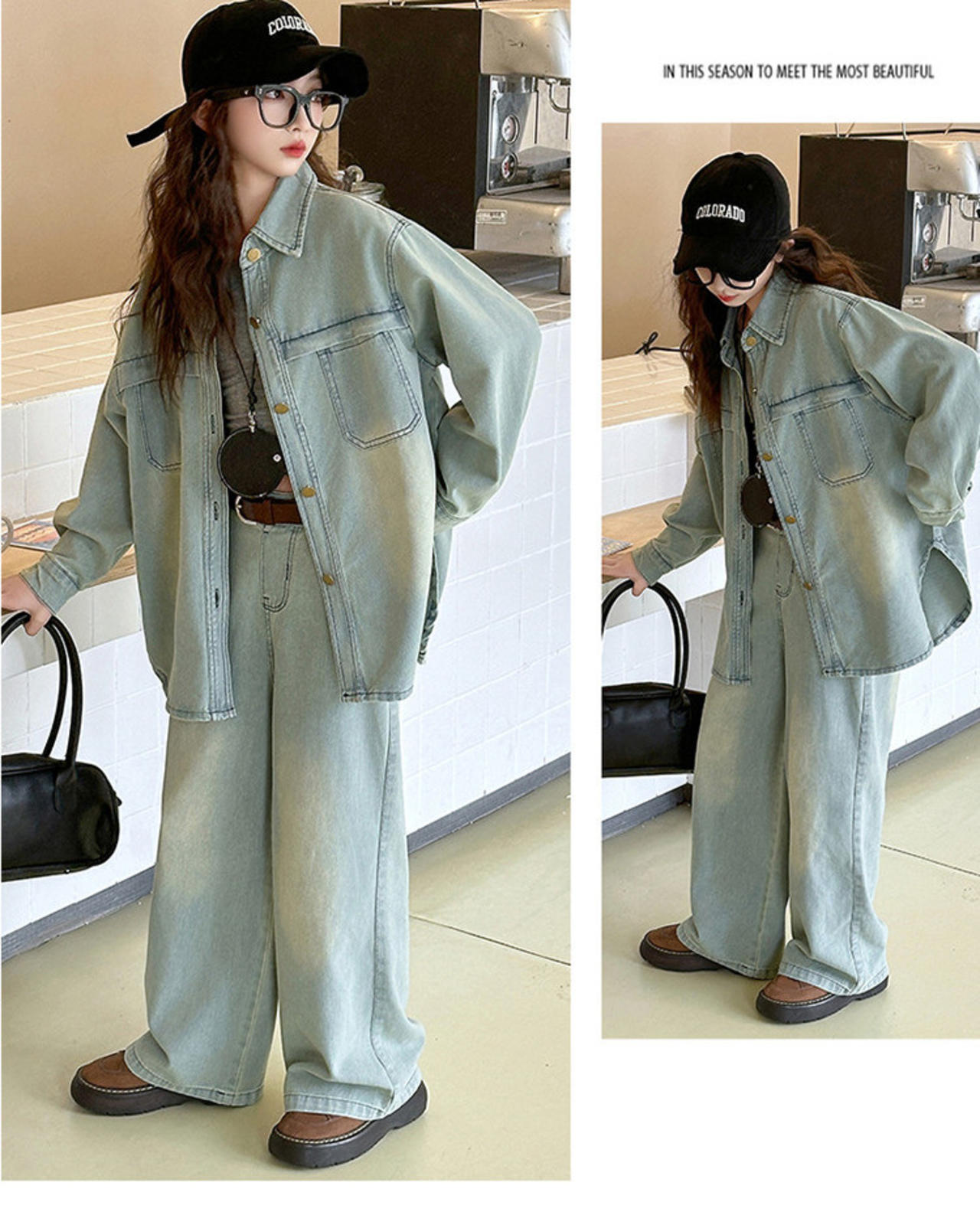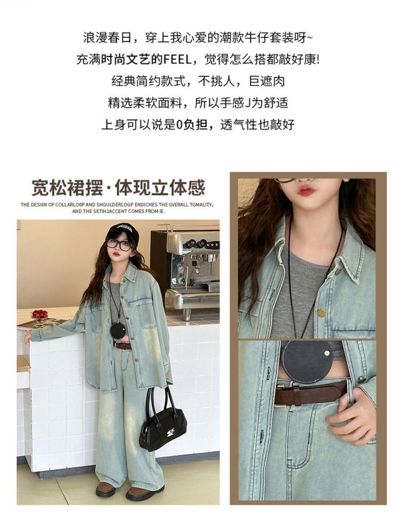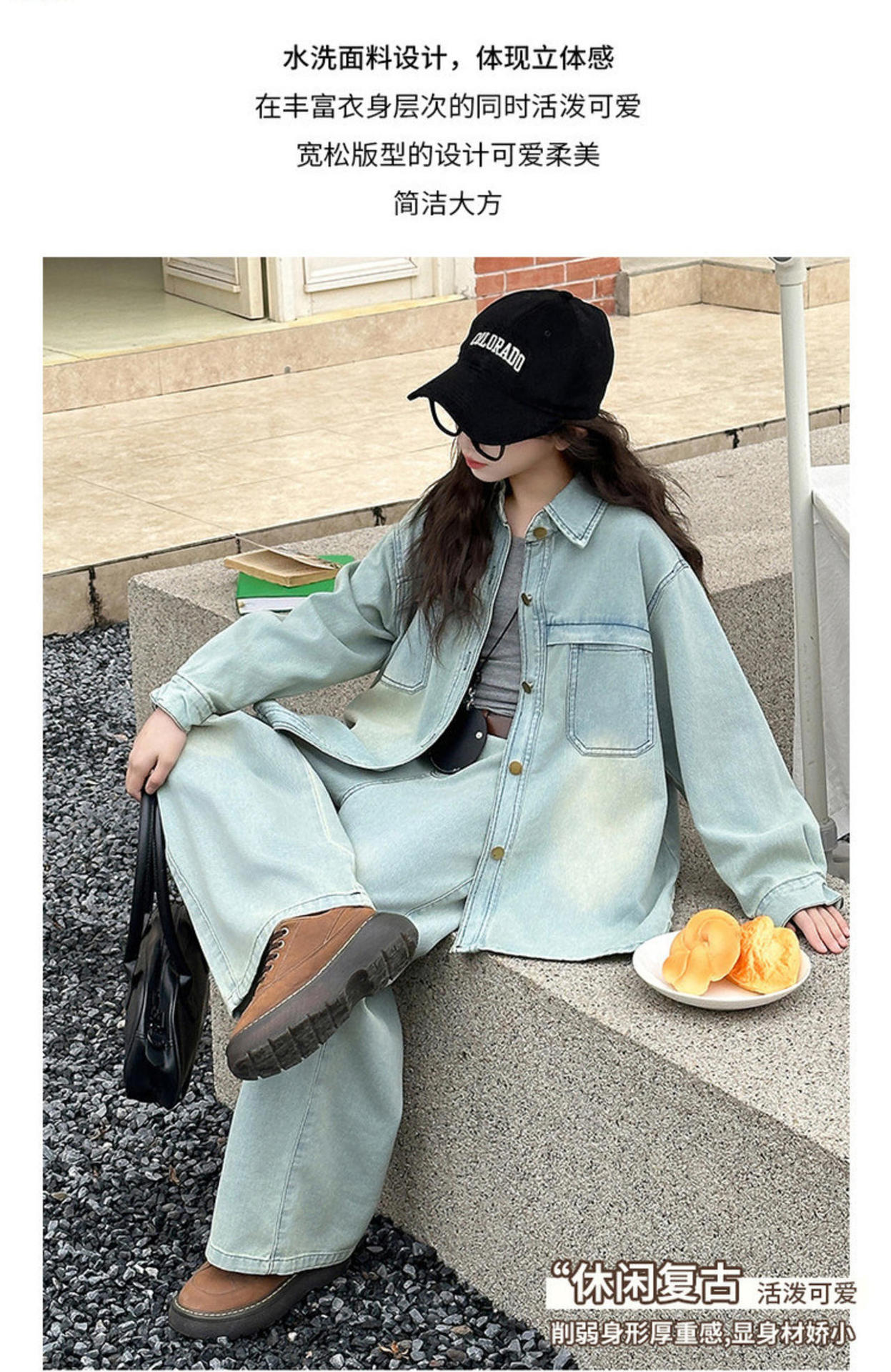 Chaqueta de mezclilla para niña Conjunto de primavera y otoño Jeans para niña grande Casual Suelto Conjunto de dos piezas con cinturón Marea