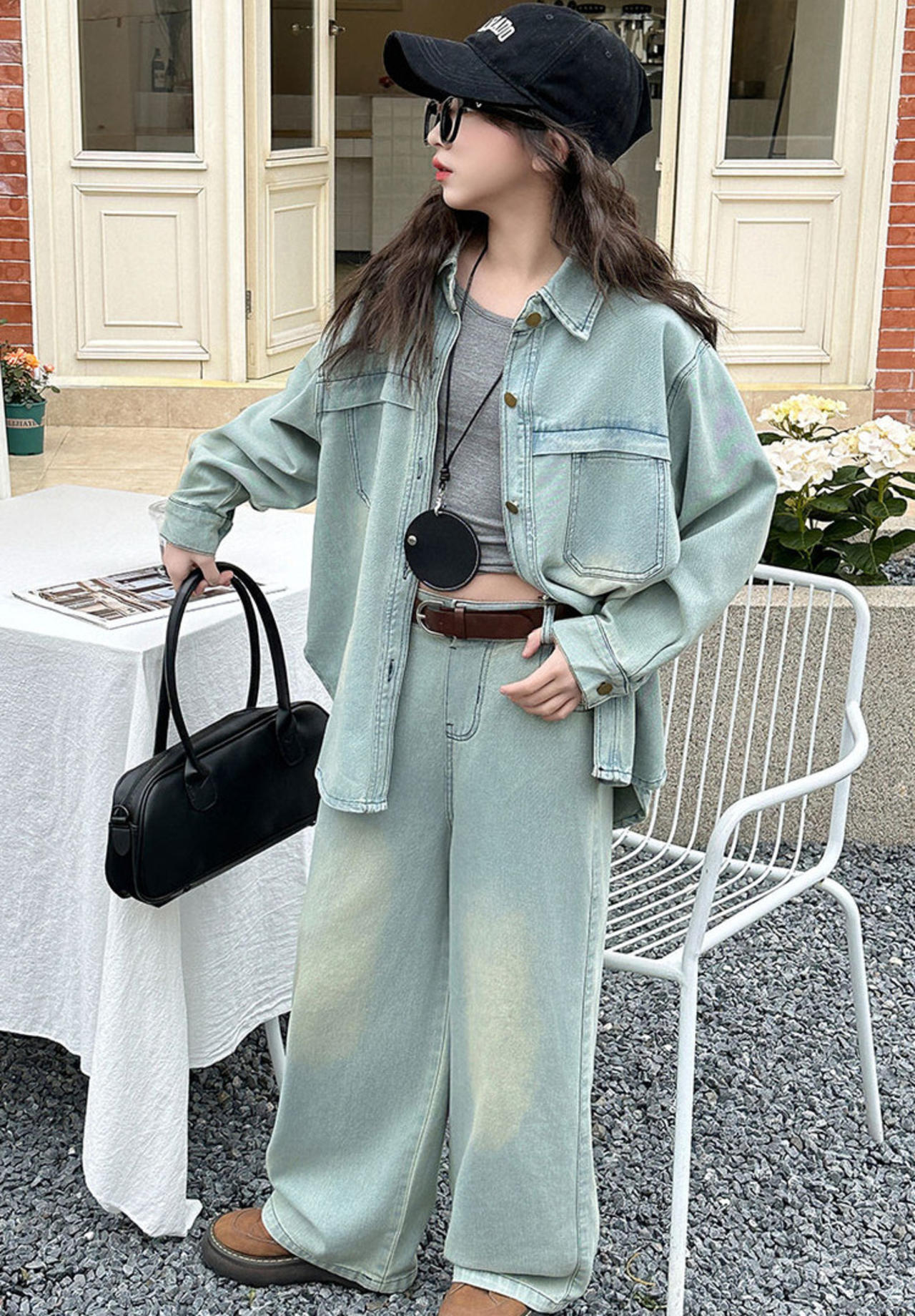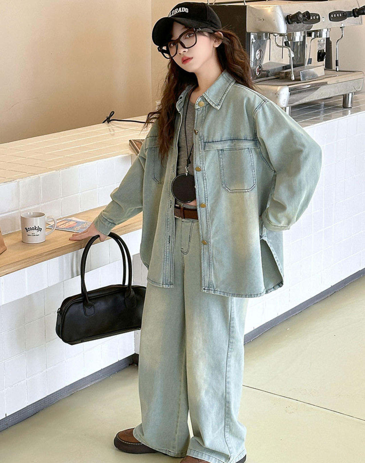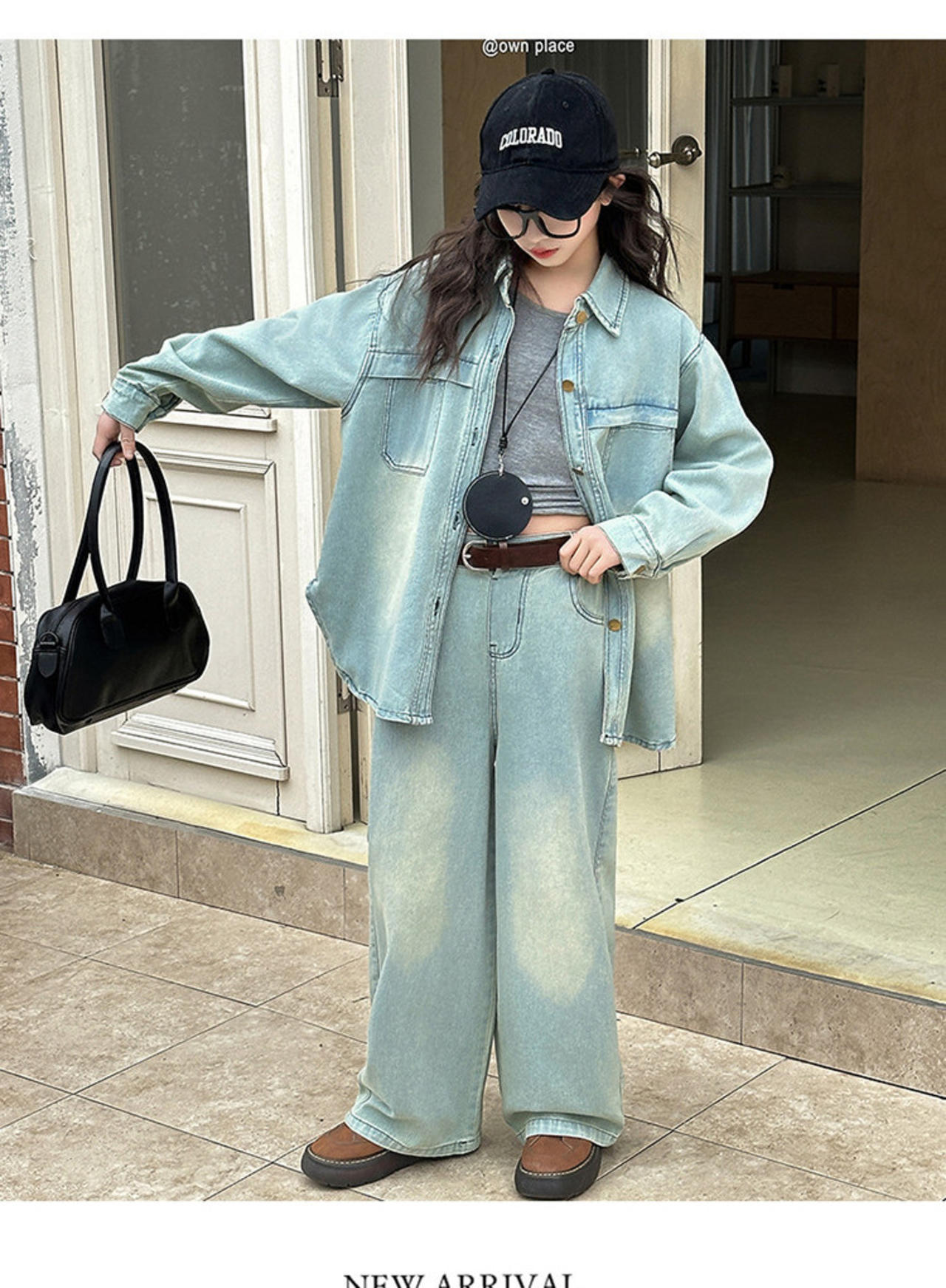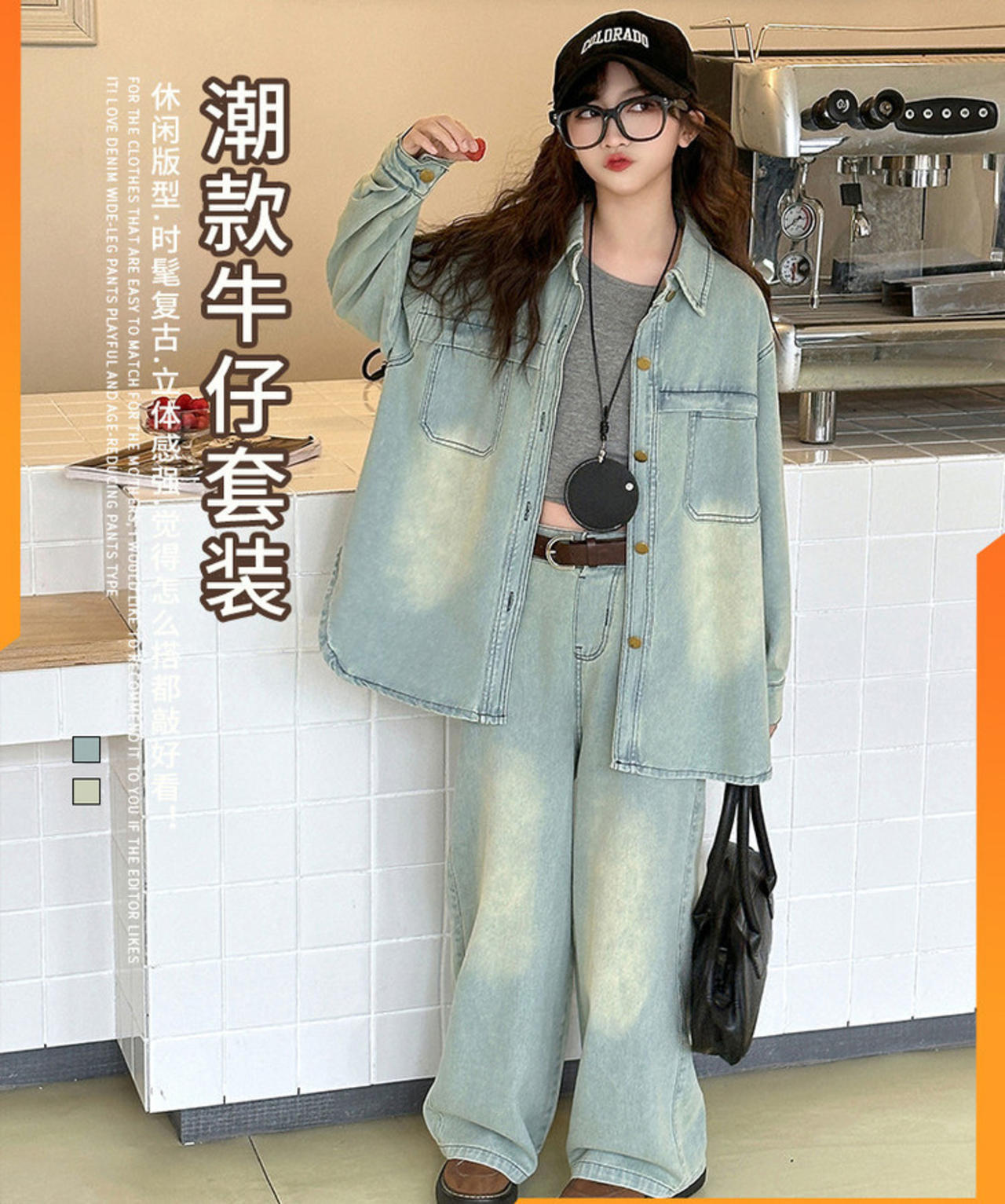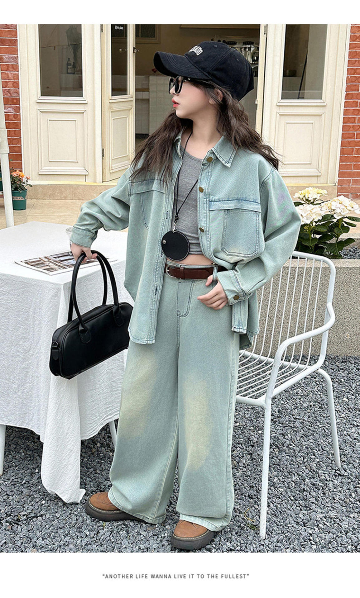 Chaqueta de mezclilla para niña Conjunto de primavera y otoño Jeans para niña grande Casual Suelto Conjunto de dos piezas con cinturón Marea