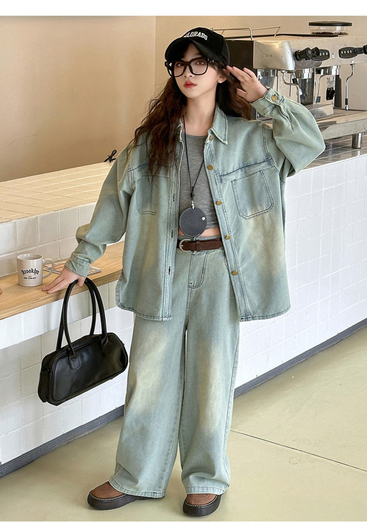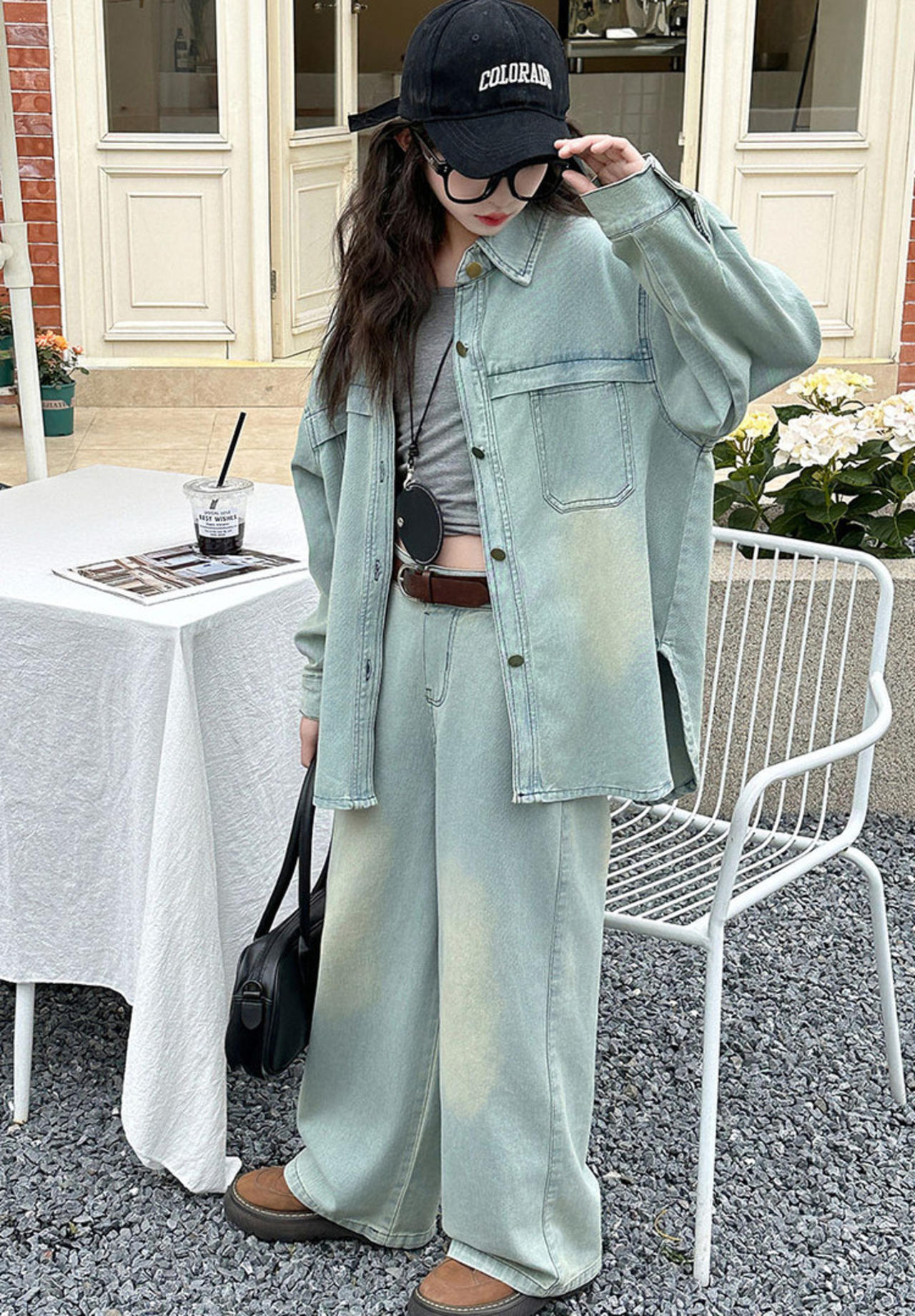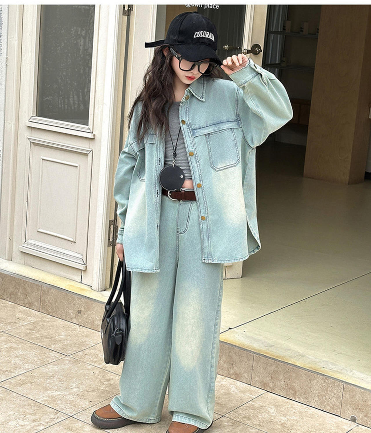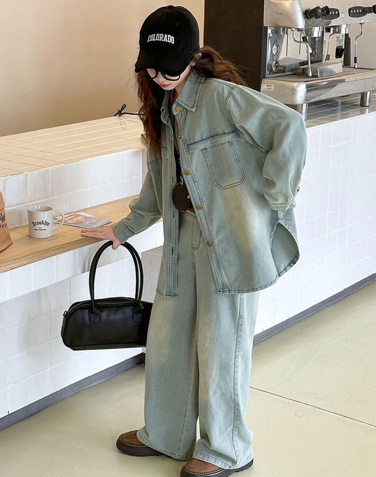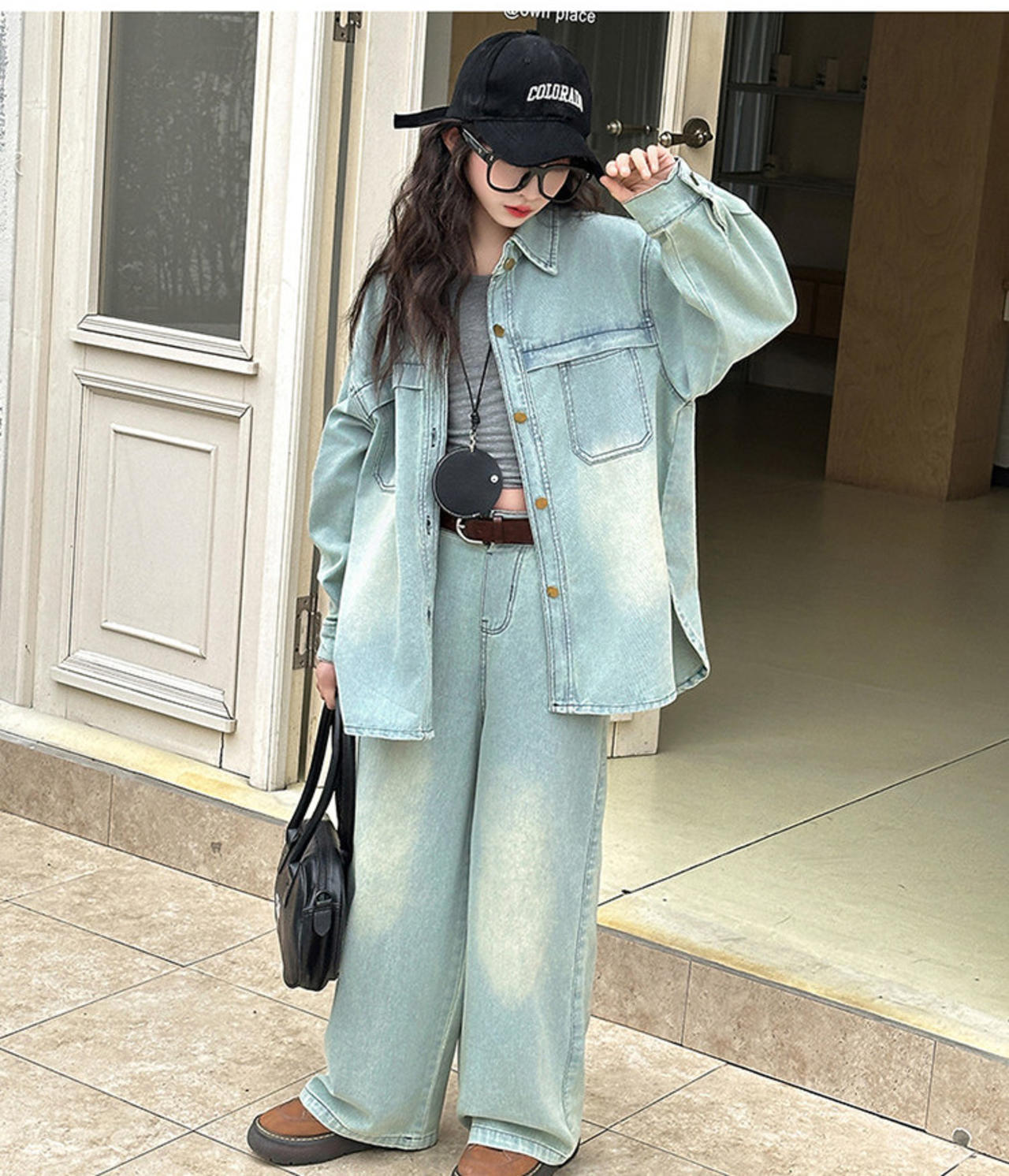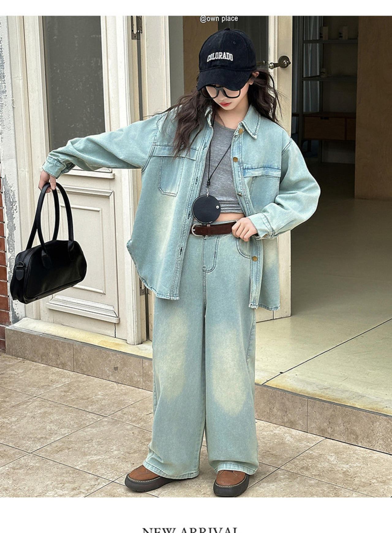 Chaqueta de mezclilla para niña Conjunto de primavera y otoño Jeans para niña grande Casual Suelto Conjunto de dos piezas con cinturón Marea