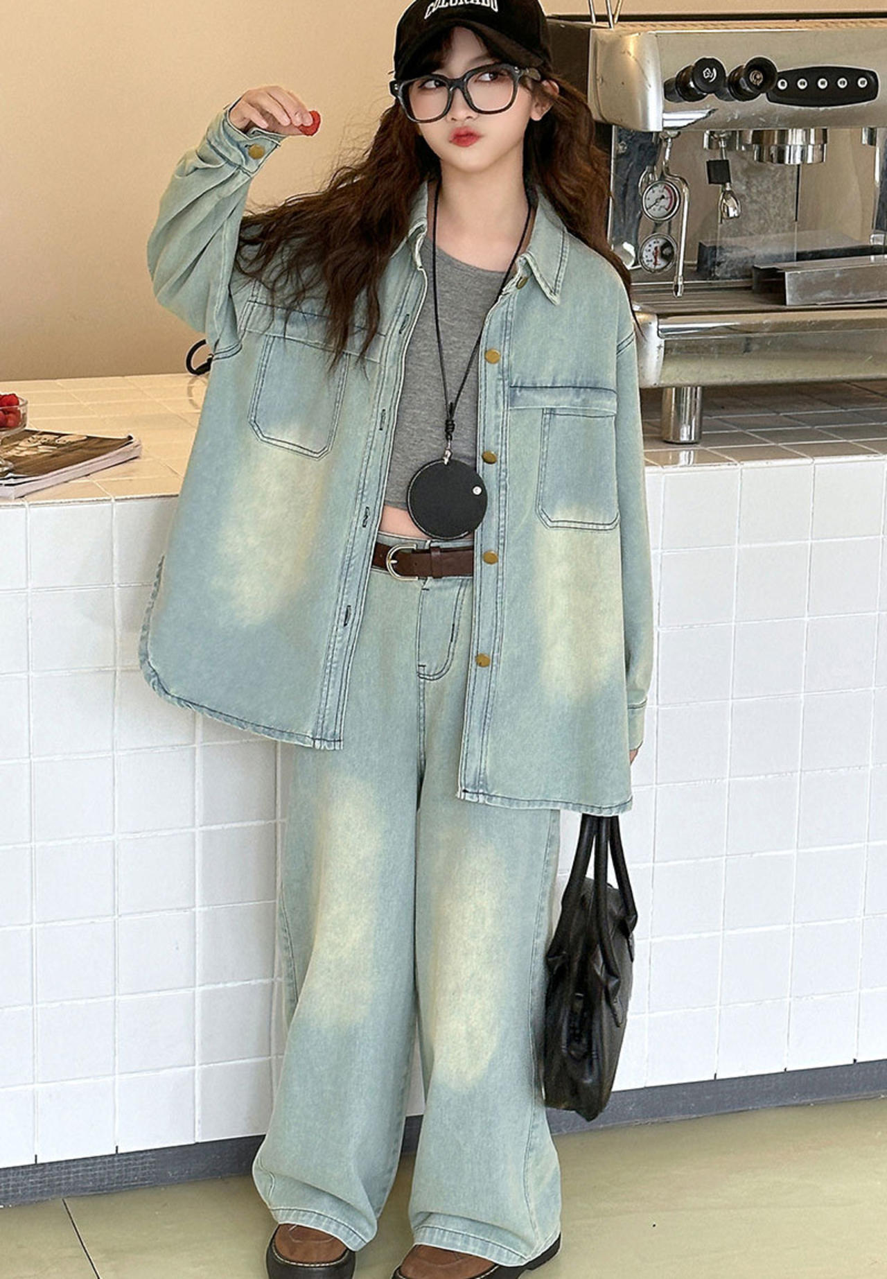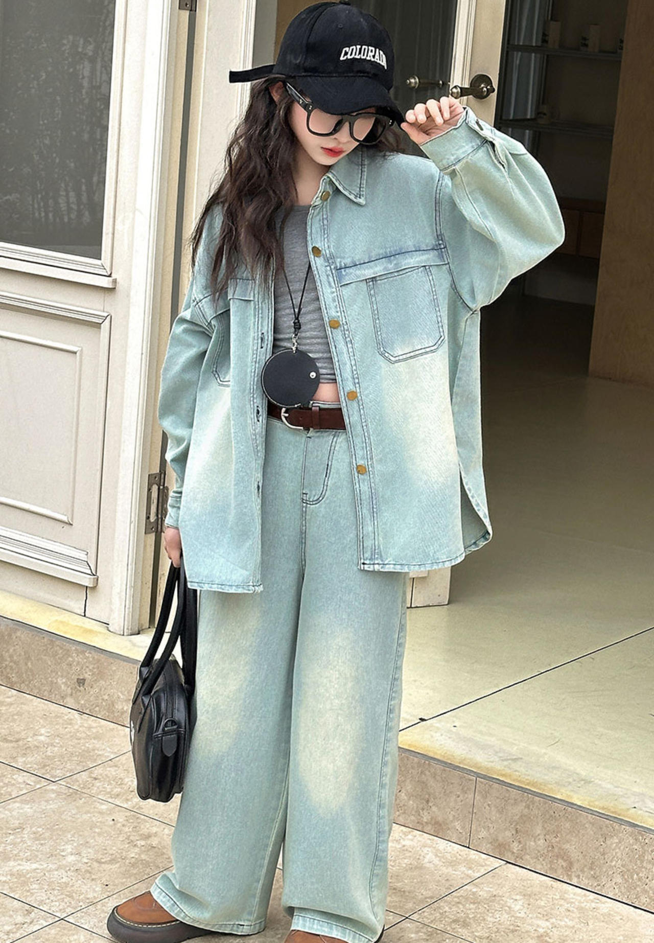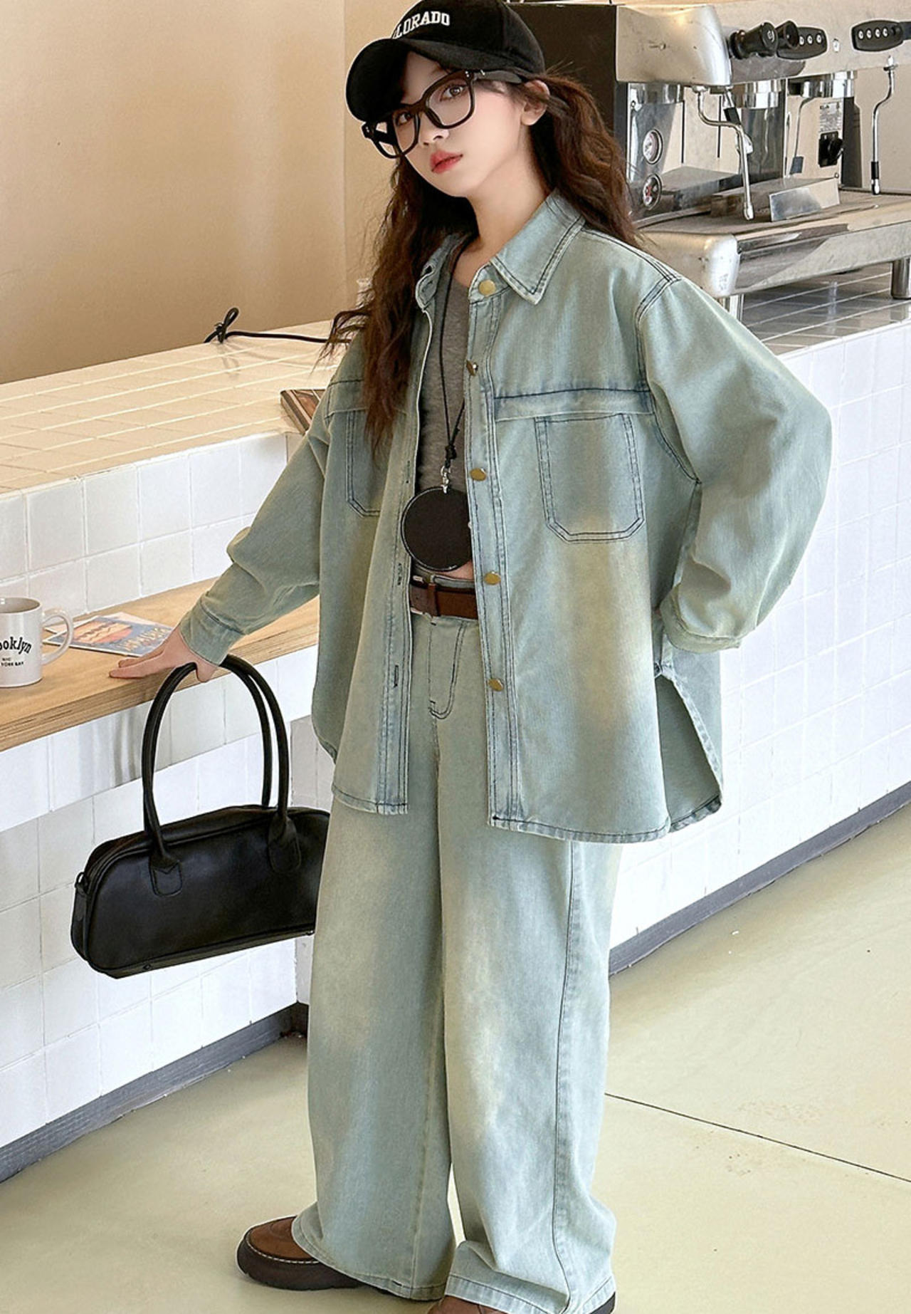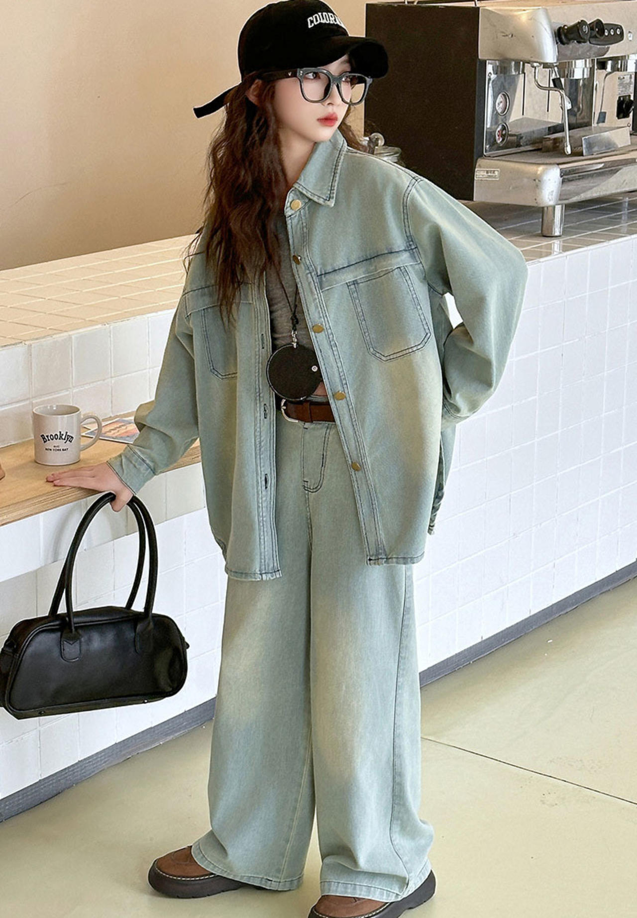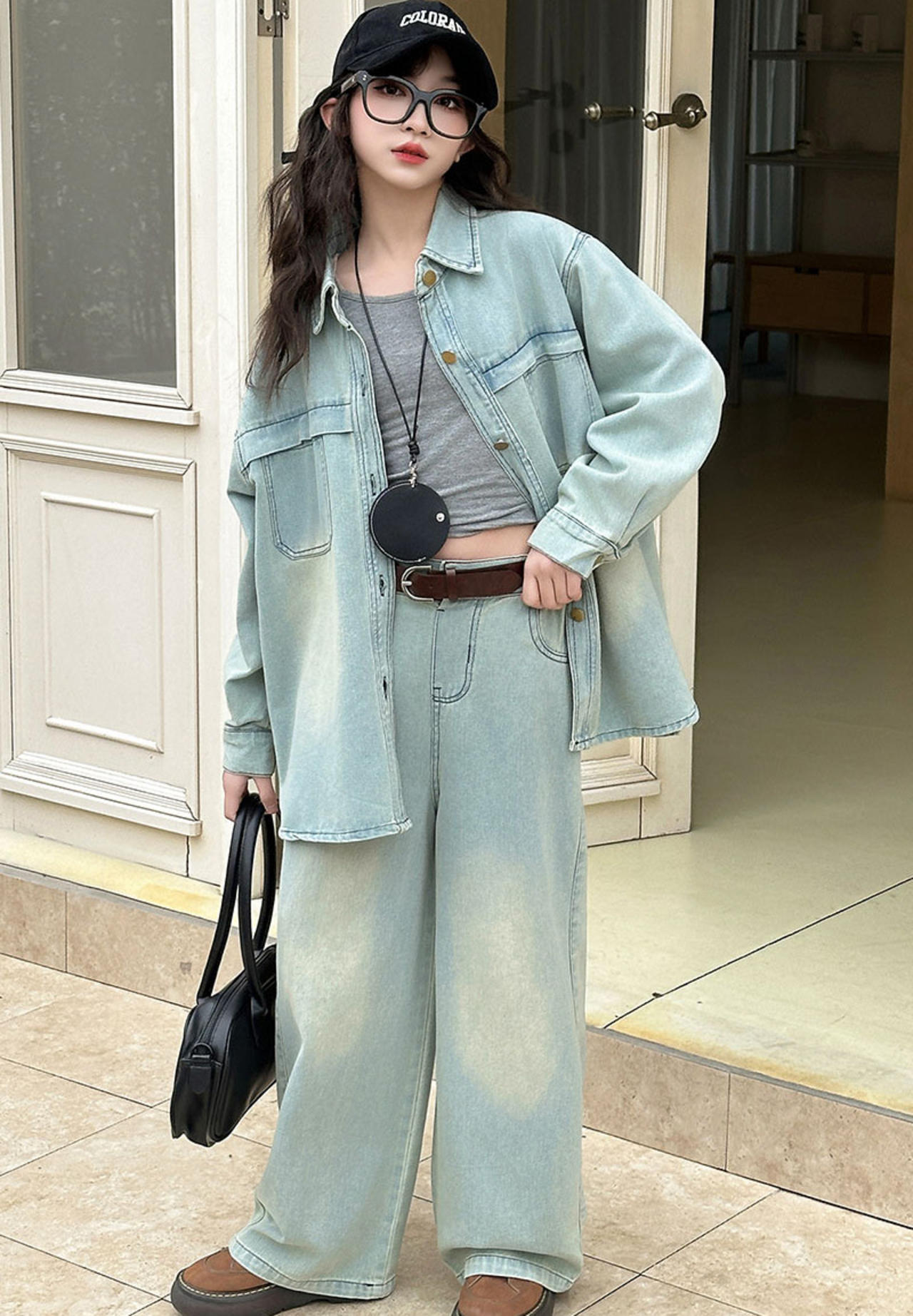 Chaqueta de mezclilla para niña Conjunto de primavera y otoño Jeans para niña grande Casual Suelto Conjunto de dos piezas con cinturón Marea