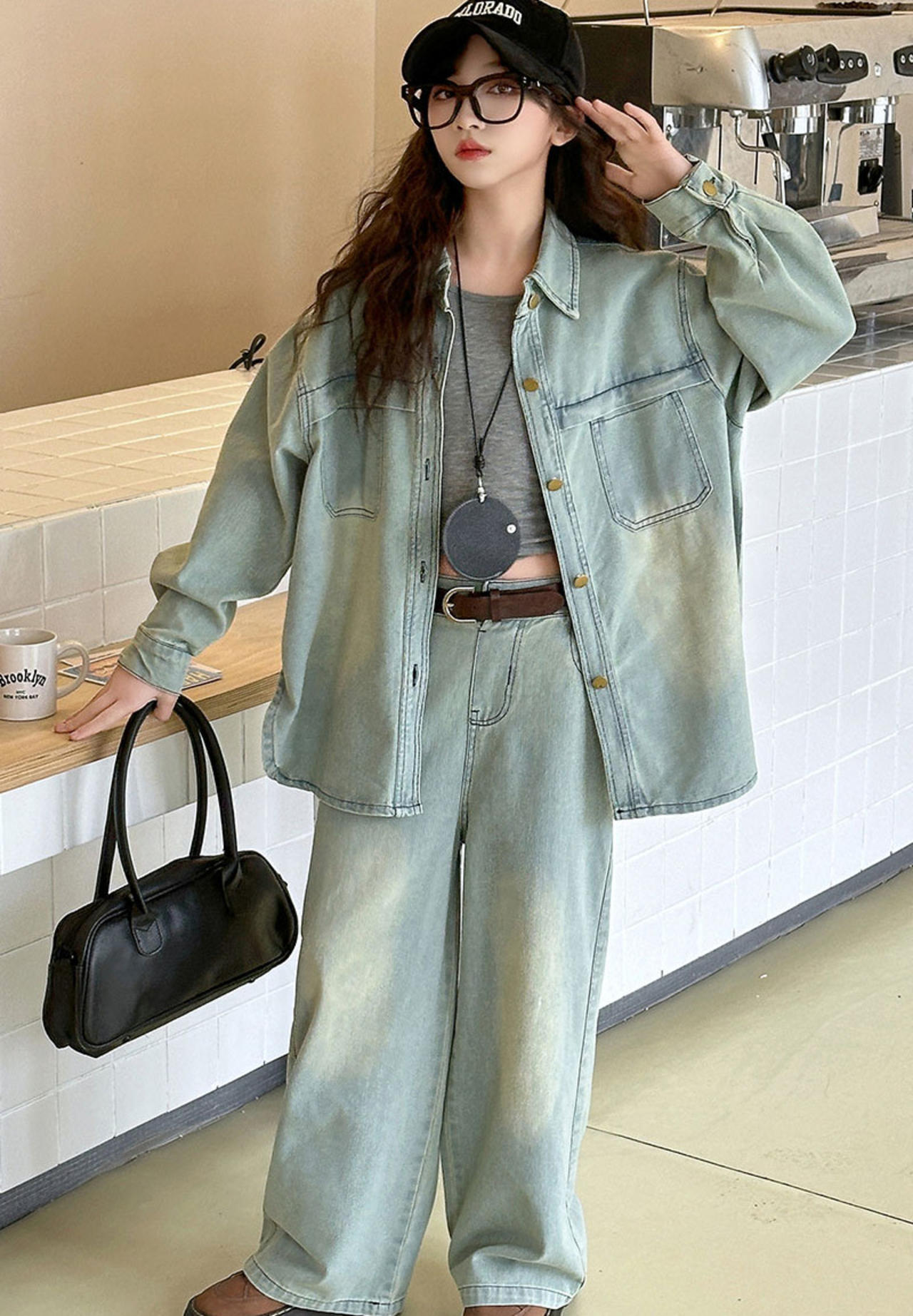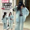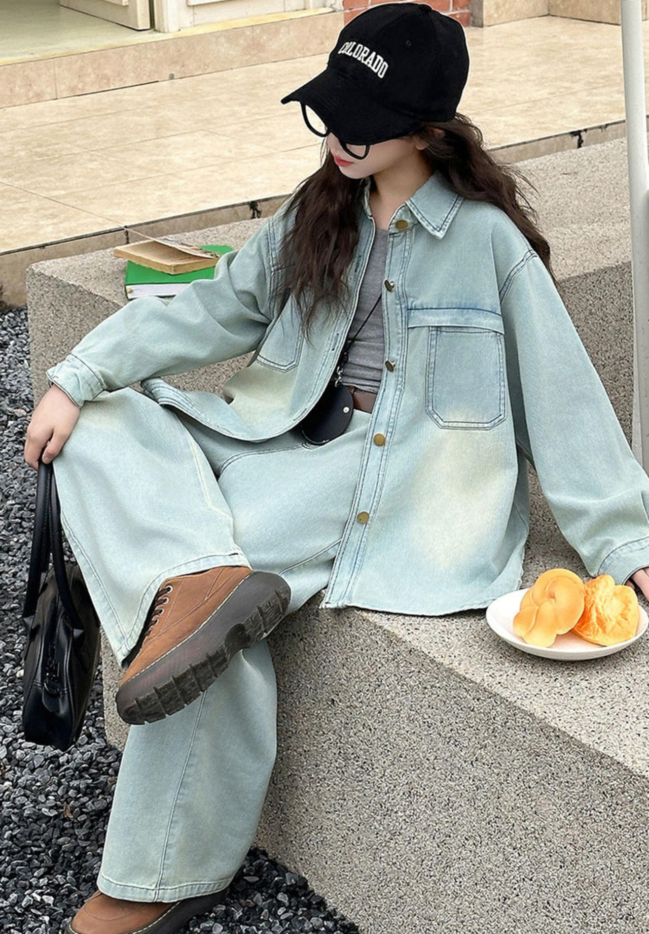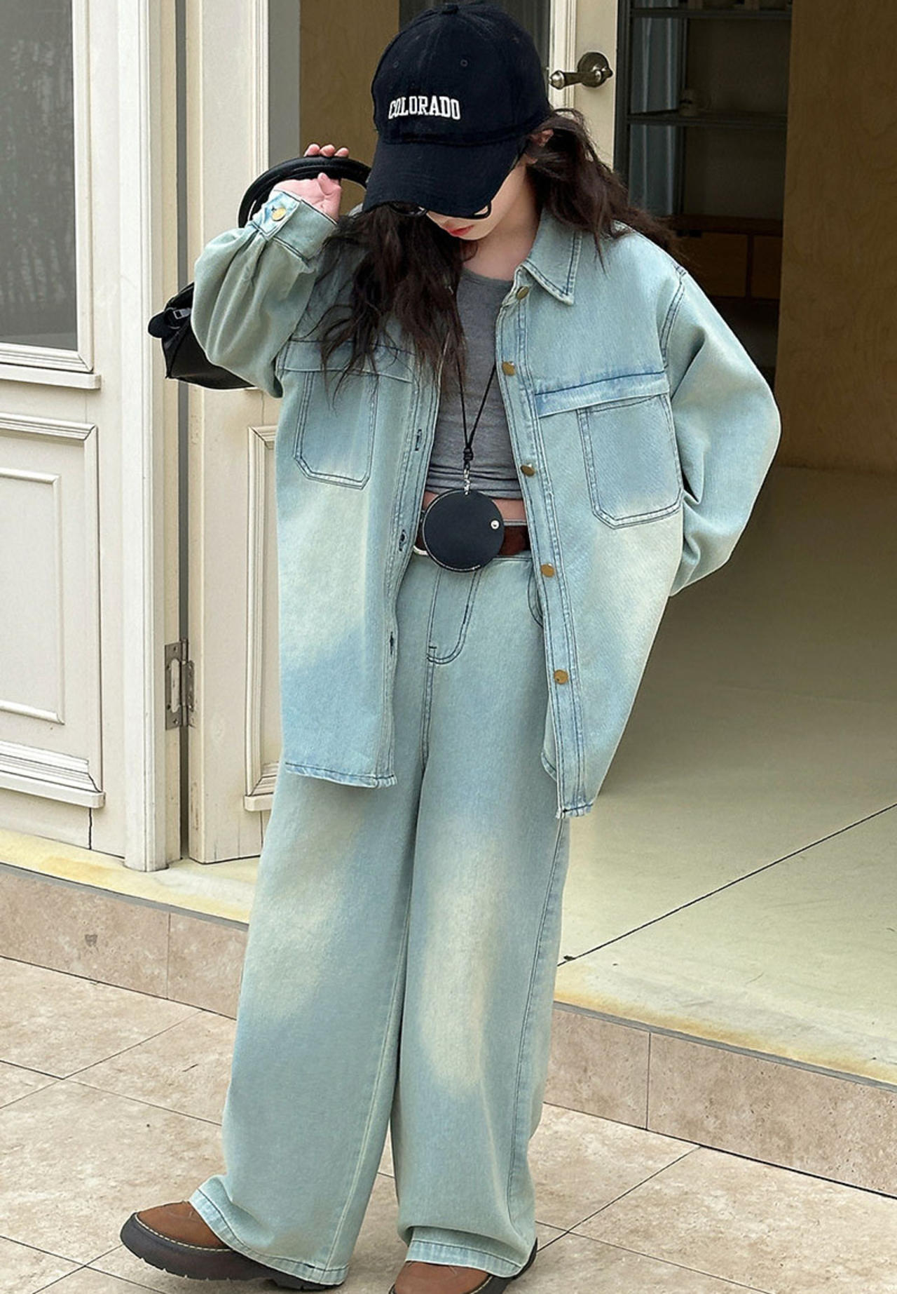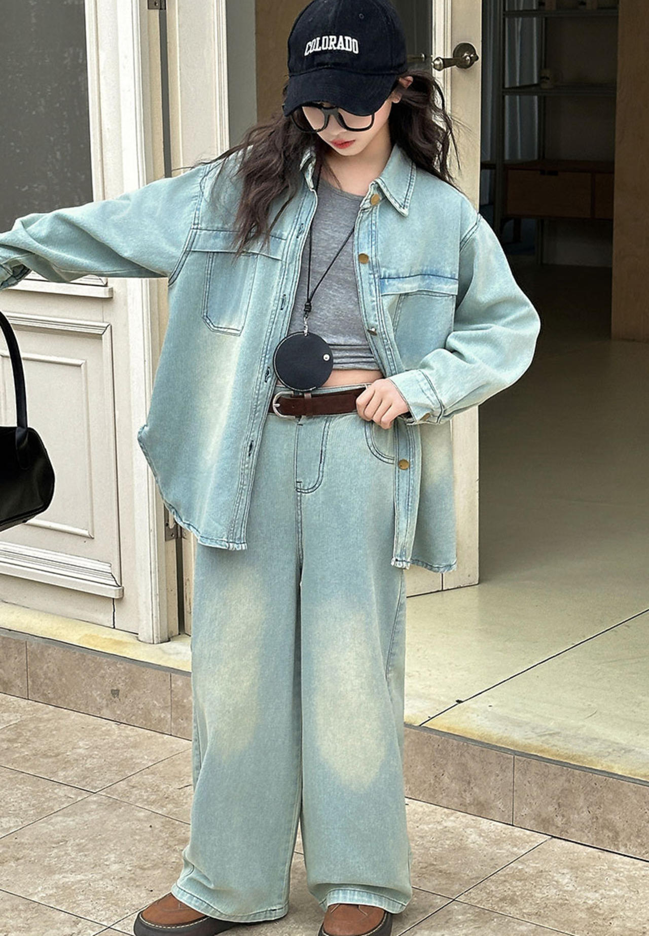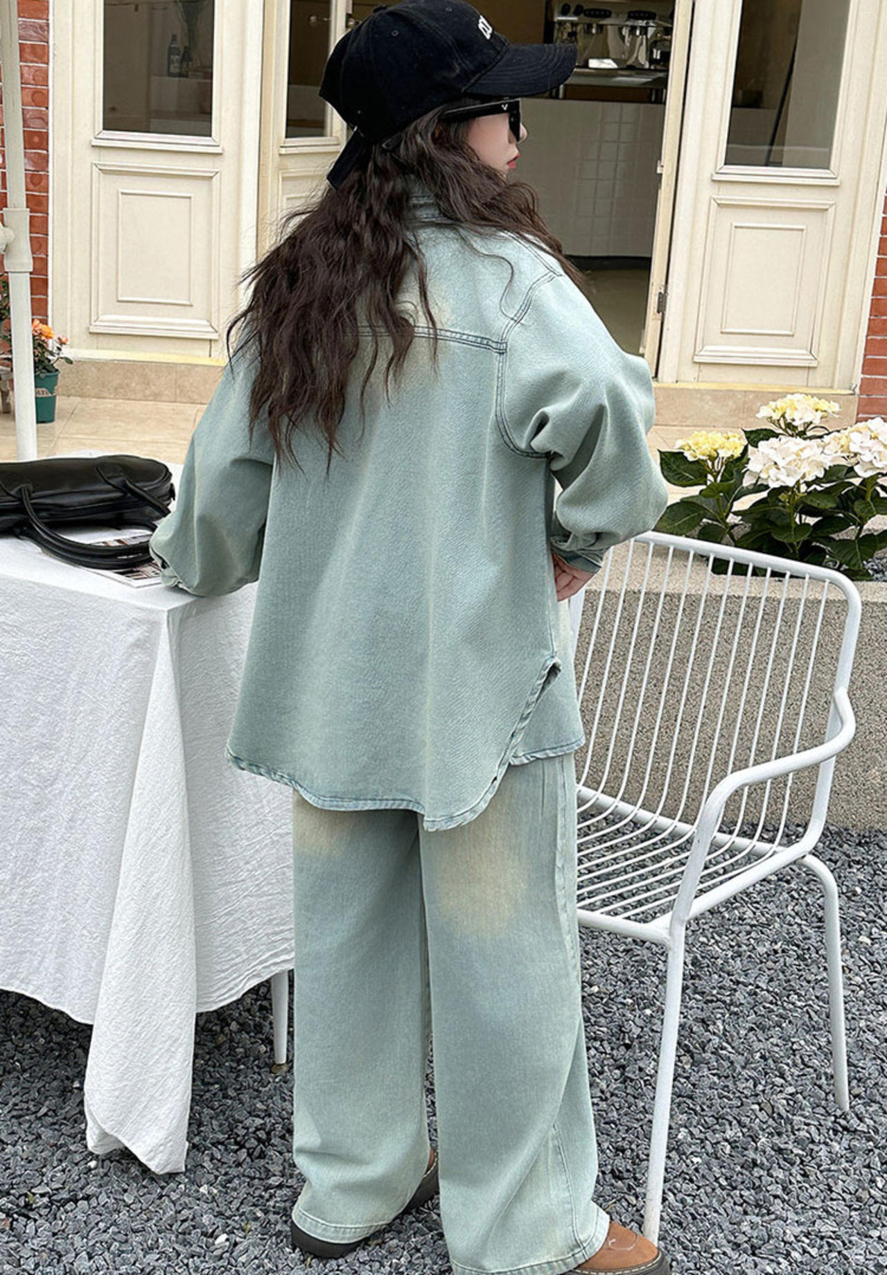 Chaqueta de mezclilla para niña Conjunto de primavera y otoño Jeans para niña grande Casual Suelto Conjunto de dos piezas con cinturón Marea