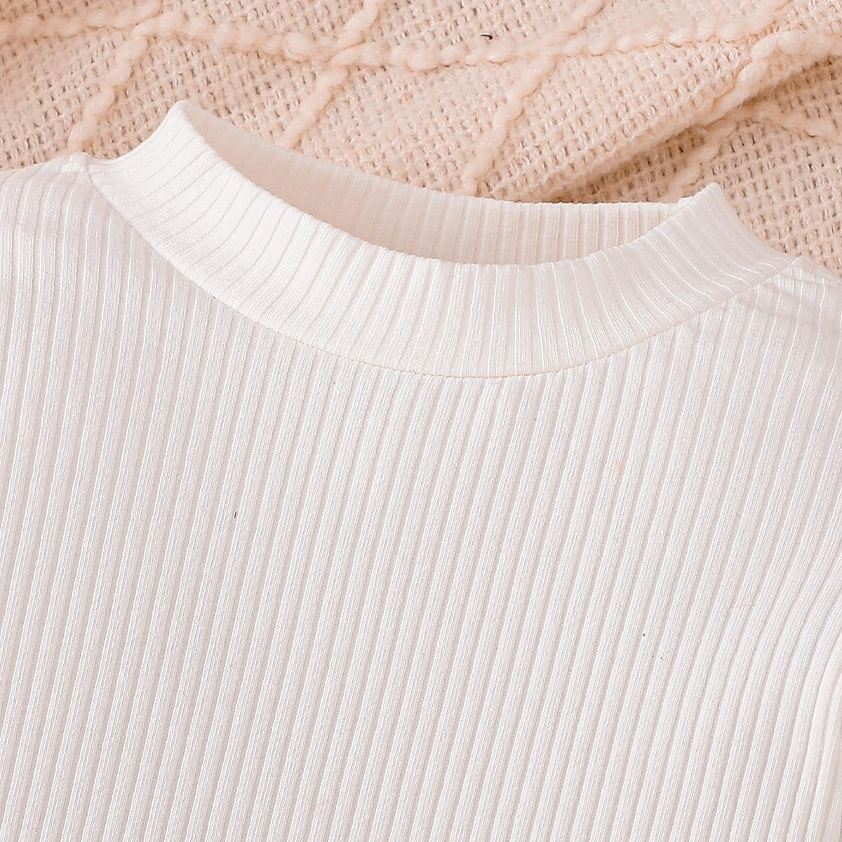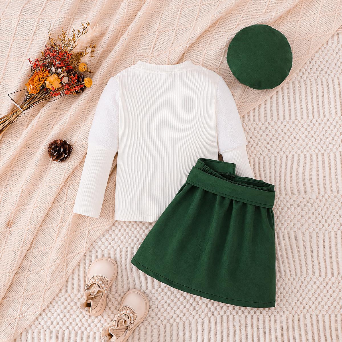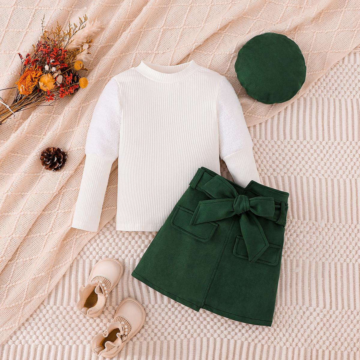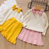 Ropa Infantil Nueva de Primavera y Otoño para Niños Pequeños y Medianos Color Sólido Lindo Manga Larga con Borde Irregular Conjunto de Falda Corta con Lazo y Sombrero