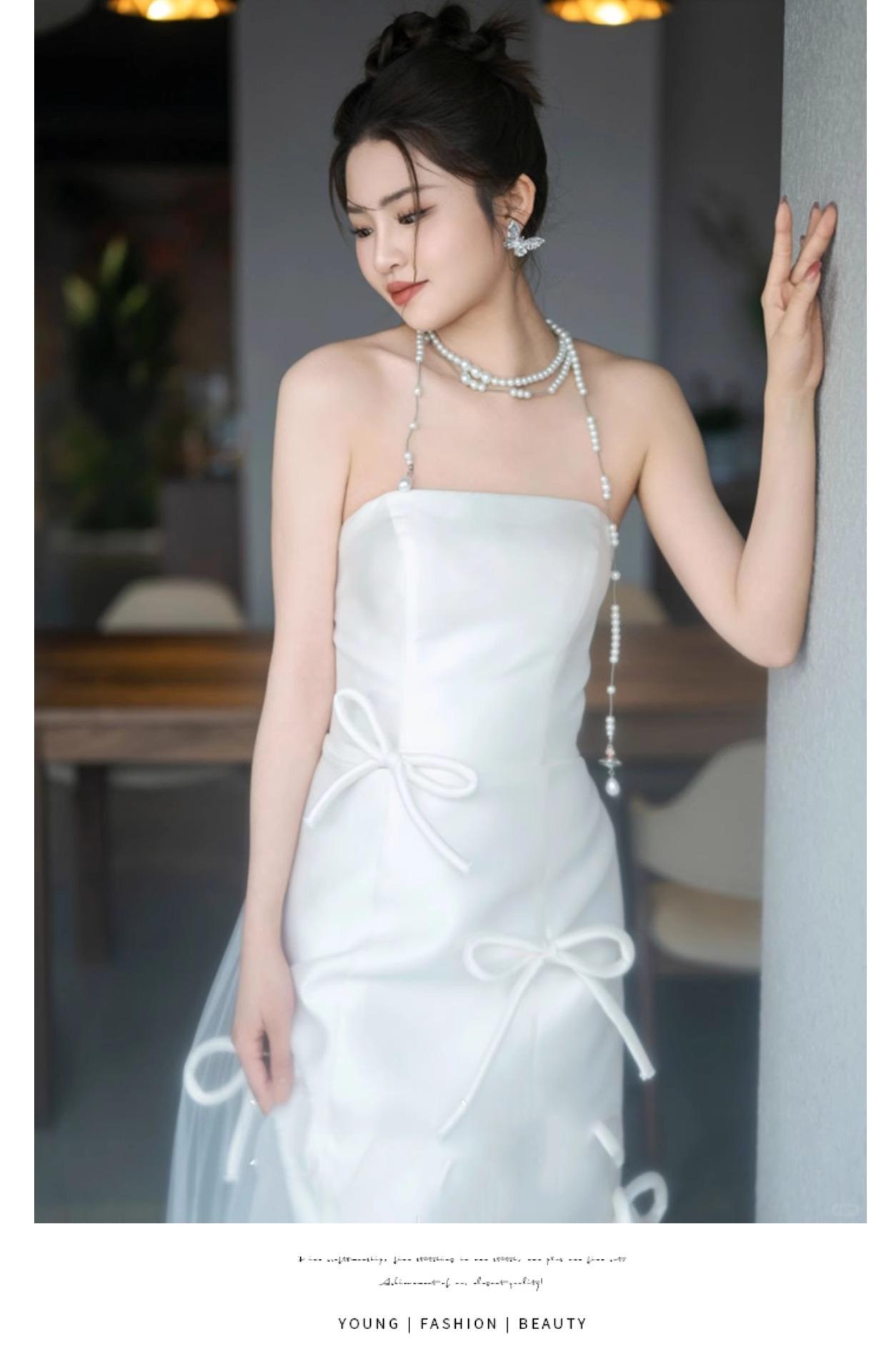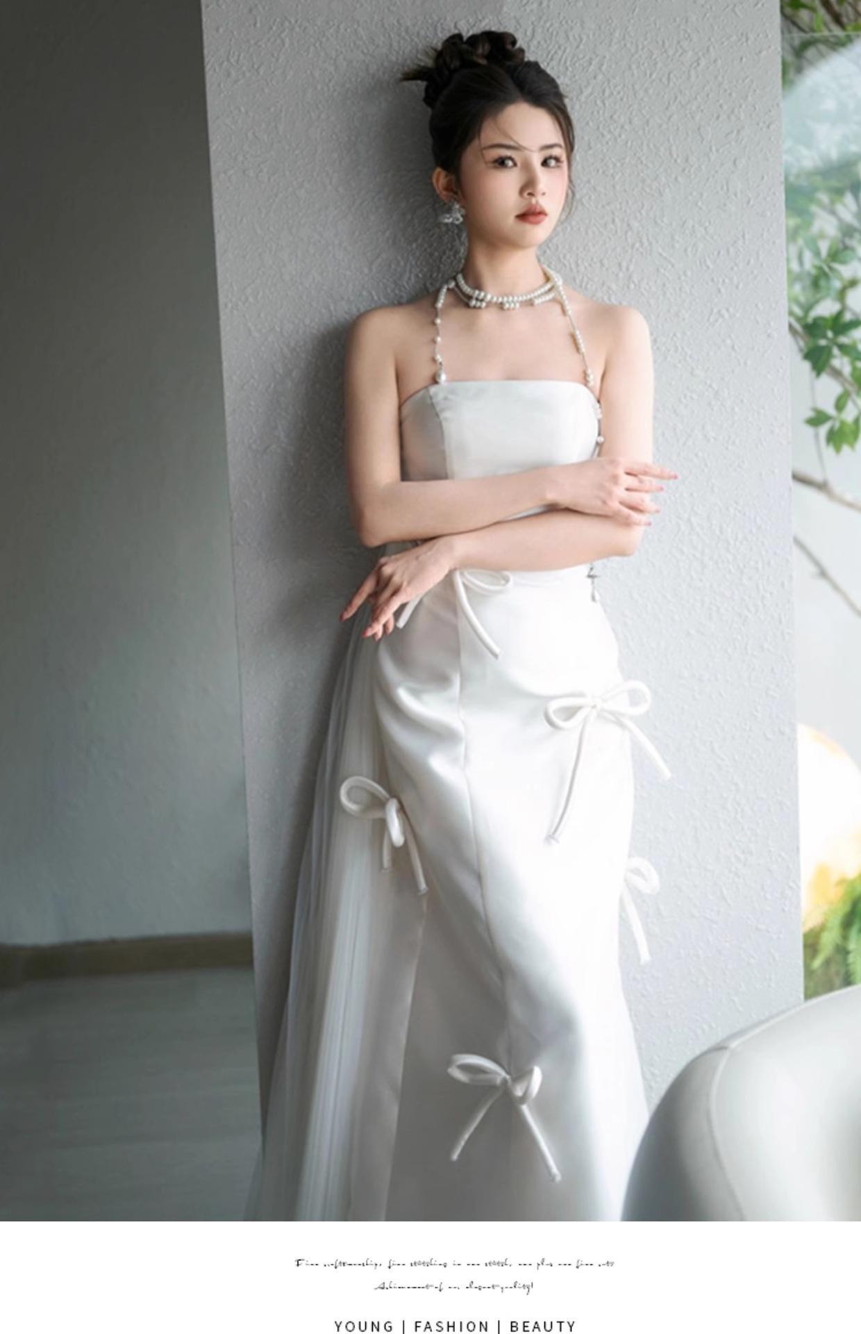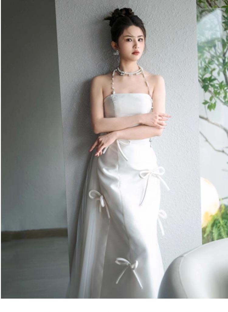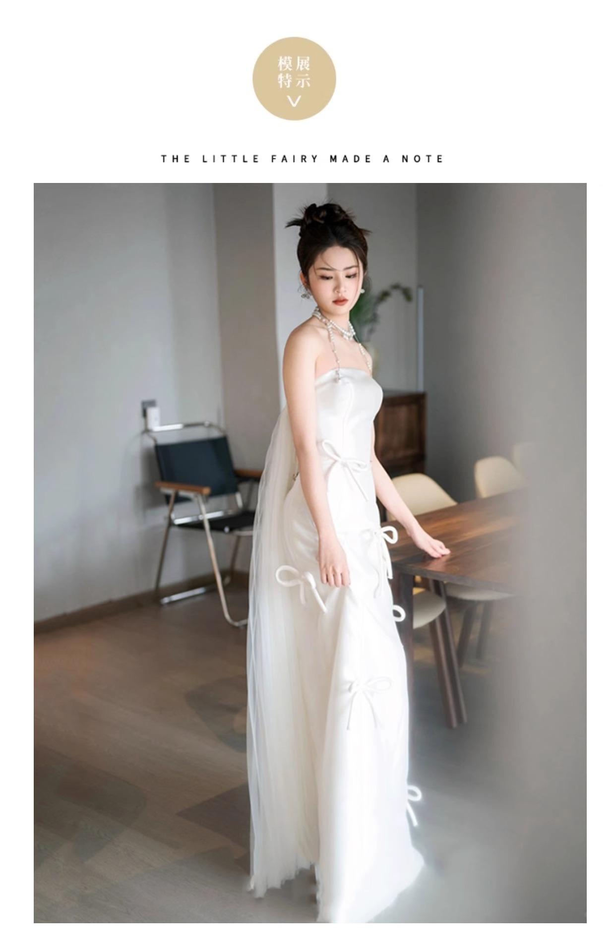 Vestido de Novia Ligero de Satén Francés Novia Sencillo Elegante Strapless Vestido Cola de Pez Blanco Vestido con Lazo para Petite