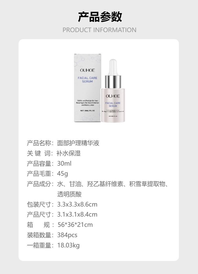 Esencia para el cuidado facial OUHOE con ingredientes botánicos que hidratan y humectan la piel. Esencia rejuvenecedora y mejoradora de la piel.