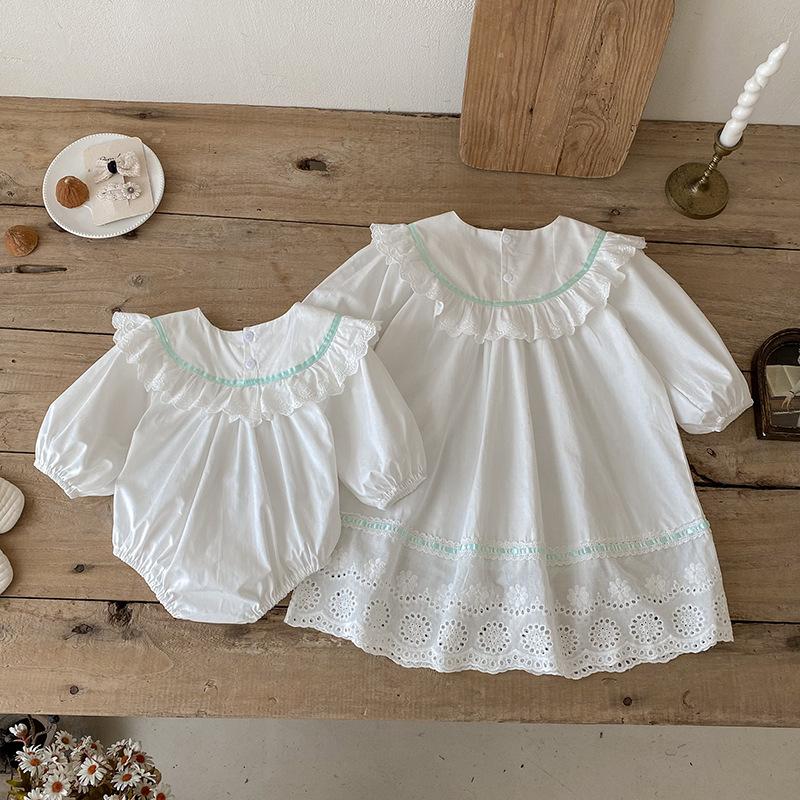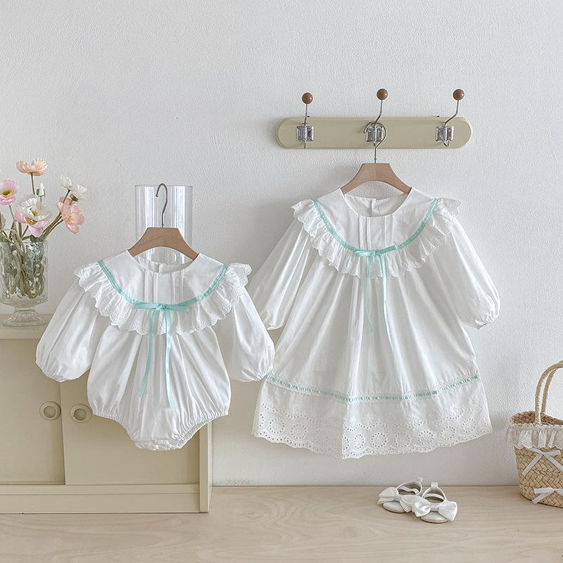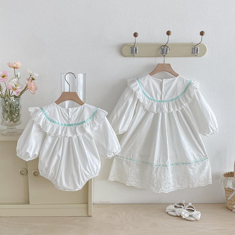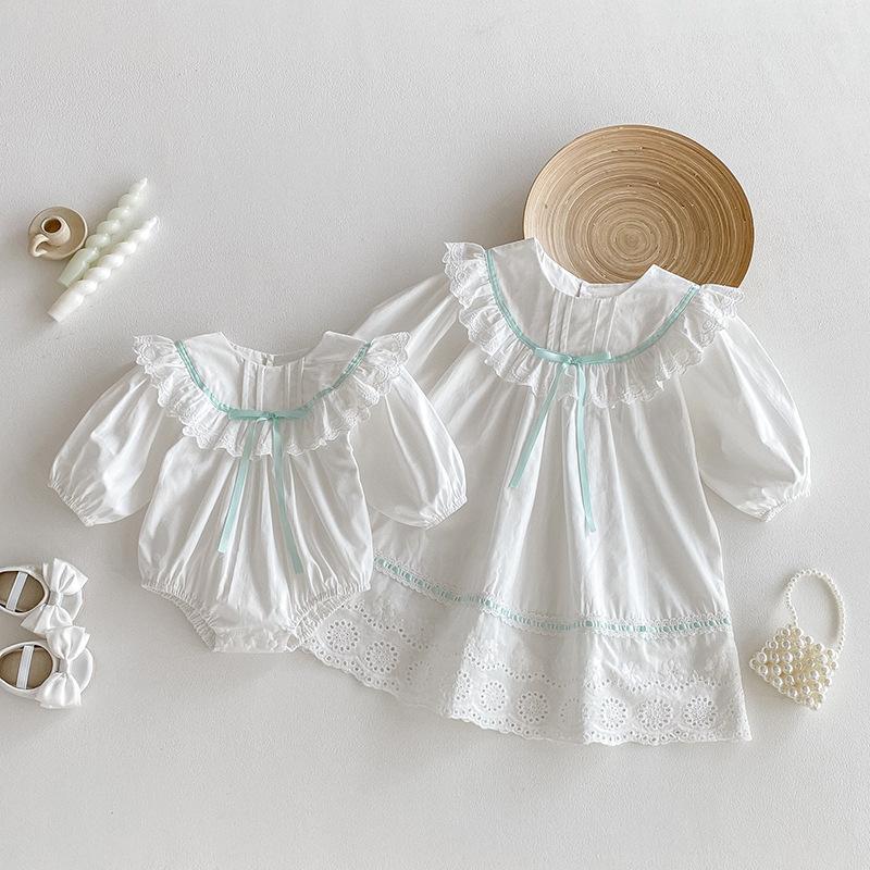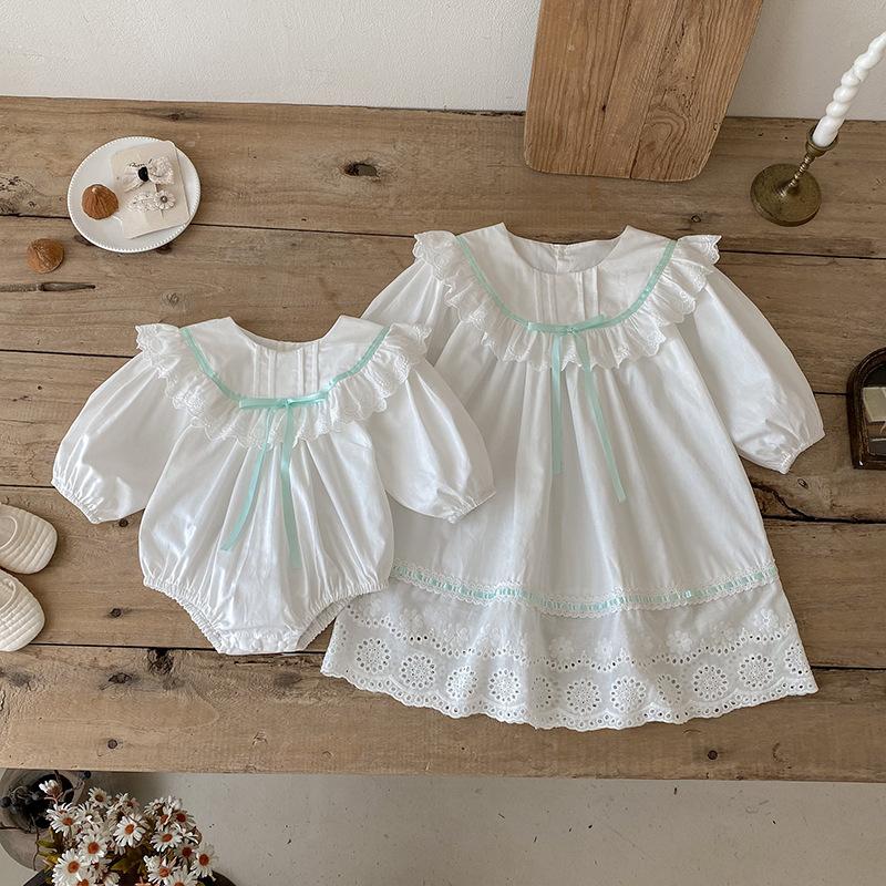 Ropa de bebé otoño nuevo estilo coreano niña pelele de bebé vestido de manga larga niña encaje estilo Mori conjunto de hermana