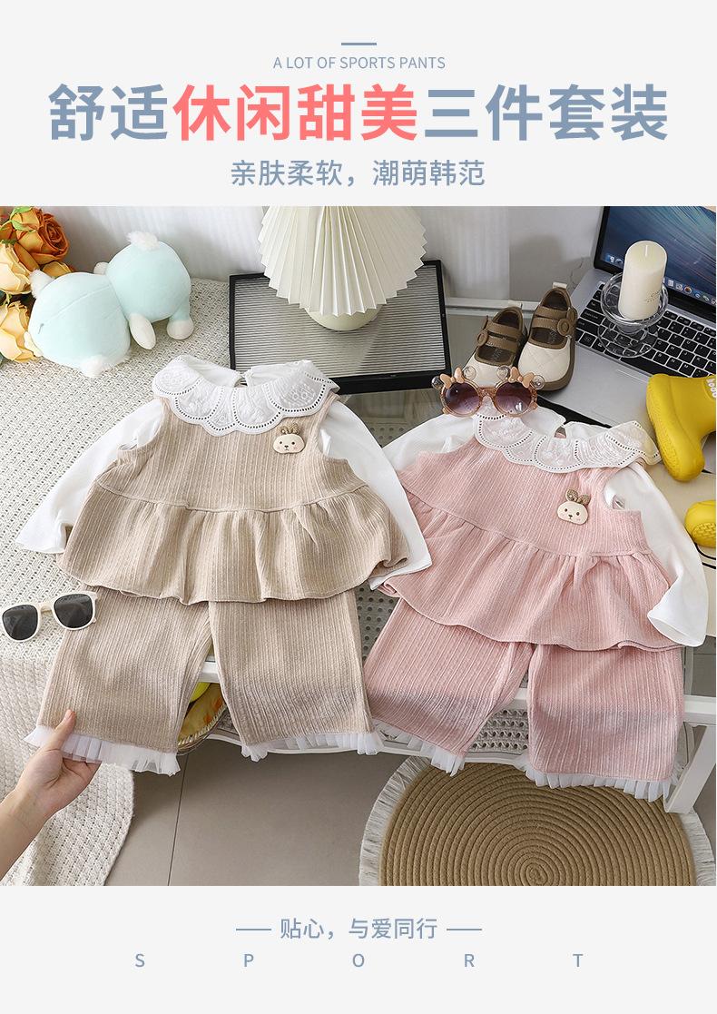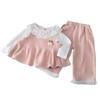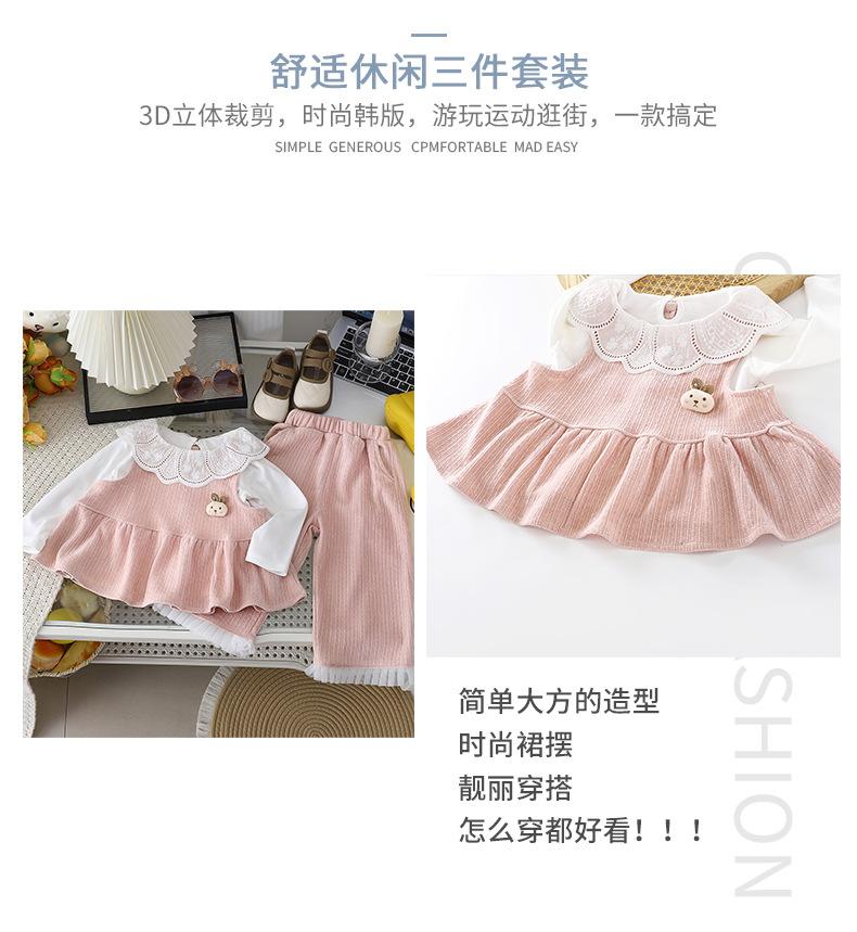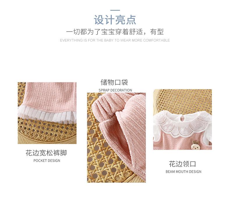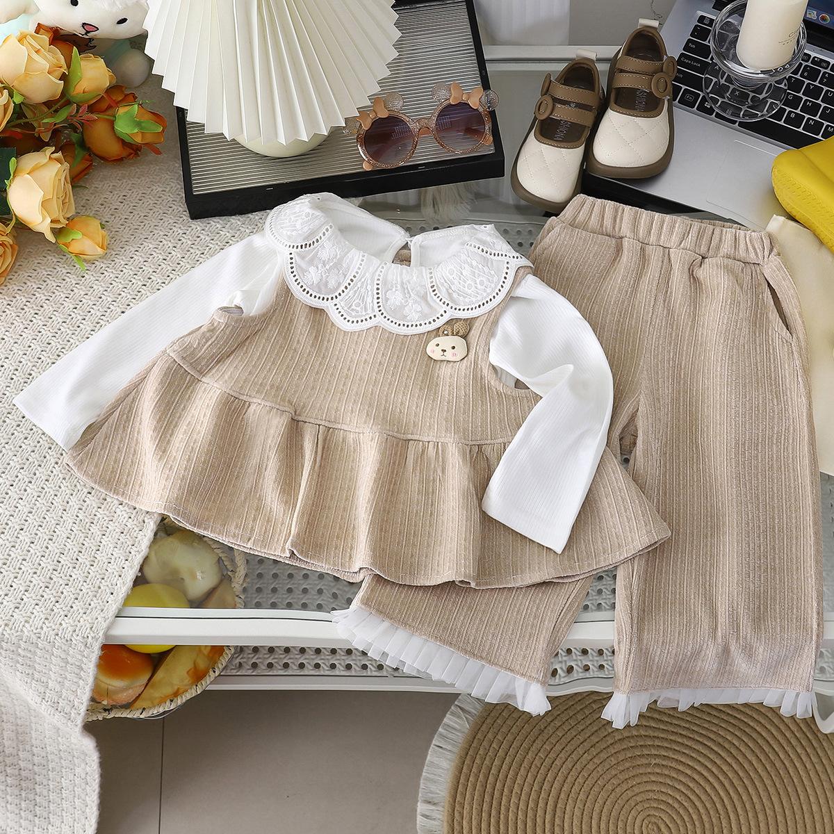 Nuevo Conjunto de Chenilla para Niños Otoño Niñas Dulce Cuello de Encaje Conjunto de Tres Piezas Bebé Borde de Encaje Dibujos Animados Ropa de Otoño