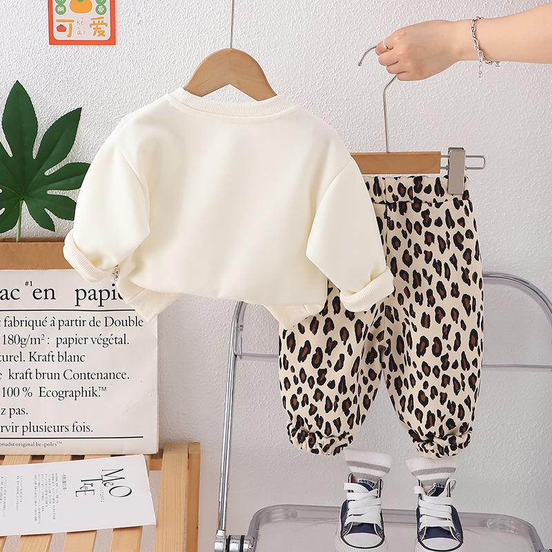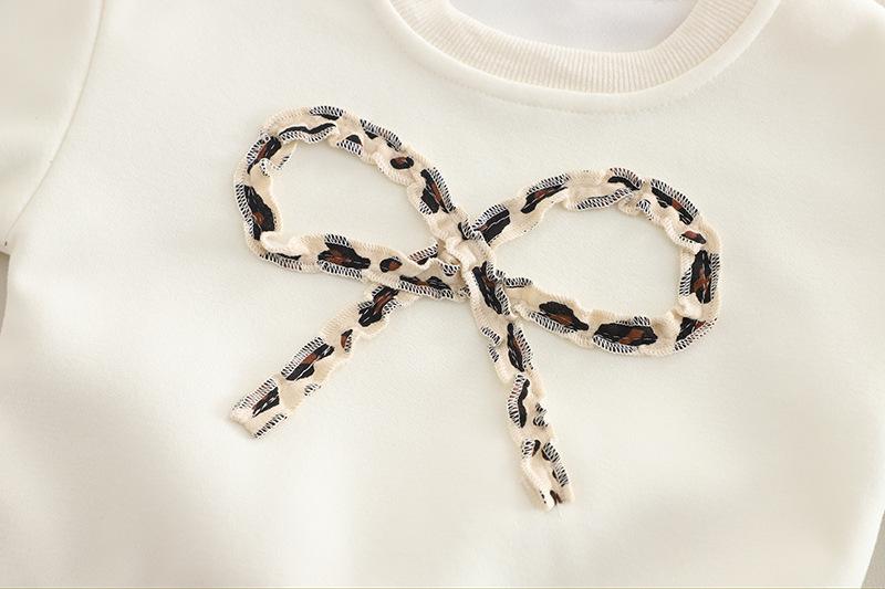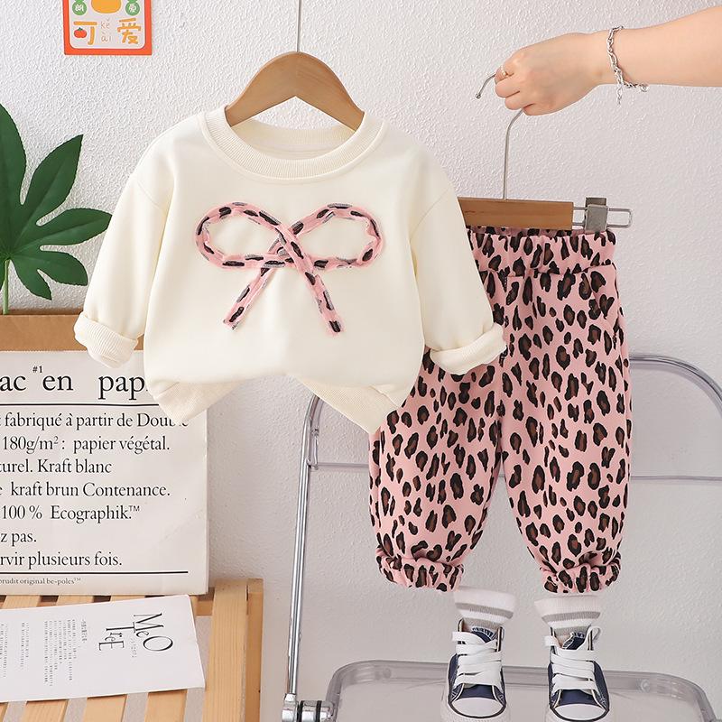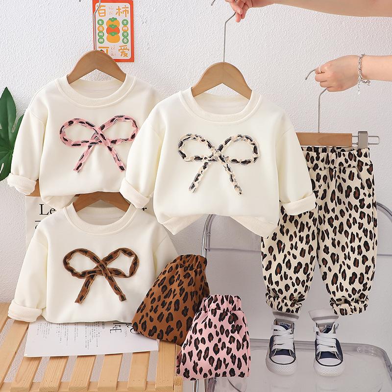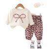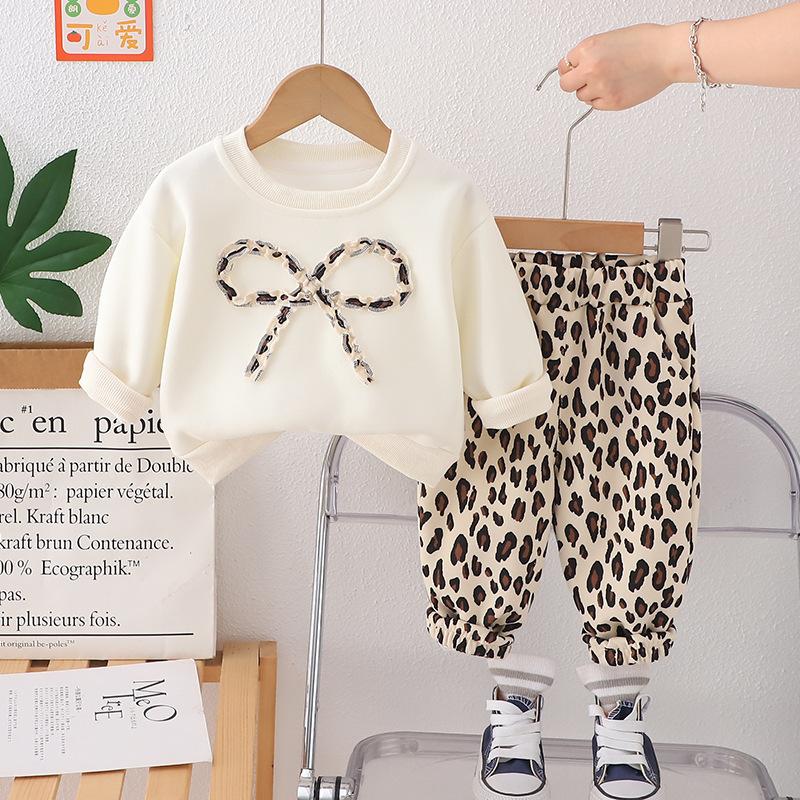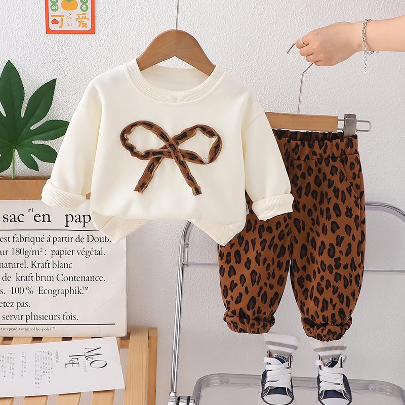 Conjunto de dos piezas para niñas a la moda 2025 Nuevo Bebé Trendy Otoño Estilo Coreano Estampado de Leopardo Lazo Sudadera Ropa Casual de Otoño