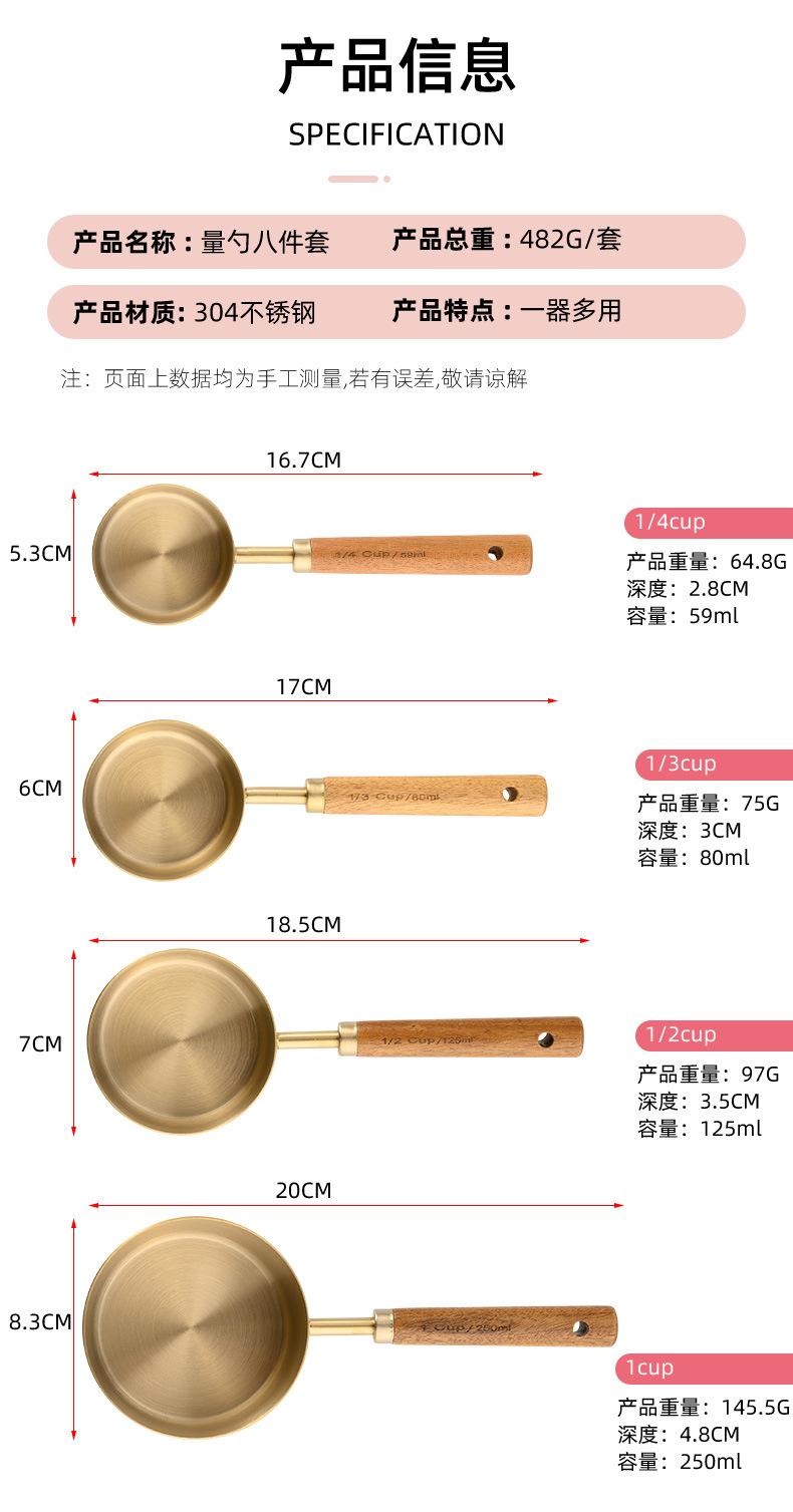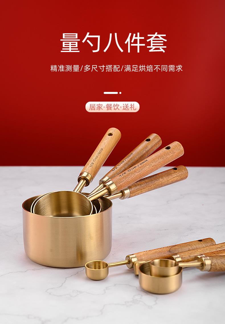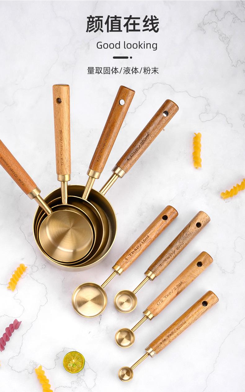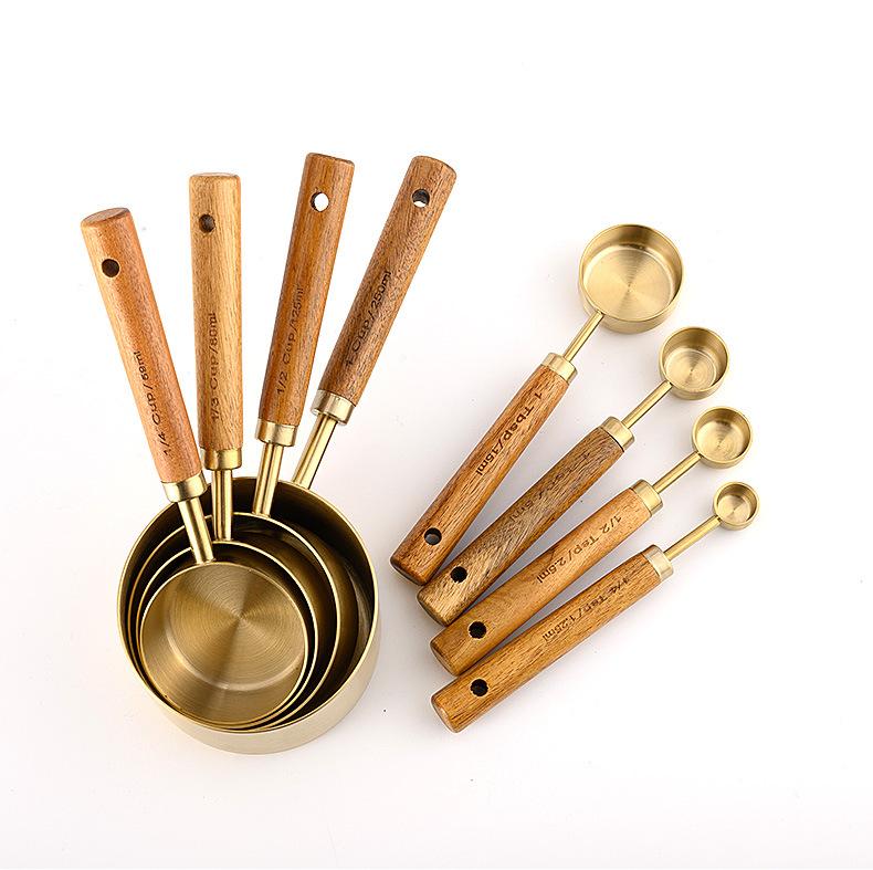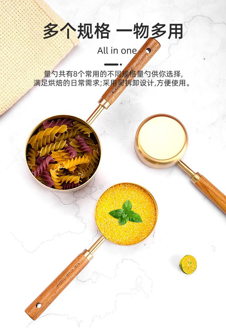 Taza Medidora de Acero Inoxidable Cuchara Medidora Juego de 8 Piezas Utensilios para Hornear con Cuchara Medidora Graduada Mango de Nogal Cuchara Medidora Oro Rosa