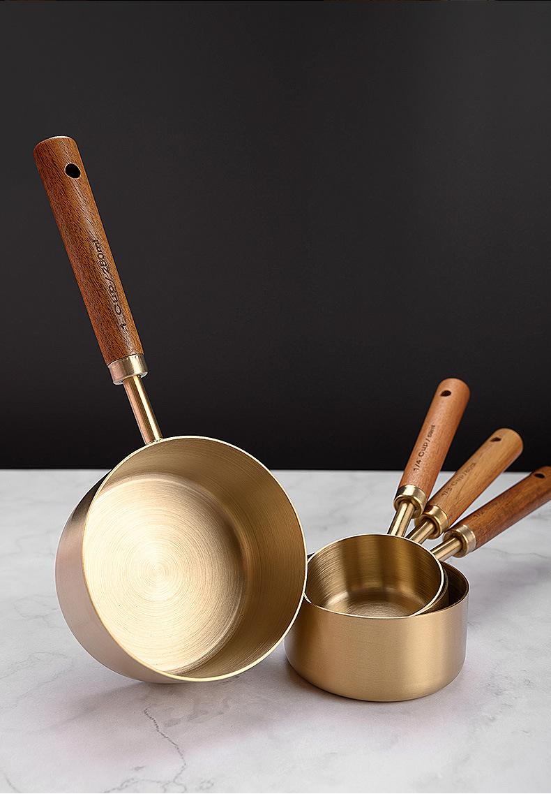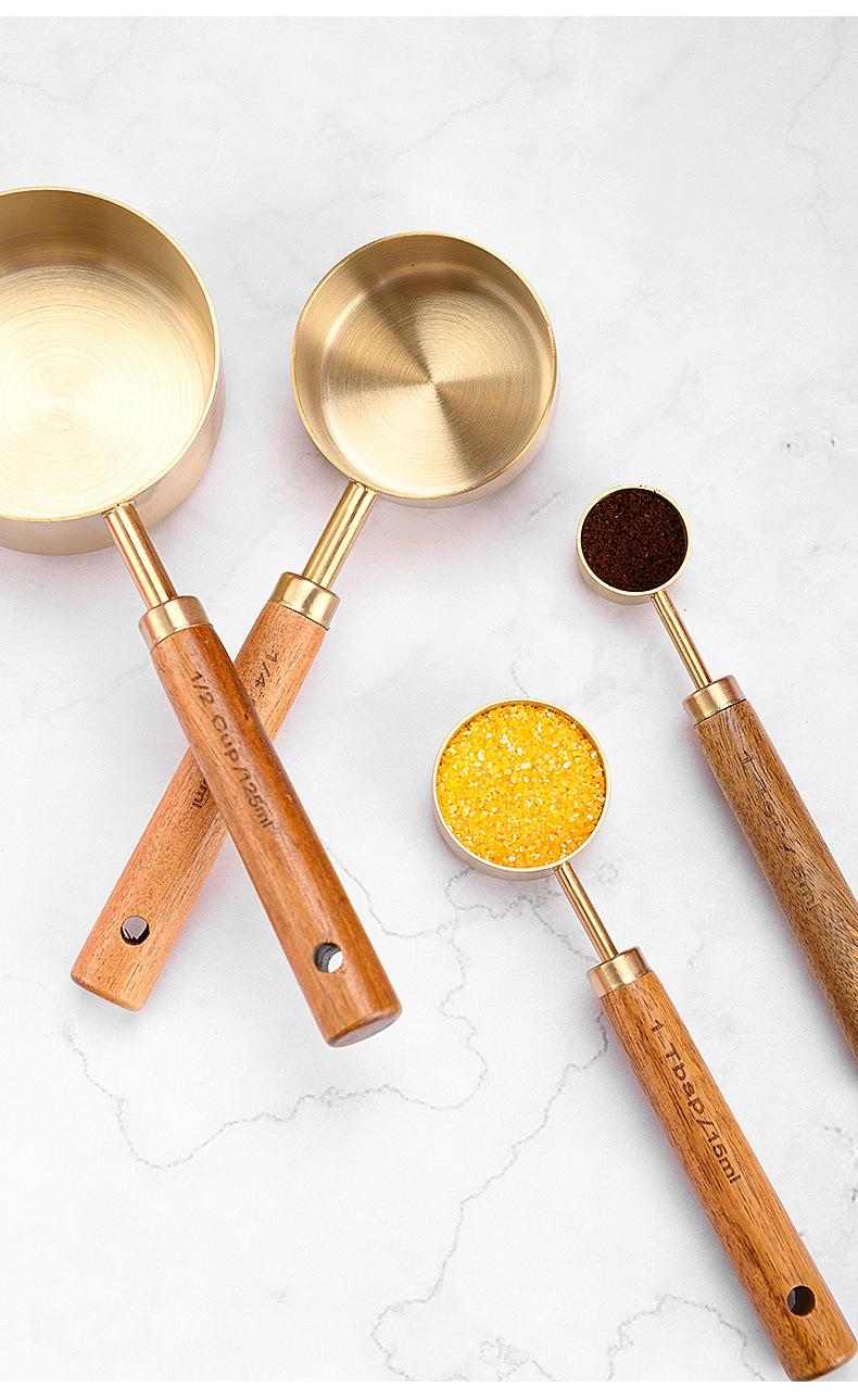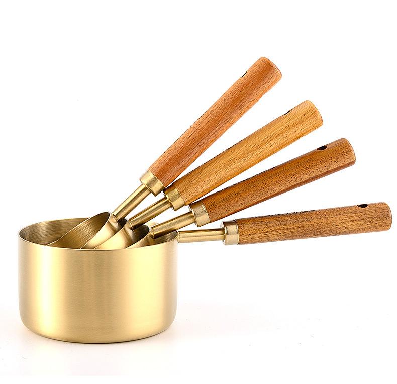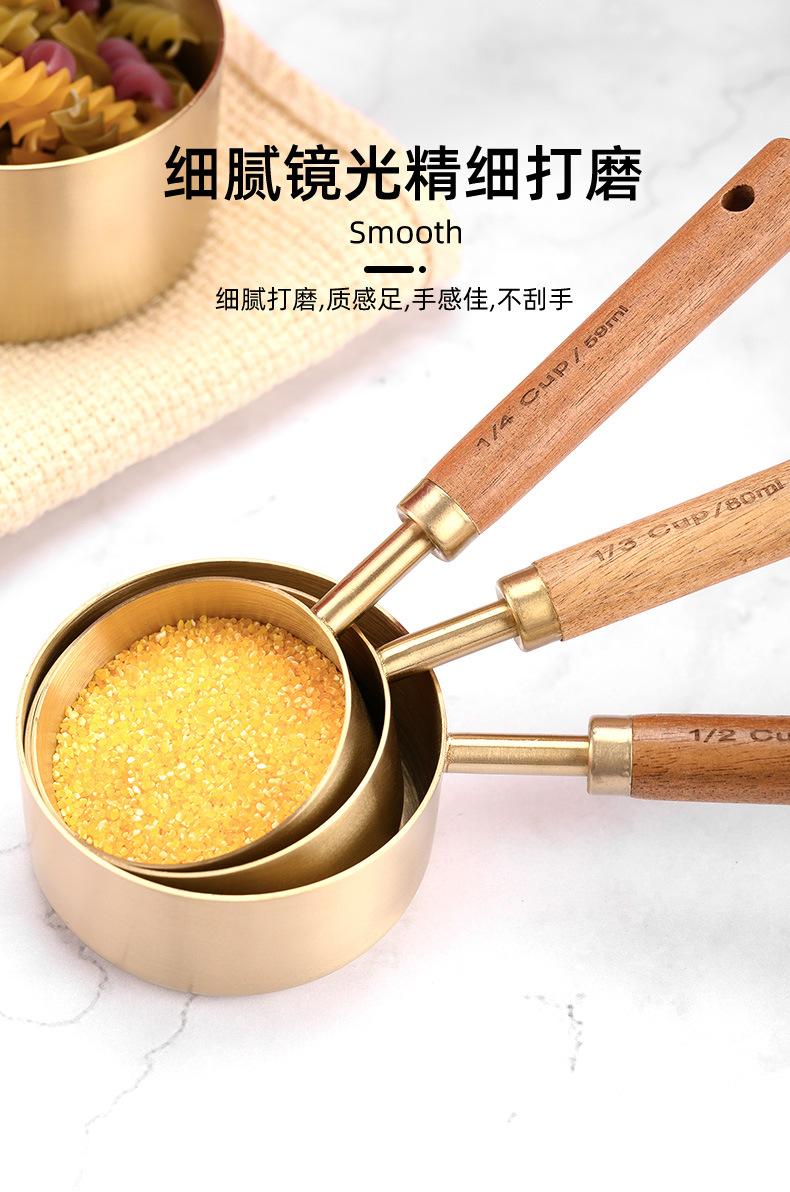Taza Medidora de Acero Inoxidable Cuchara Medidora Juego de 8 Piezas Utensilios para Hornear con Cuchara Medidora Graduada Mango de Nogal Cuchara Medidora Oro Rosa