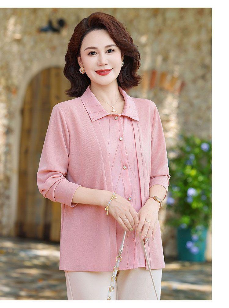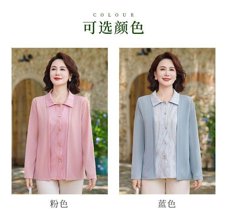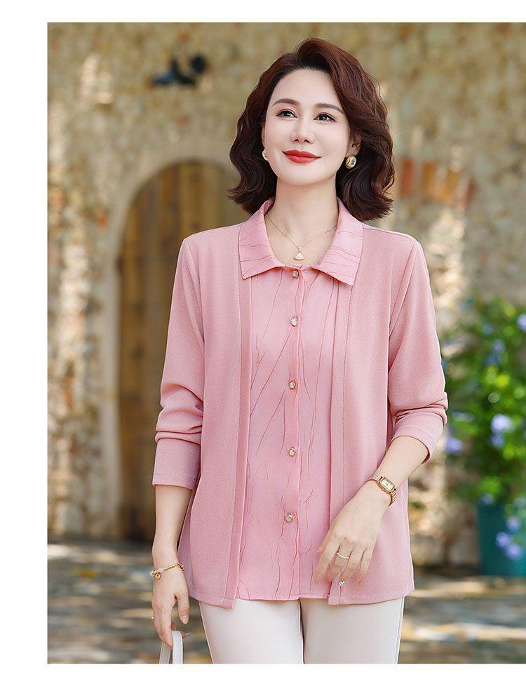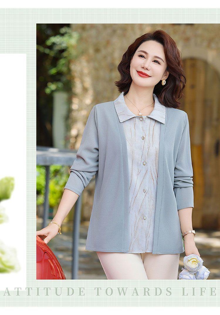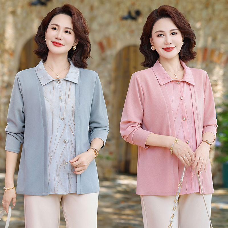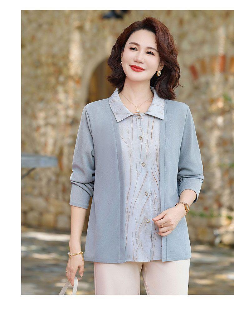 Tops de Otoño Cómodos a la Moda para Mediana Edad y Adultos Mayores Nuevo Versátil Casual Color Sólido Camisa de Mamá Falsa de Dos Piezas
