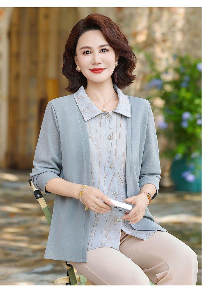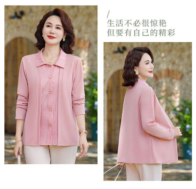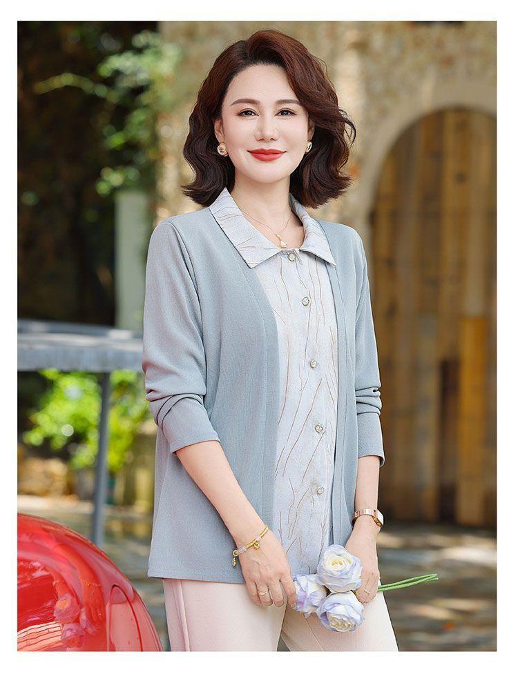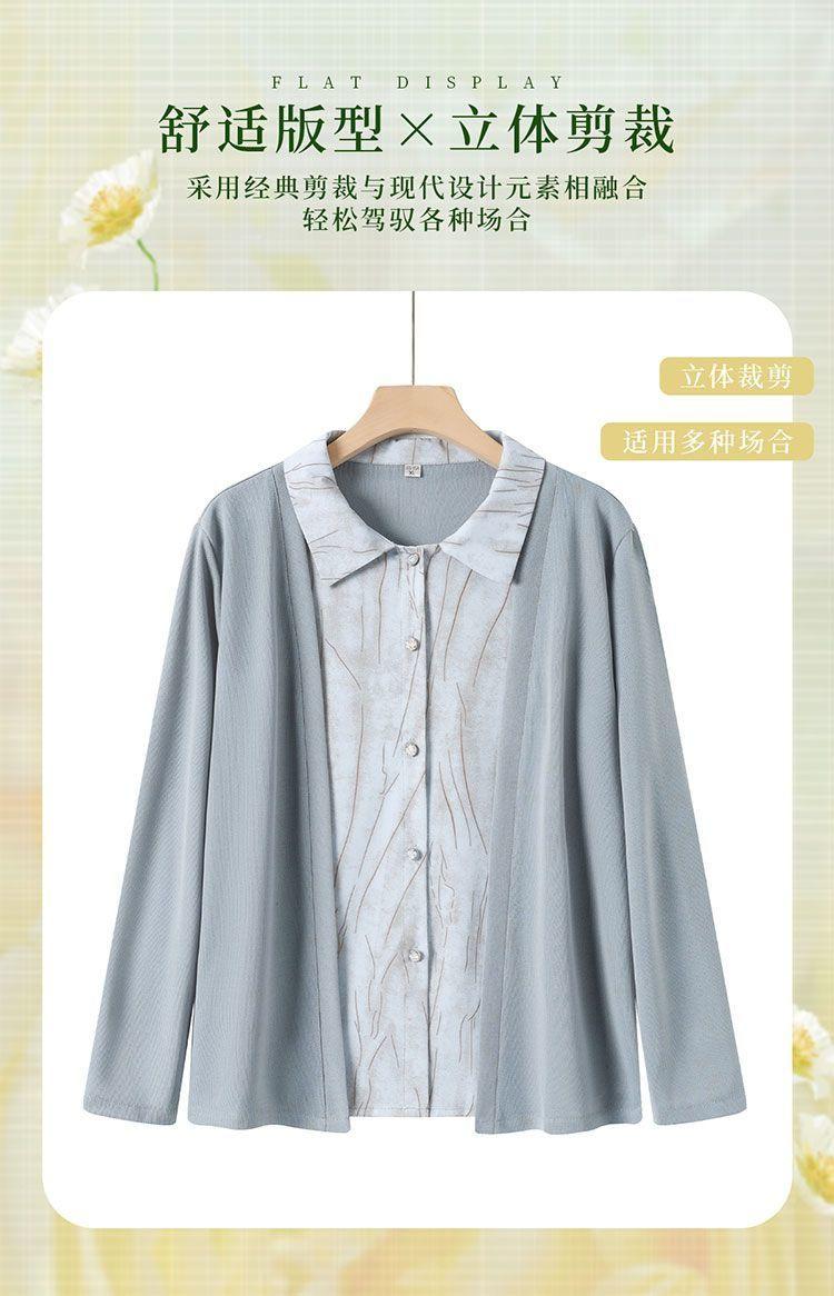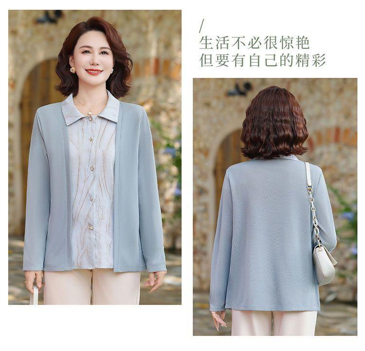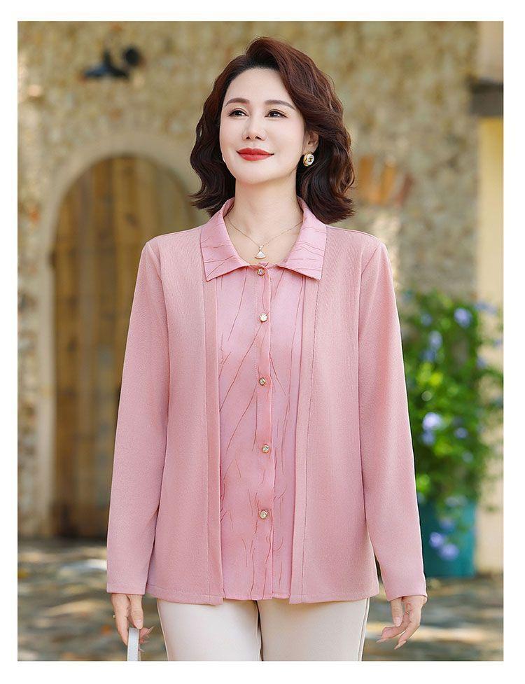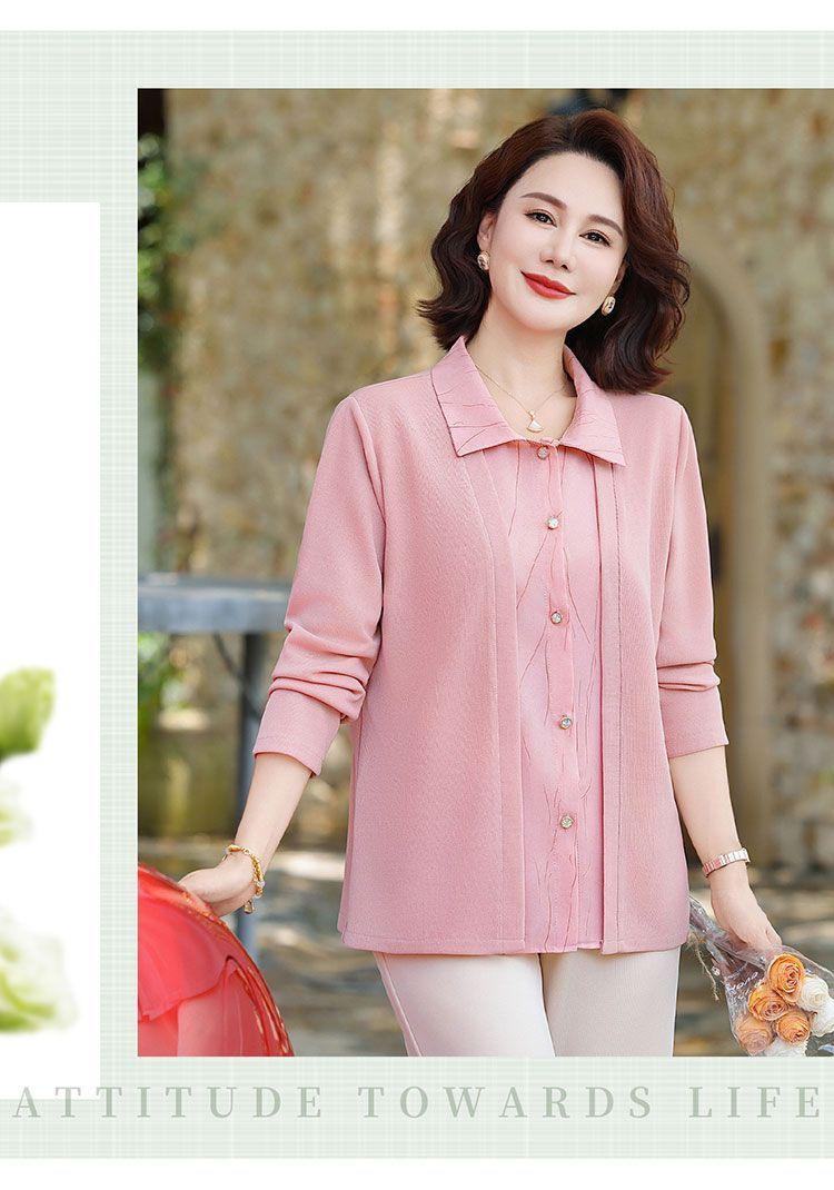 Tops de Otoño Cómodos a la Moda para Mediana Edad y Adultos Mayores Nuevo Versátil Casual Color Sólido Camisa de Mamá Falsa de Dos Piezas