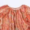 2025 Otoño Nuevo Europeo y Americano Transfronterizo para Mujer Cuello Redondo Estampado Manga Campana Top con Volantes W103 90158