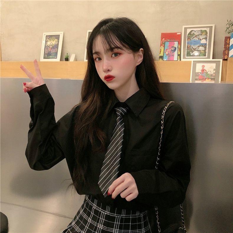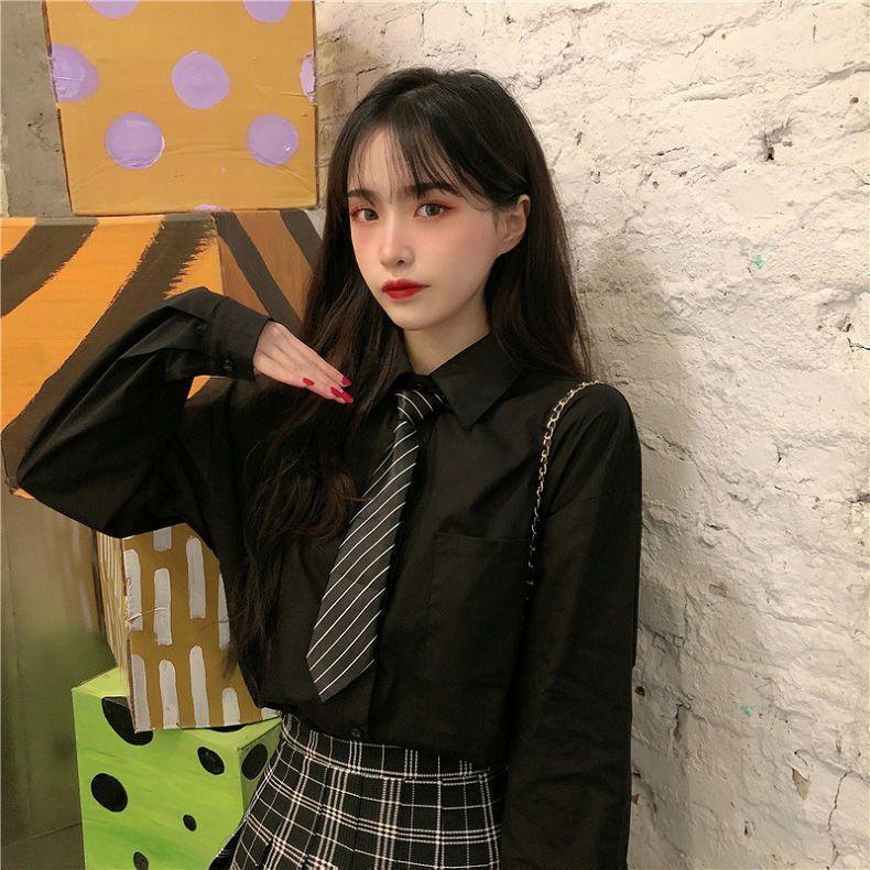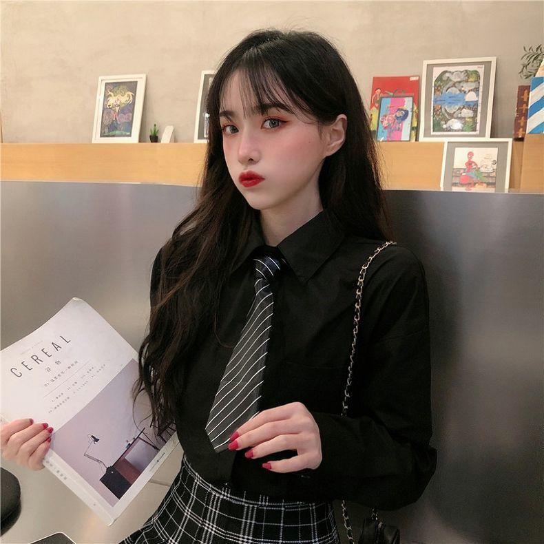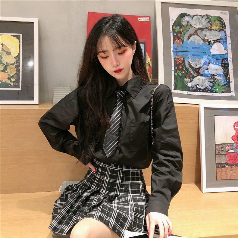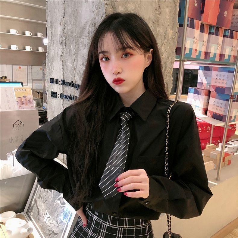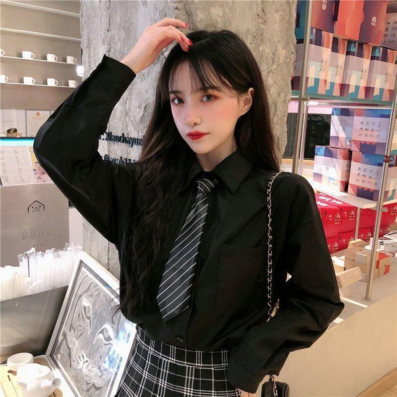 Creamy white long sleeves, Black long sleeves, Milky white long sleeves + black striped tie, Black long sleeve...