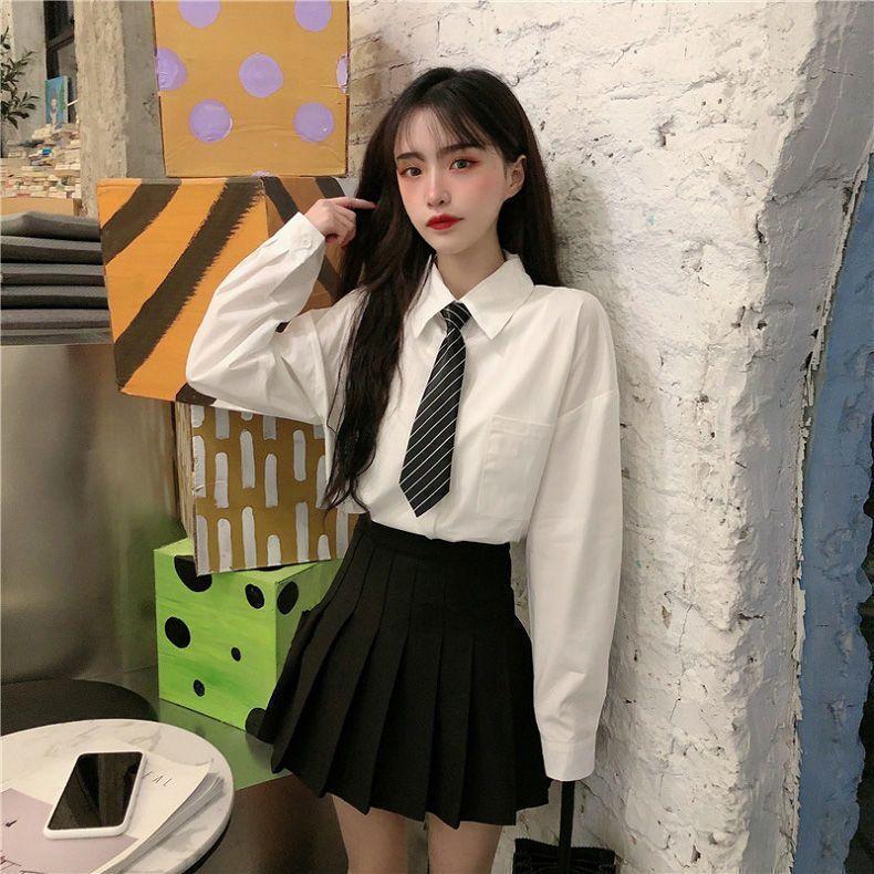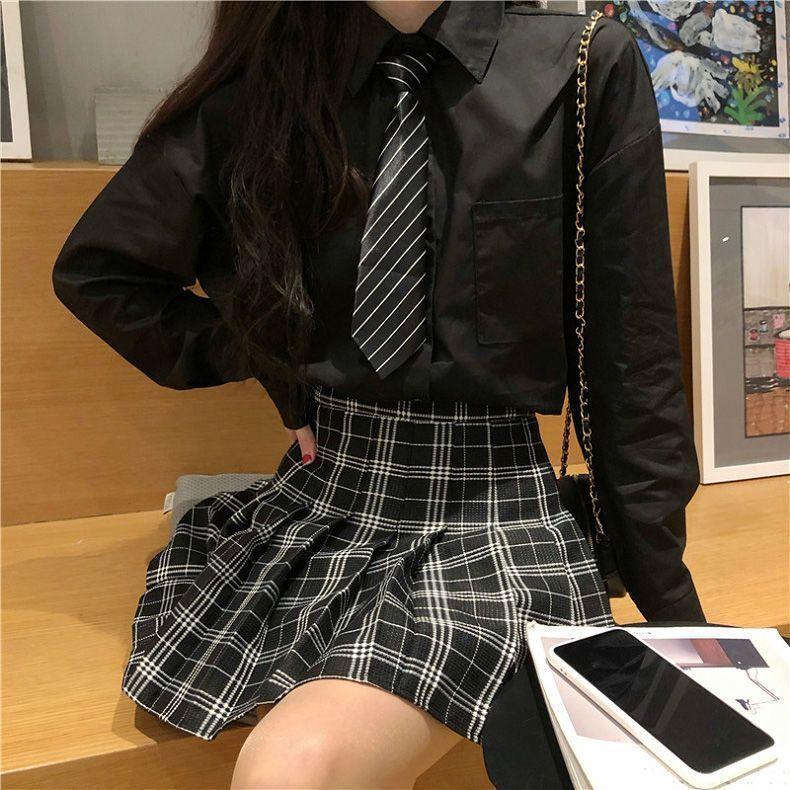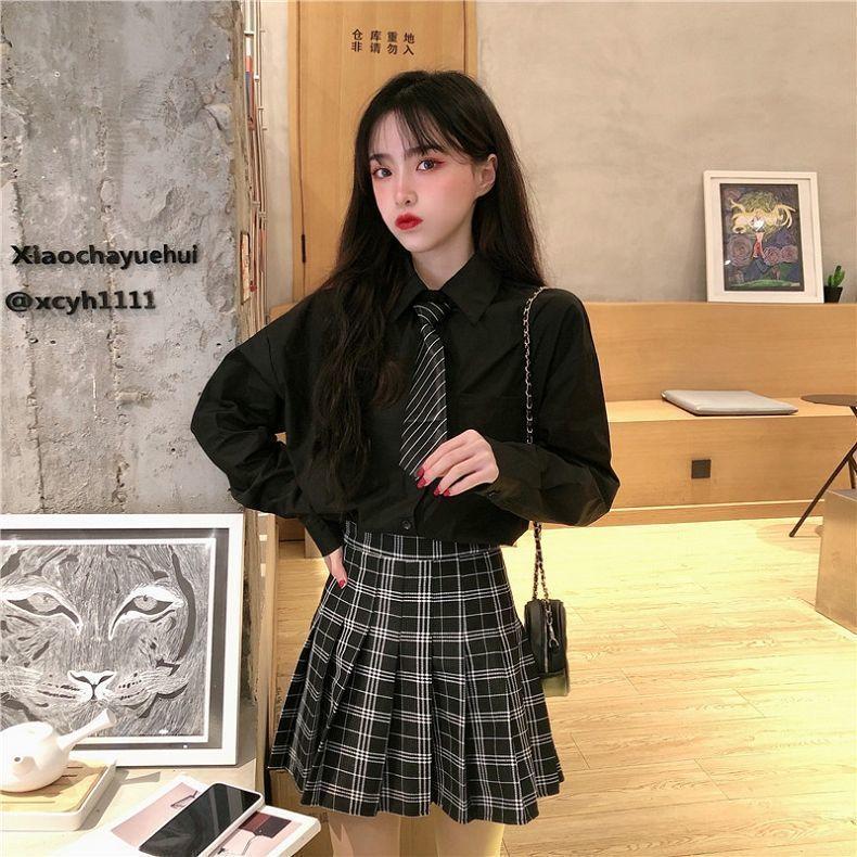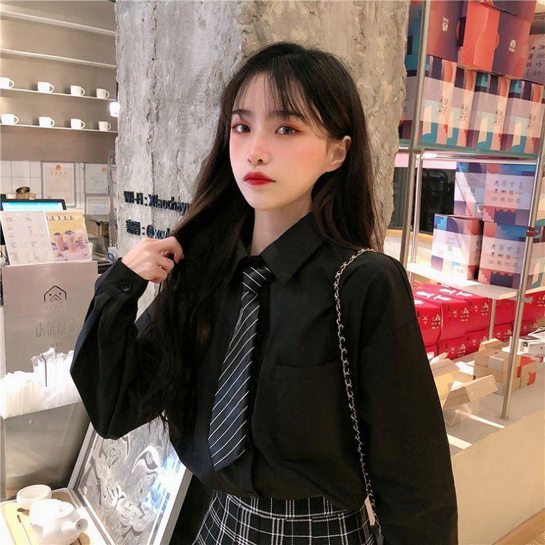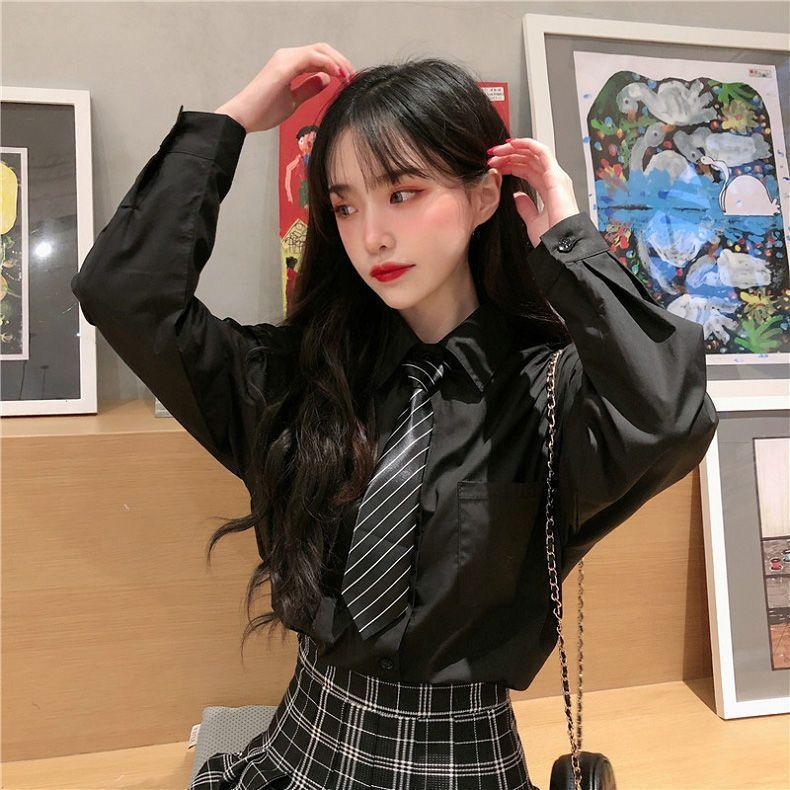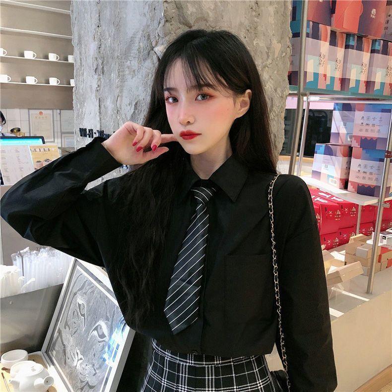 Creamy white long sleeves, Black long sleeves, Milky white long sleeves + black striped tie, Black long sleeve...