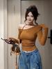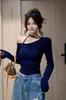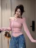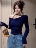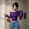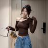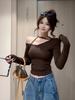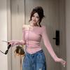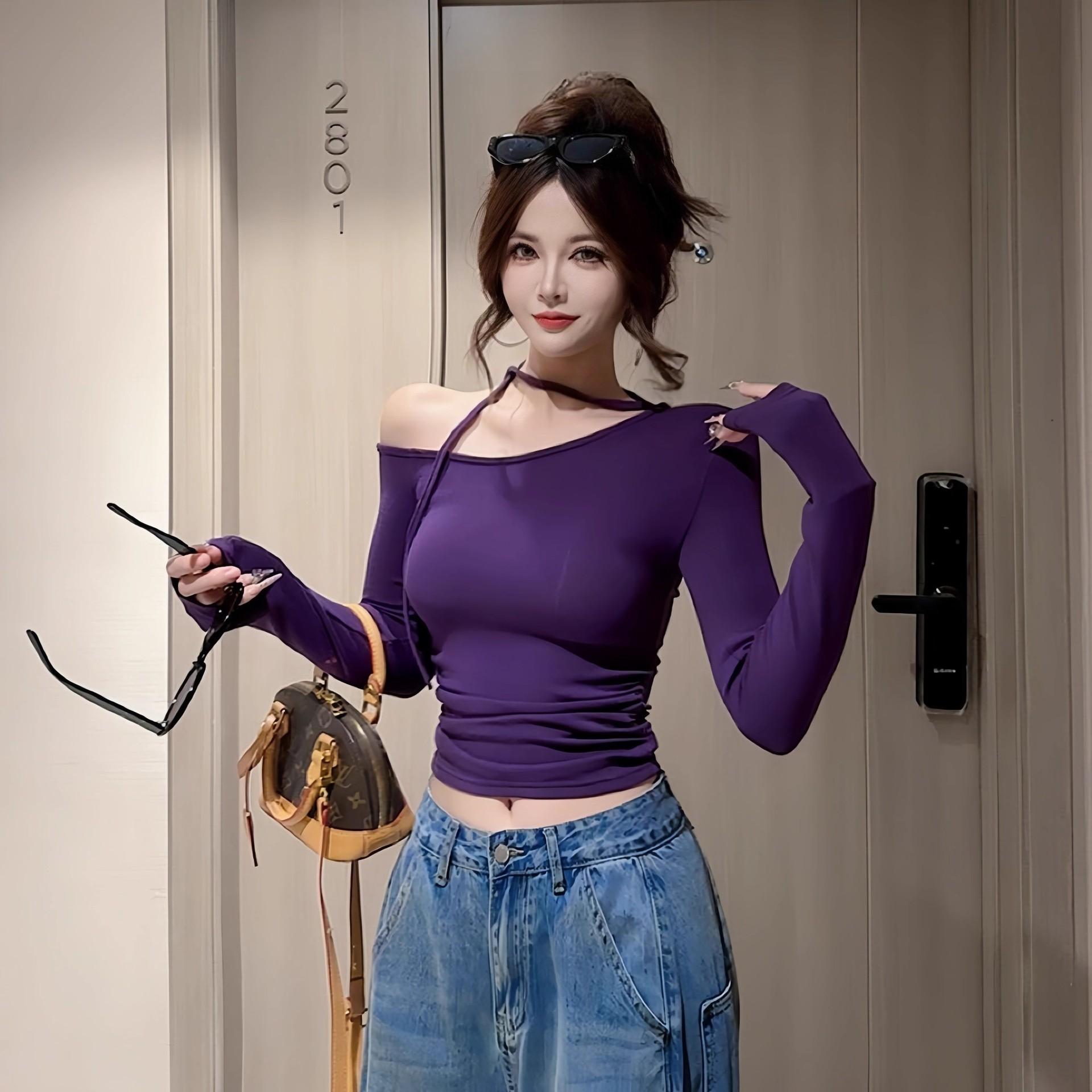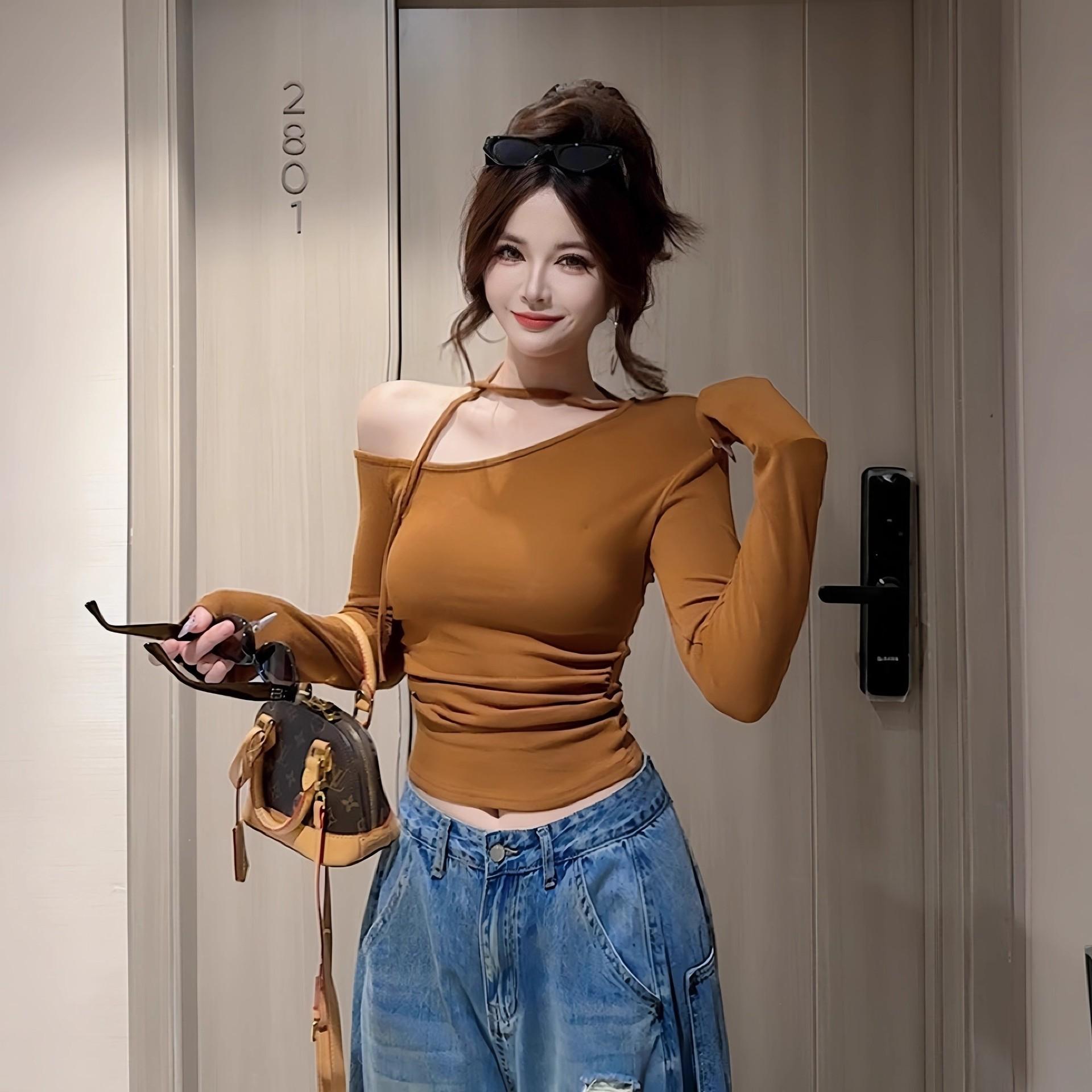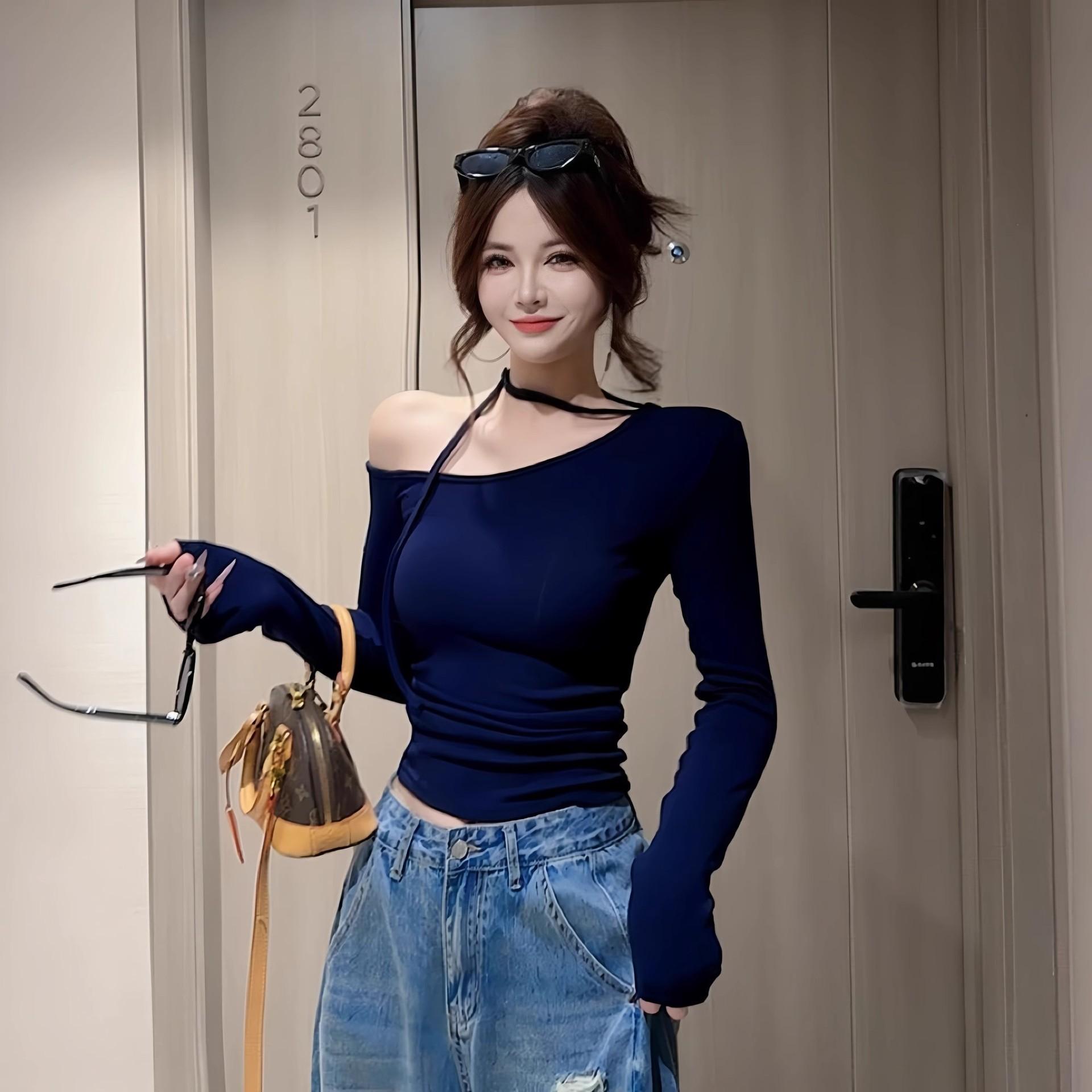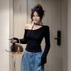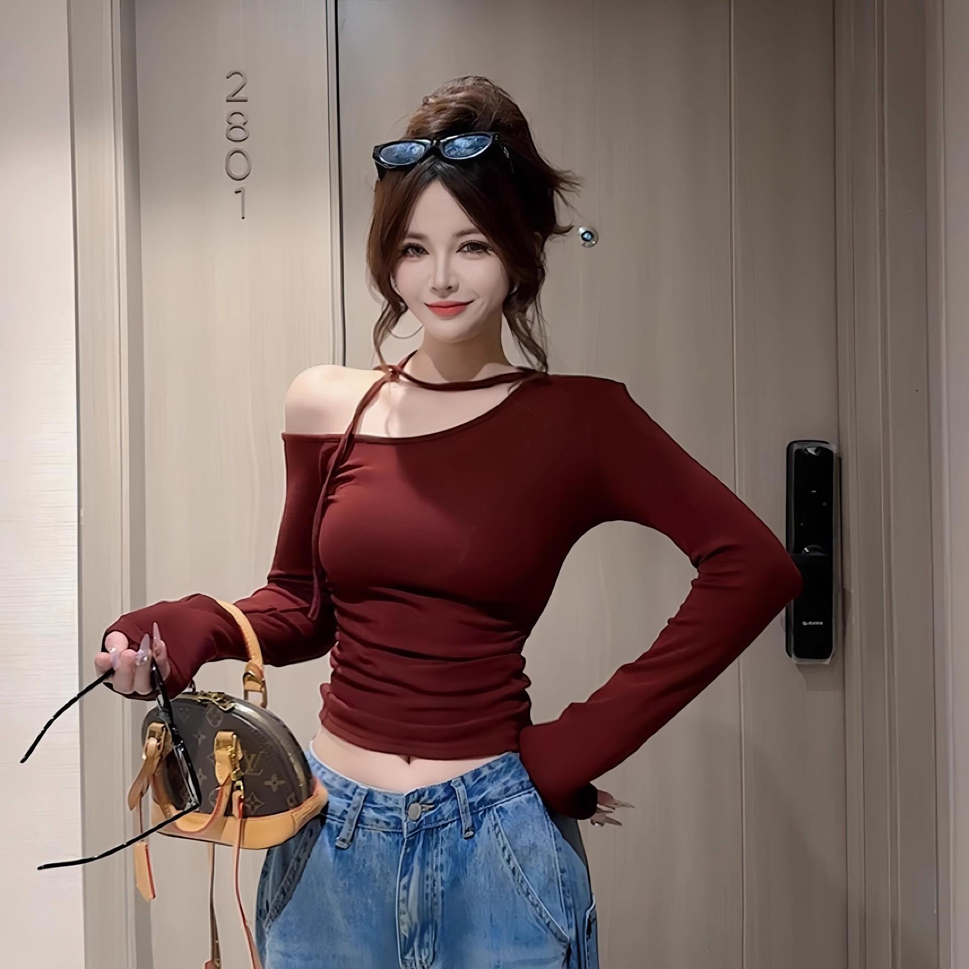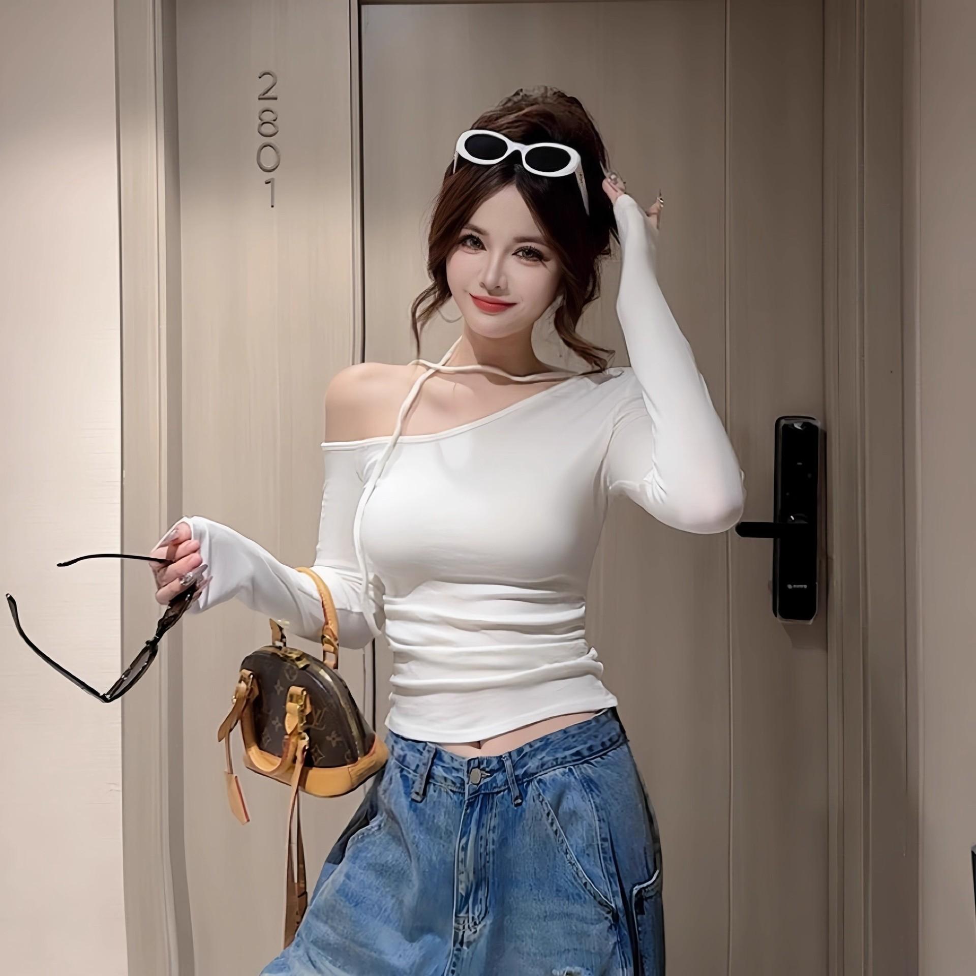 Camiseta de manga larga con un hombro descubierto para chica caliente pura y sexy, nueva para principios de otoño, ajustada y favorecedora de la figura, top básico sexy con lazo para mujer