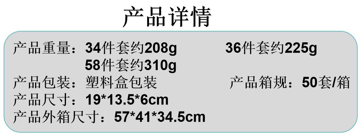 Juego de 55 piezas: Cada juego pesa aproximadamente 210 g en una caja de plástico, el tamaño del producto es 23.5*16*4cm, 50 juegos por caja, el tamaño de la caja exterior es 49.41.42cm