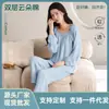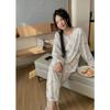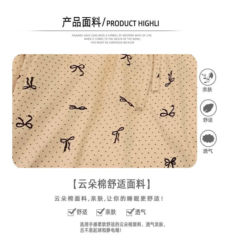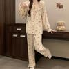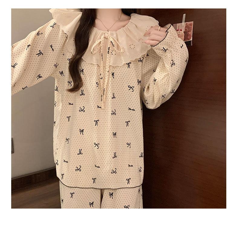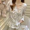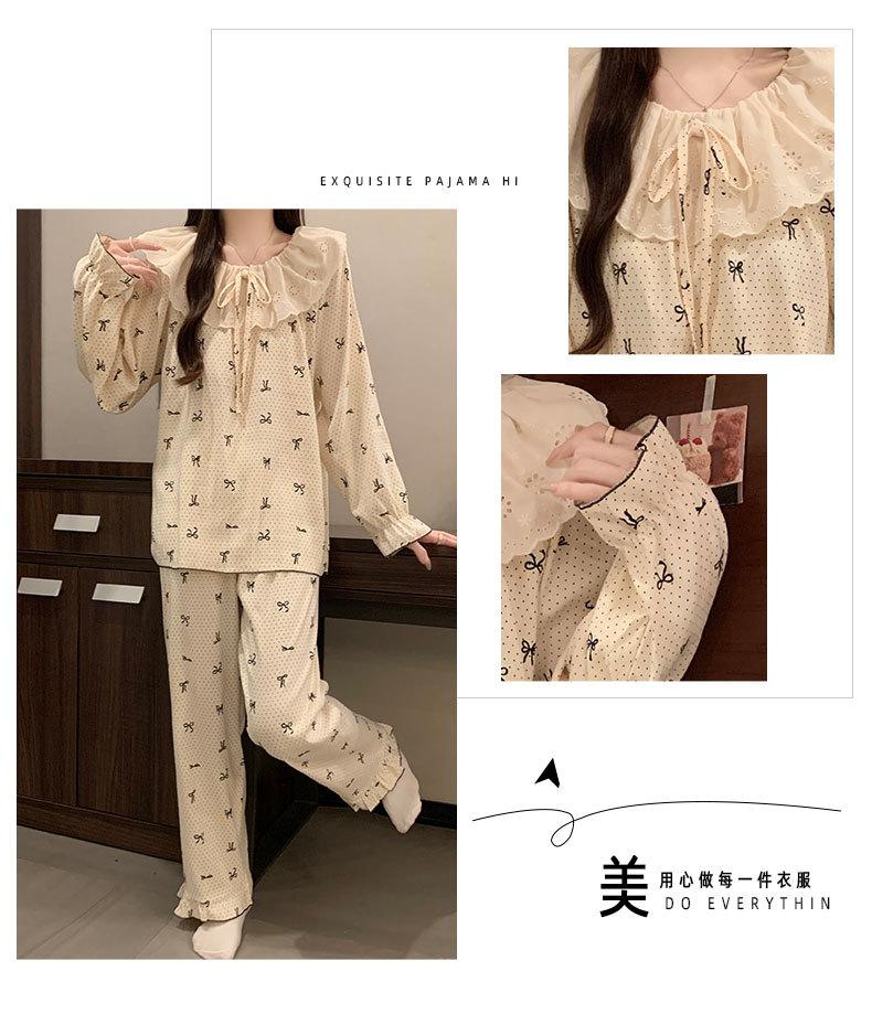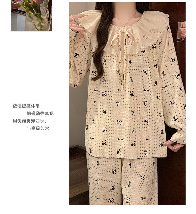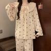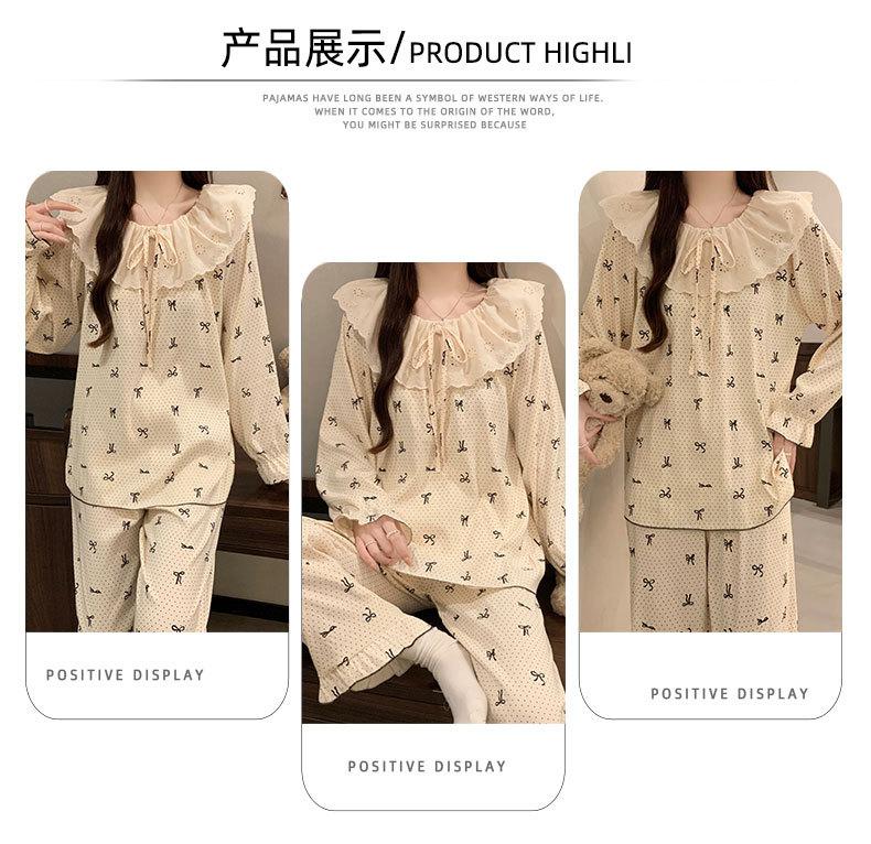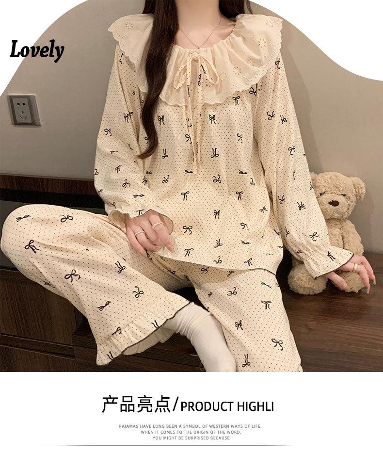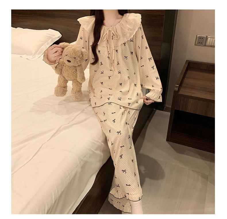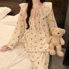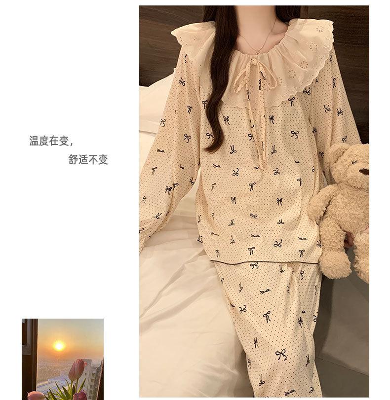 Pijama de Algodón Nube para Mujer Primavera y Otoño Estilo Coreano Dulce Encaje Lazo Manga Larga Pantalón Largo Dulce y Encantador Ropa para el Hogar