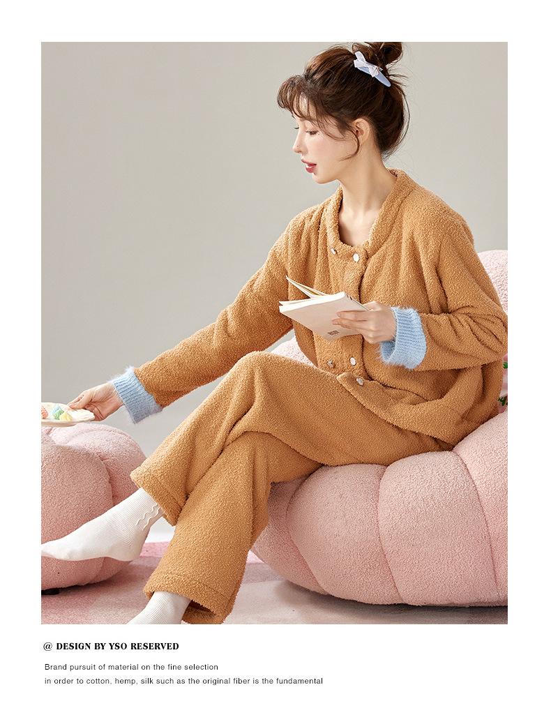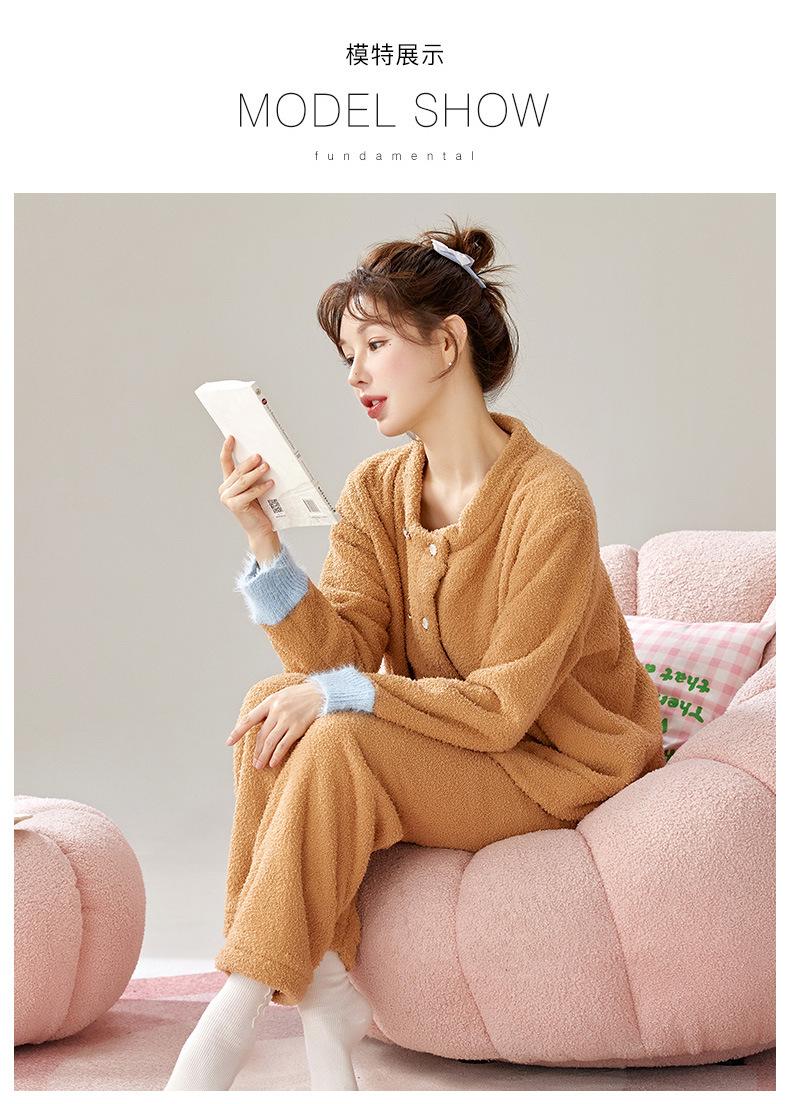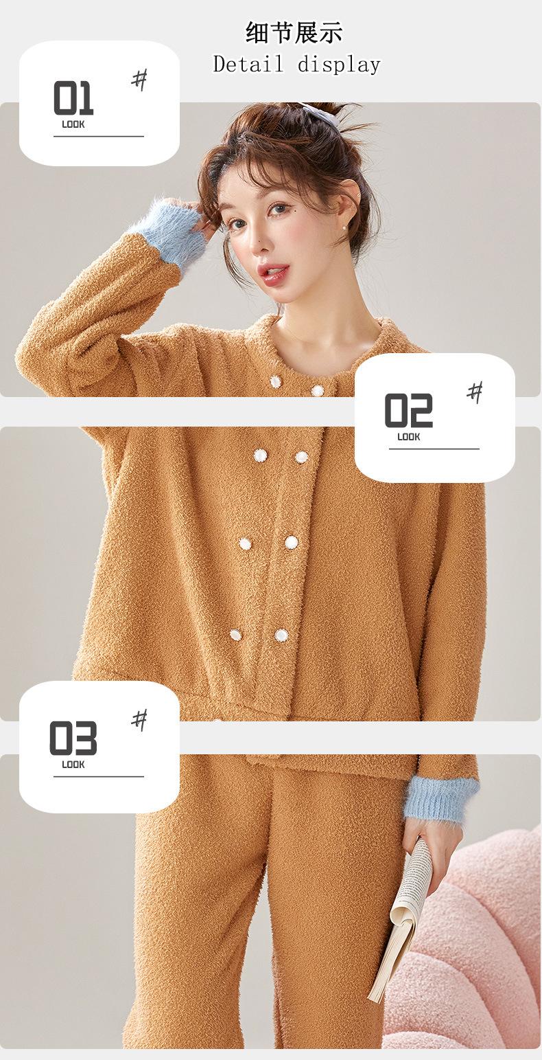 Pijama de Terciopelo Medio para Mujer Otoño e Invierno Doble Botonadura Forrado de Felpa Camello Grueso Terciopelo Coral Cálido Traje de Ropa para el Hogar