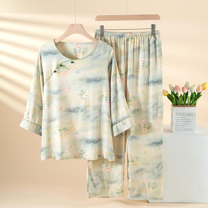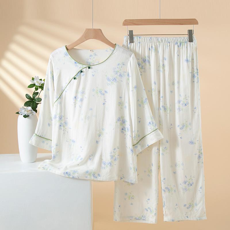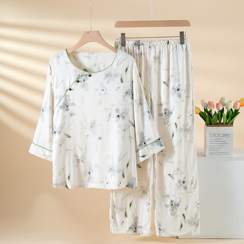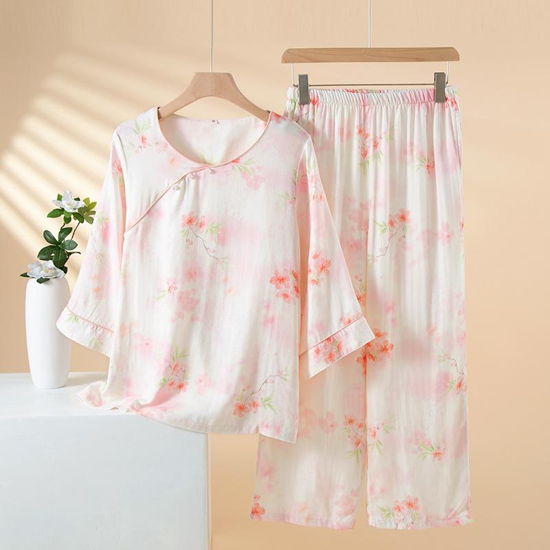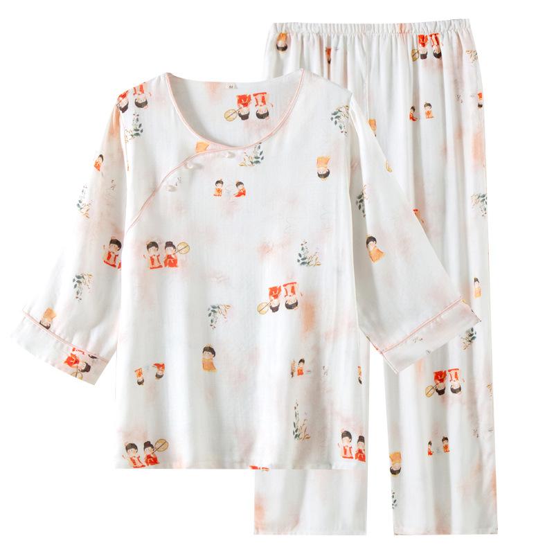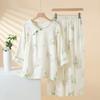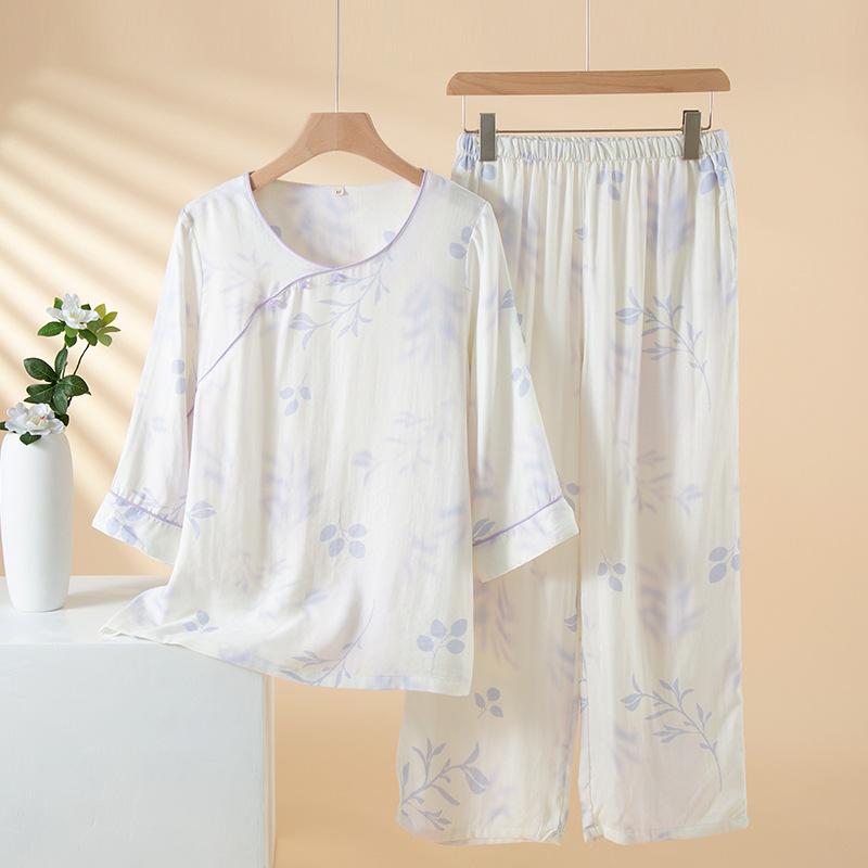 Compra Pijama de Fibra de Bambú Estilo Chino para Mujer Primavera y Verano Delgada Pantalón de Manga Larga Cuello Redondo Pulóver de Algodón Transpirable Traje para Estar en Casa Otoño al por mayor en Joom.pro