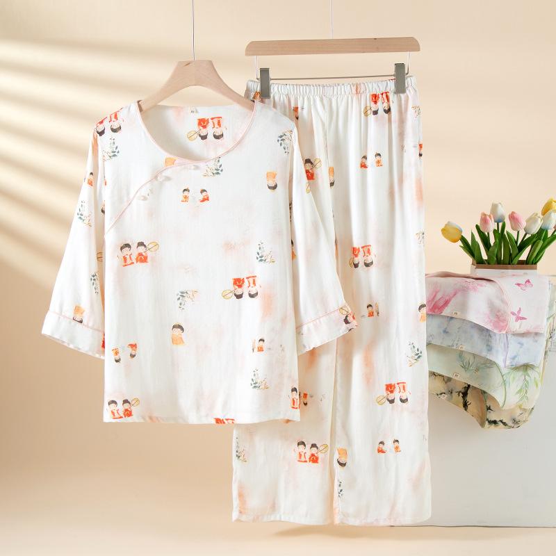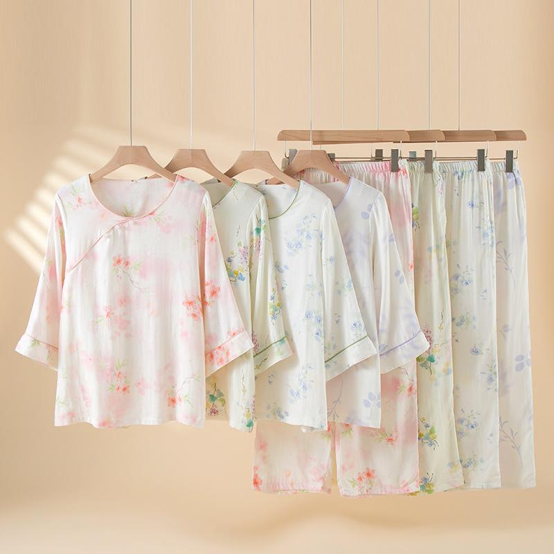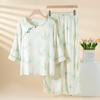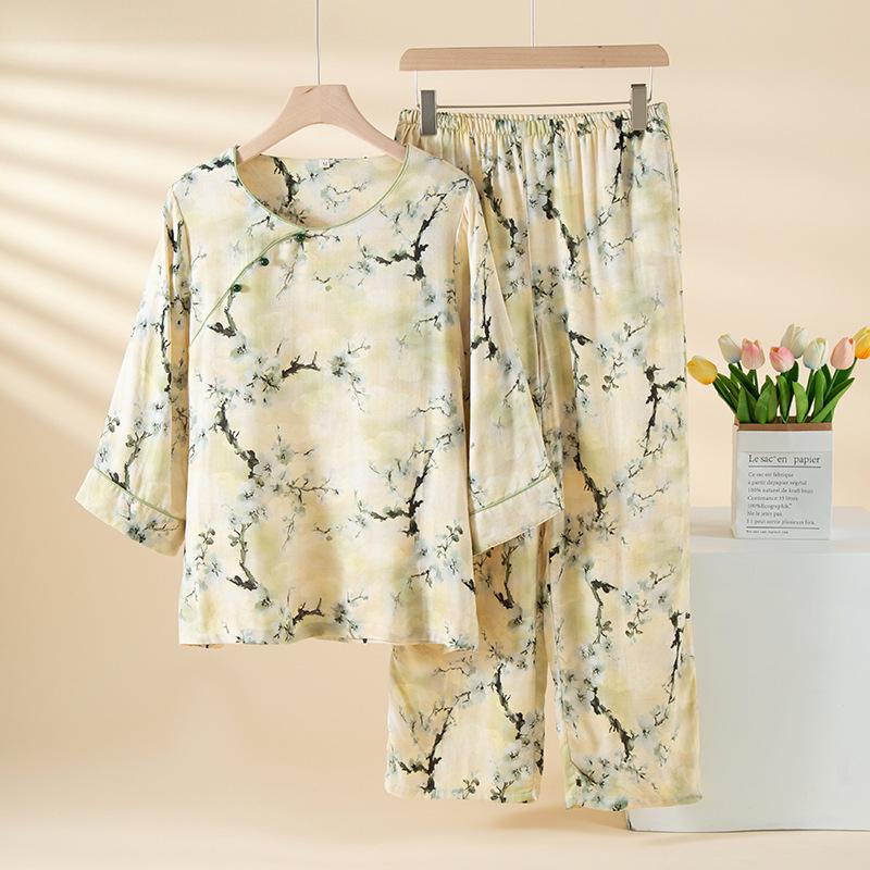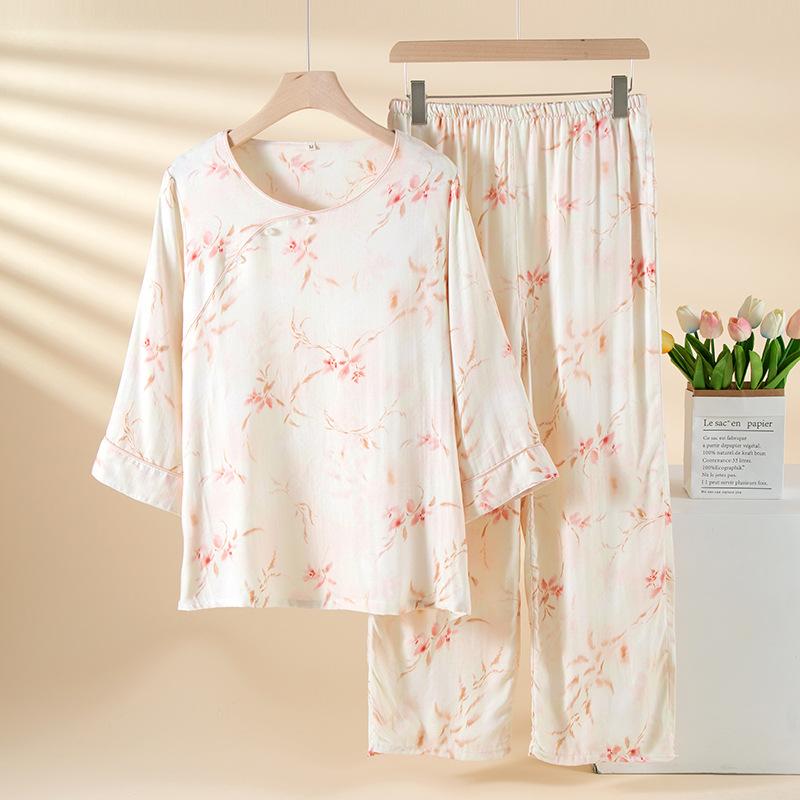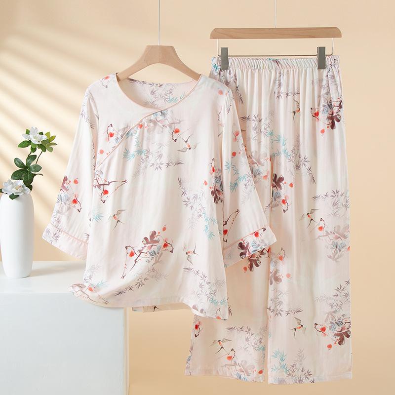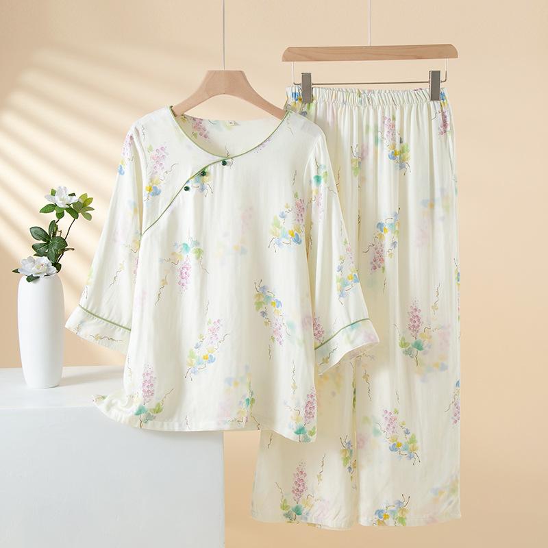 Compra Pijama de Fibra de Bambú Estilo Chino para Mujer Primavera y Verano Delgada Pantalón de Manga Larga Cuello Redondo Pulóver de Algodón Transpirable Traje para Estar en Casa Otoño al por mayor en Joom.pro