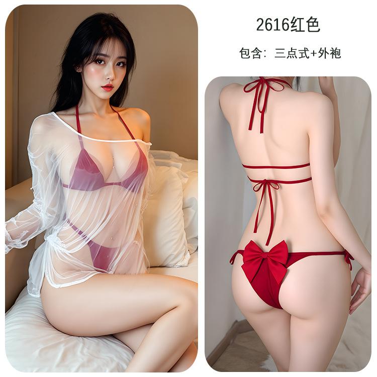 Lencería Sexy de Noche Larga Blusa de Malla Sexy de Tres Puntos para Mujer Bikini Tentación Caliente Pijama Gratis 2616