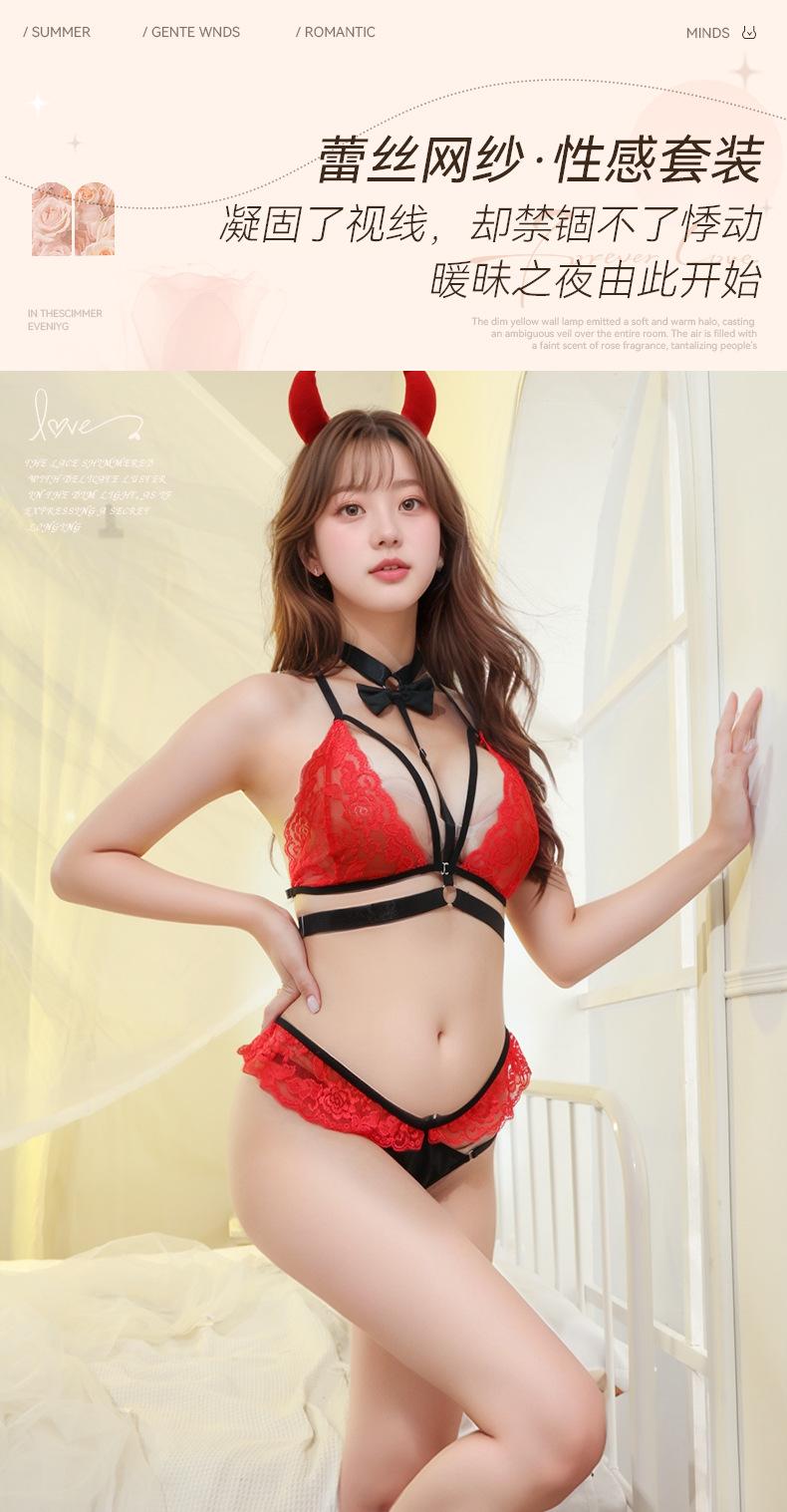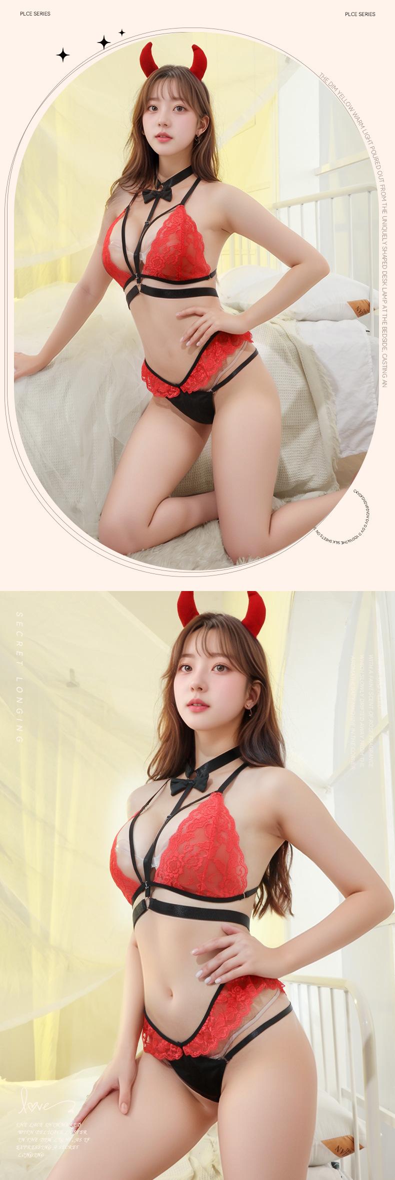 Lencería Sexy Mujer Halter Encaje Tres Puntos Encaje Sujetador Ropa de Dormir Panties Transparentes Tentación Bikini Fino 0910