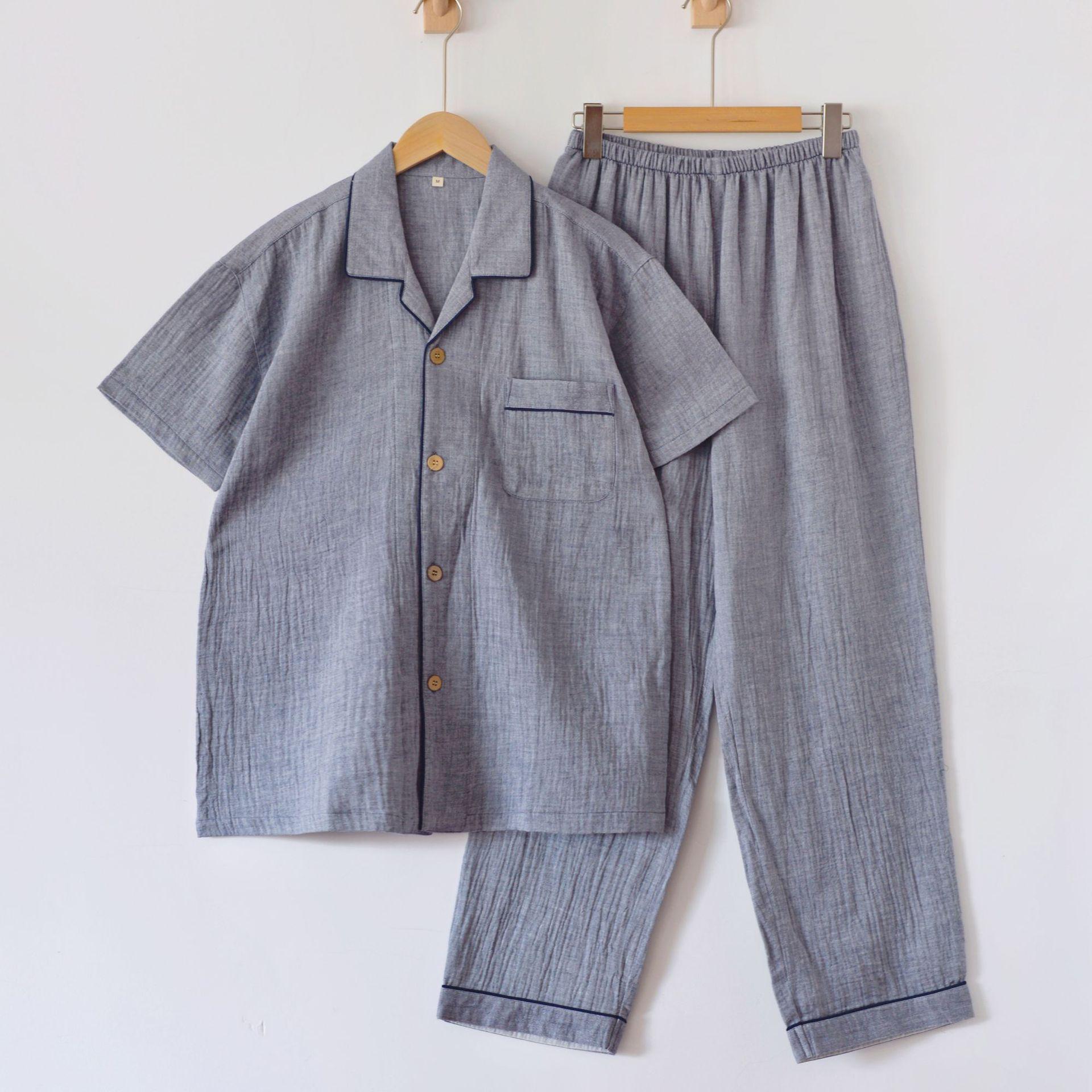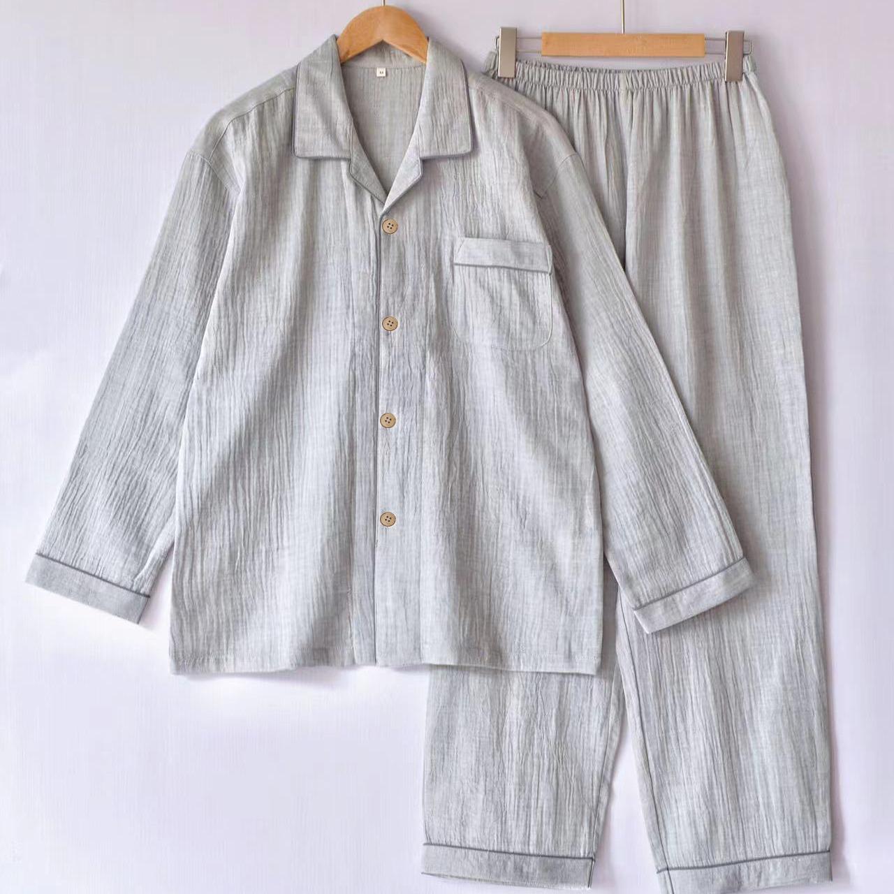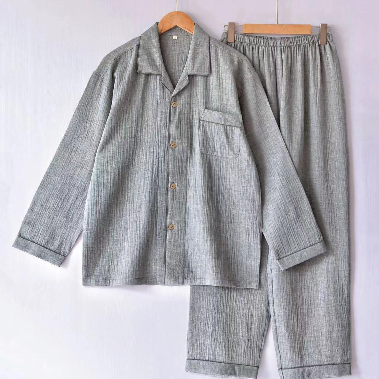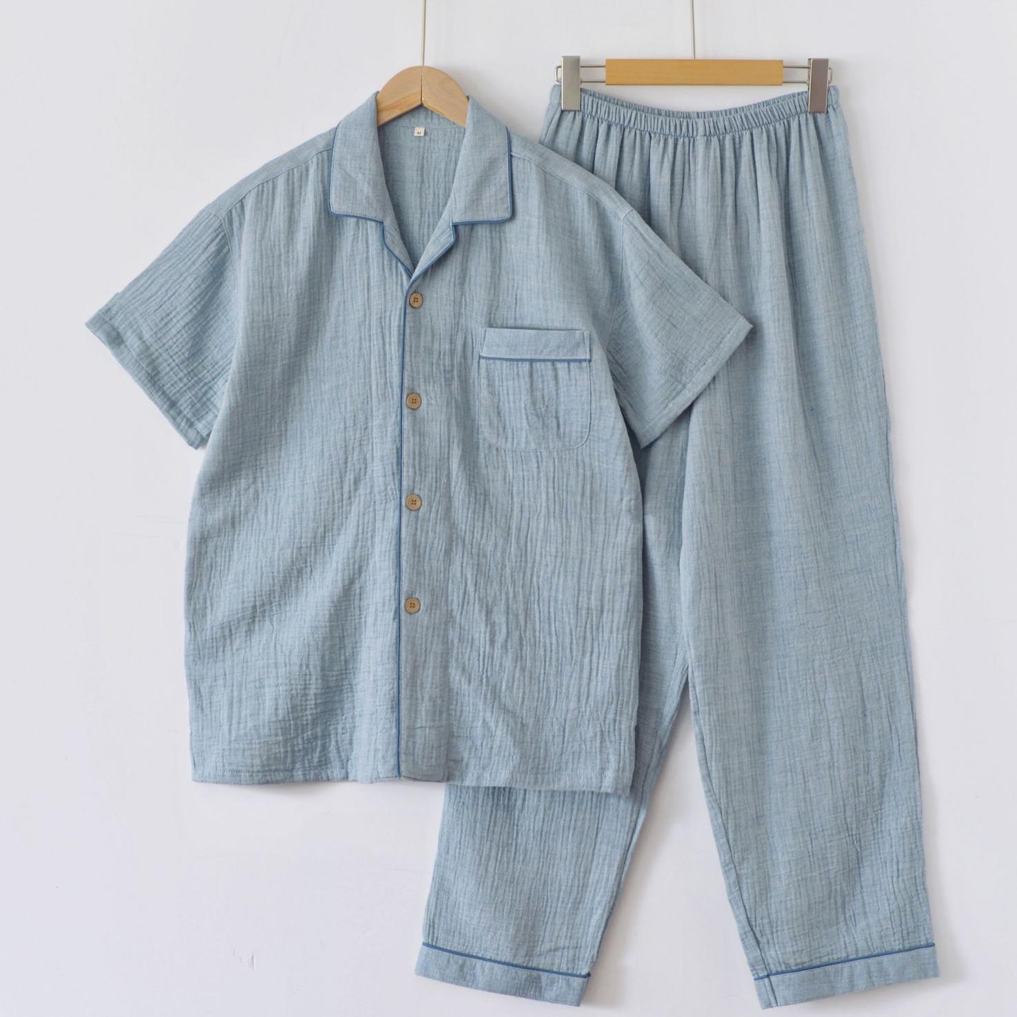 Pijama de Algodón de Gasa Crepé de Doble Capa para Primavera y Otoño, Estilo Japonés Simple para Hombre, de Manga Larga y Manga Corta, Conjunto de Algodón Puro para Estar en Casa