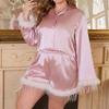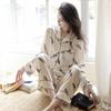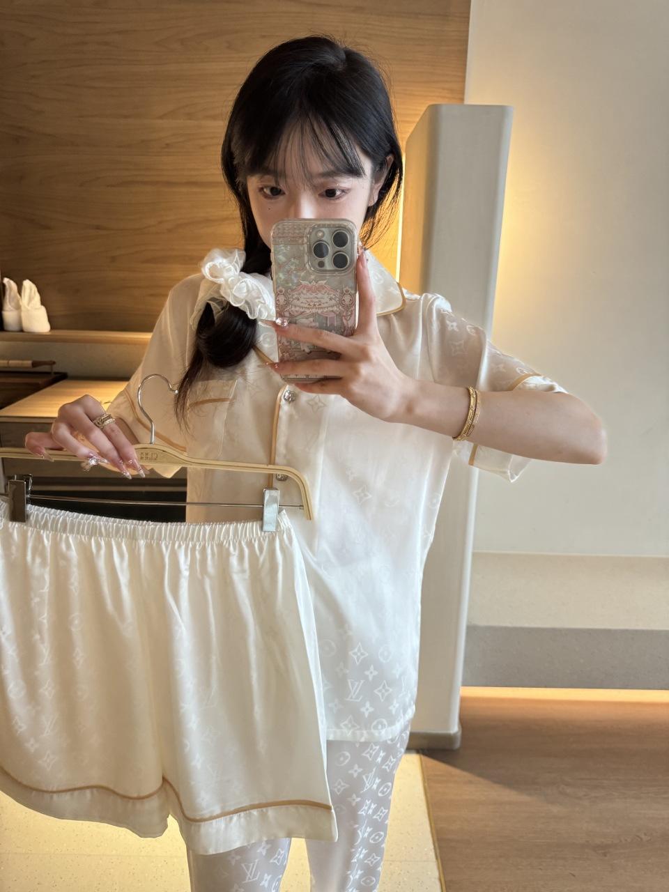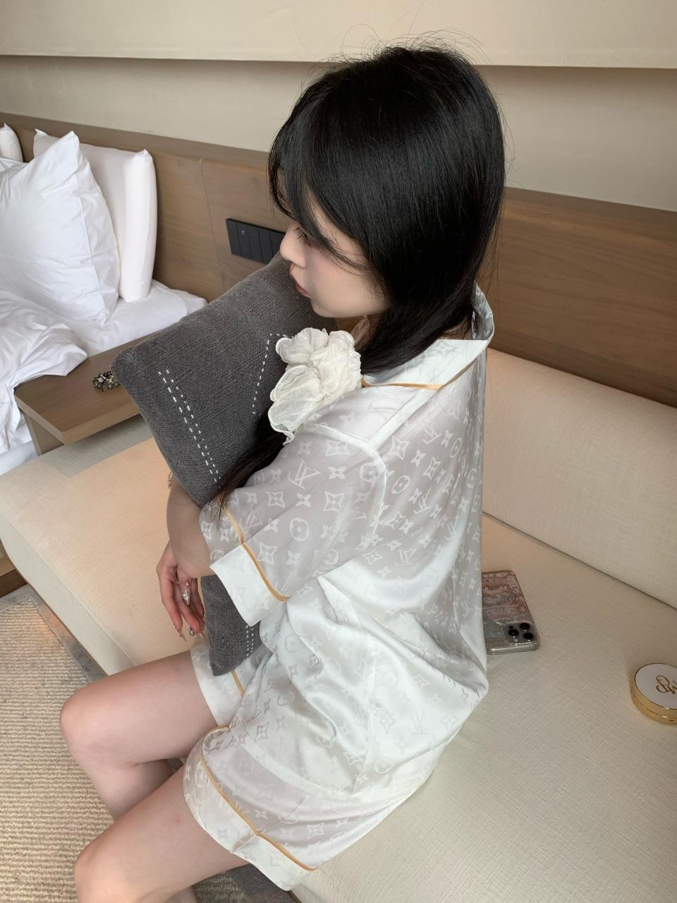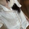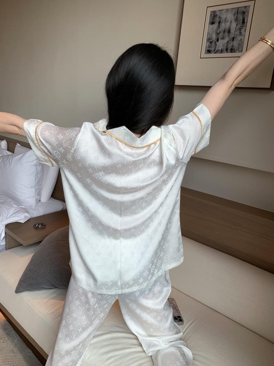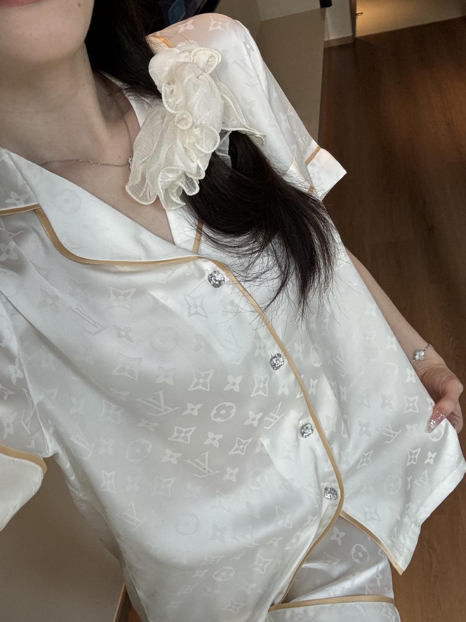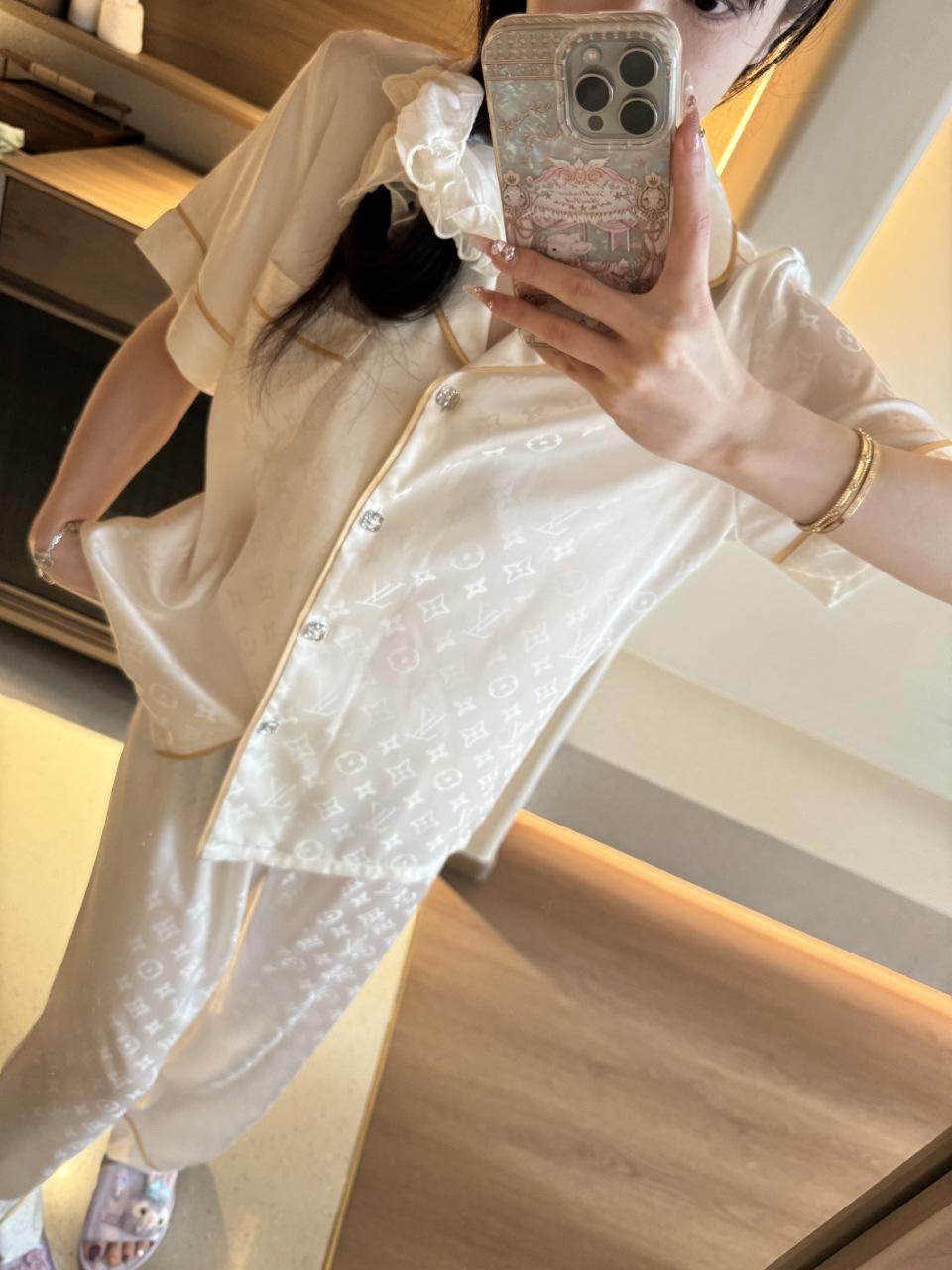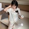 2025 Pijama Nuevo de Seda de Hielo para Mujer Blanco Estampado Delgado Manga Corta Pantalón Largo Conjunto de Tres Piezas Conjunto de Ropa para el Hogar de Lujo Ligero