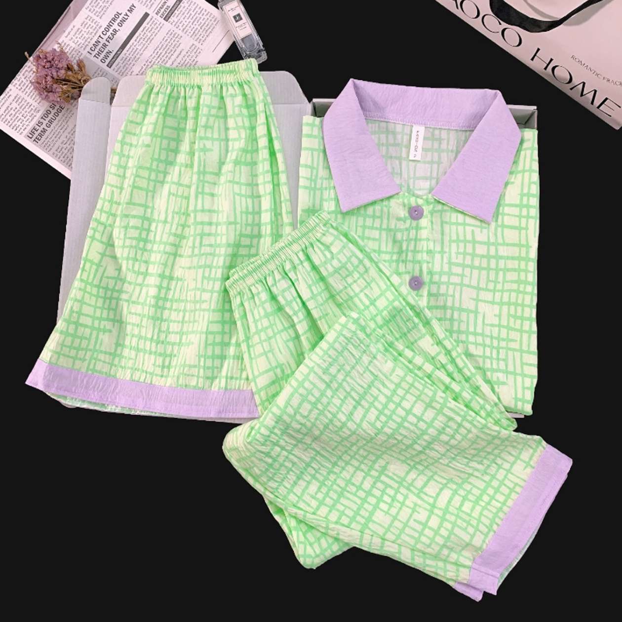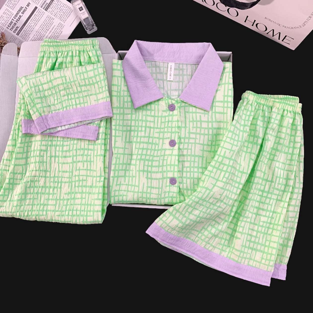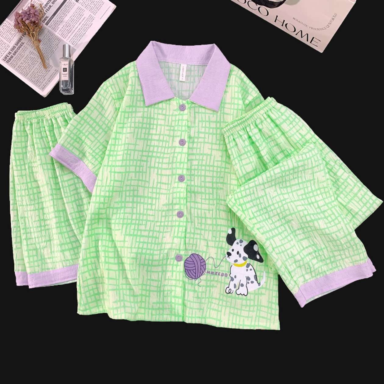 Pijama Dálmata de Bloques de Color para Mujer, Conjunto de Tres Piezas, Algodón Nube, Manga Corta, Shorts, Pantalón Largo, Lindo Conjunto para Estar en Casa